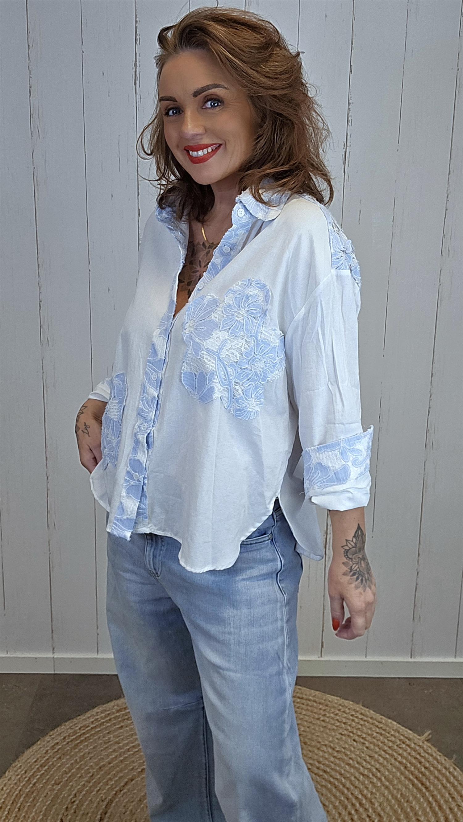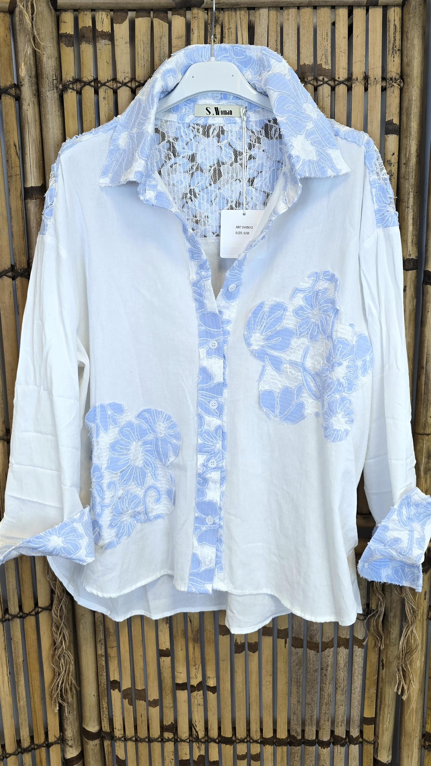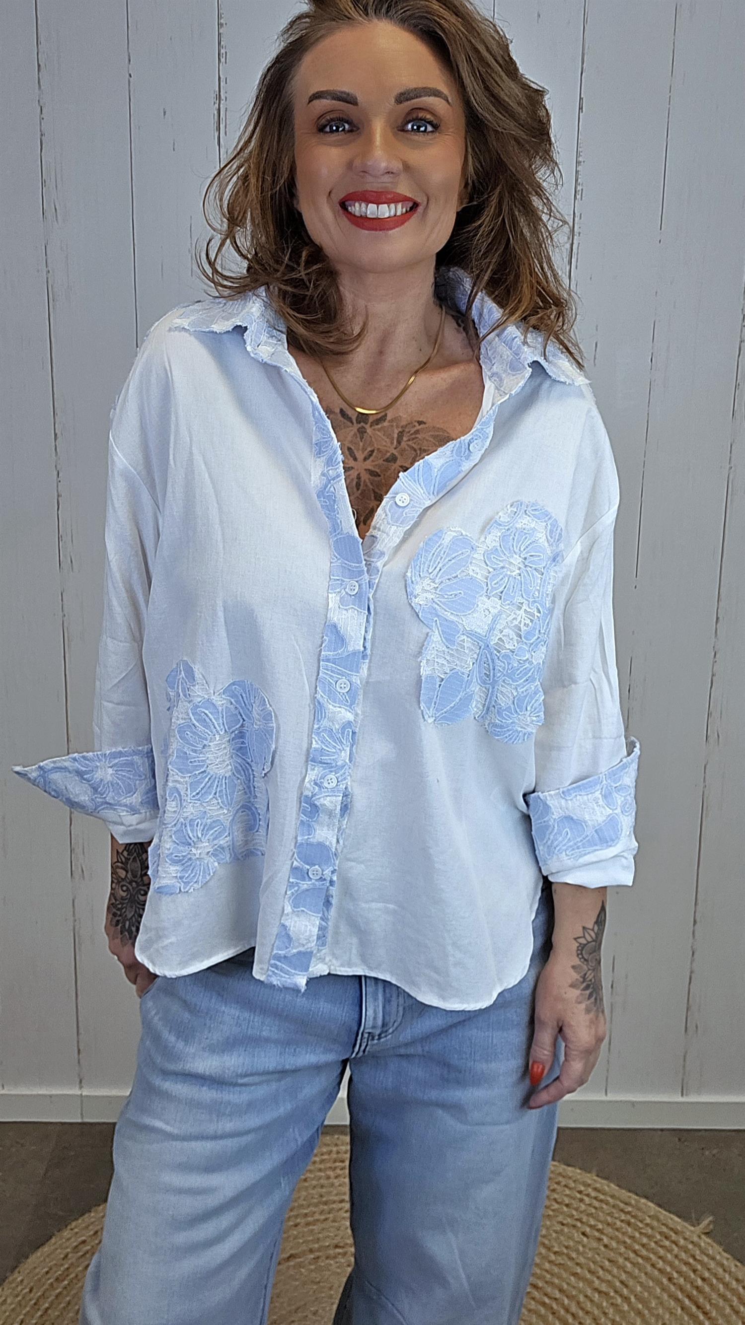 Lekker bomullsskjorte med påsydde blondedetaljer som gir et romantisk og gjennomført uttrykk. Skjorten har vakkert blåblomstret stoff på kragen, i blondene og på ryggen, som skaper en fin helhet. Knappestolpen i front er også i samme blonde-/blomstermateriale. Modellen har en avslappet passform og faller pent på kroppen – like fin til hverdags som til mer pyntede anledninger.