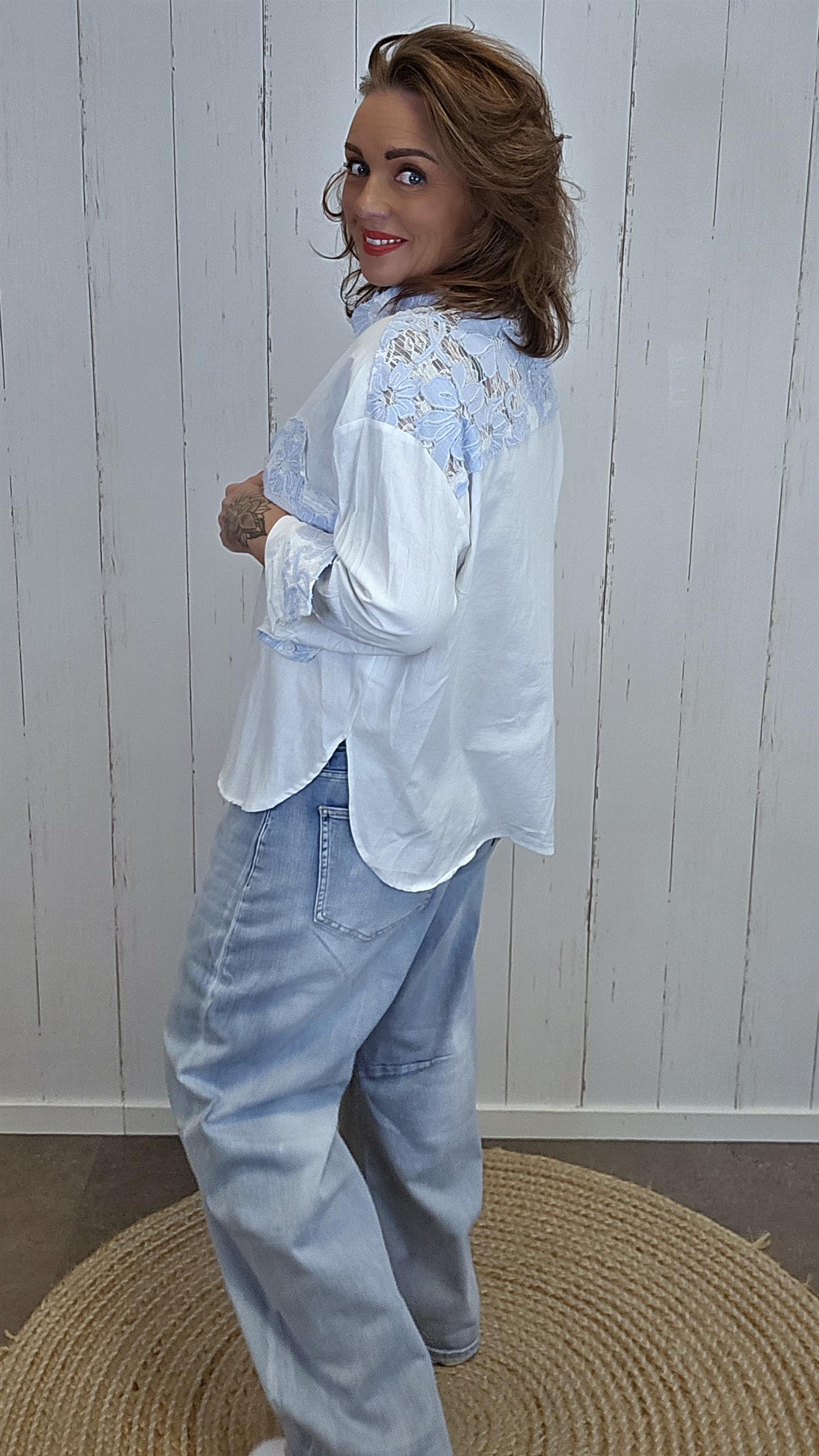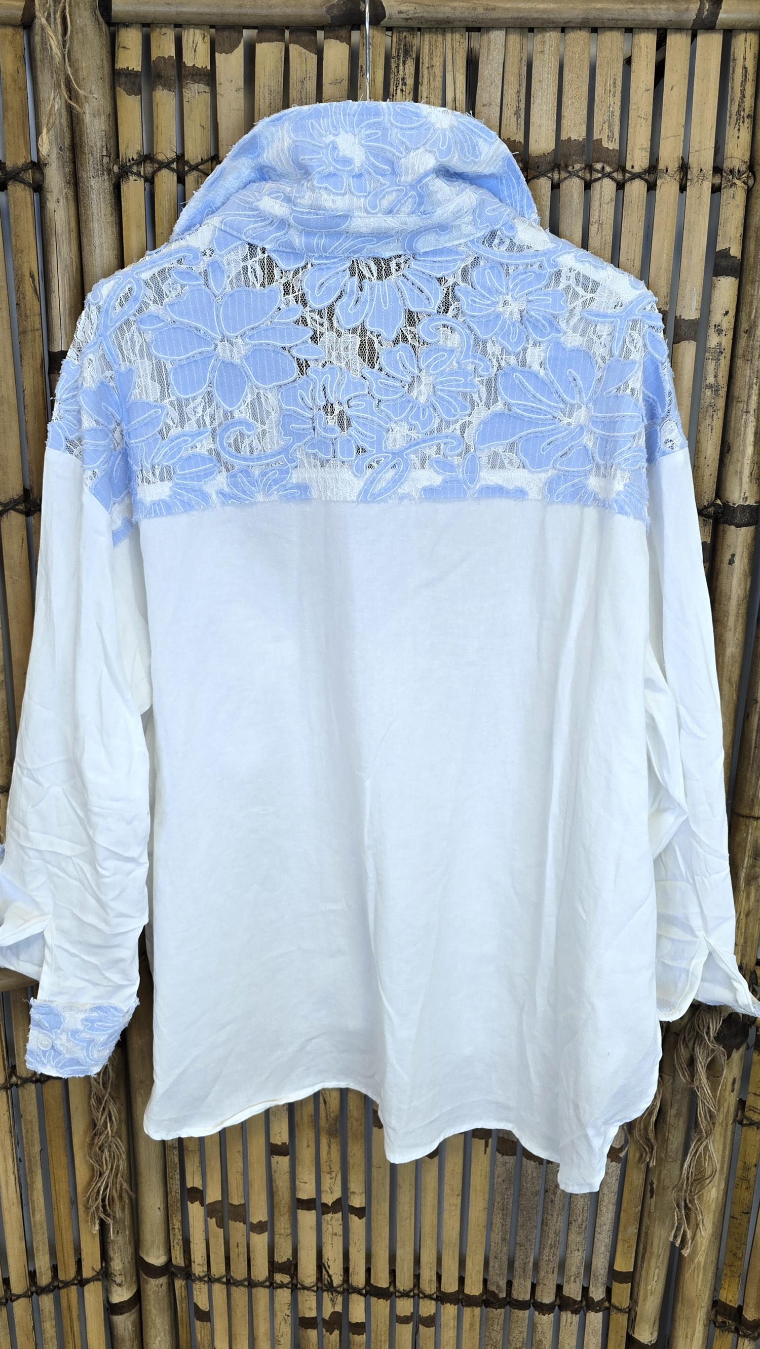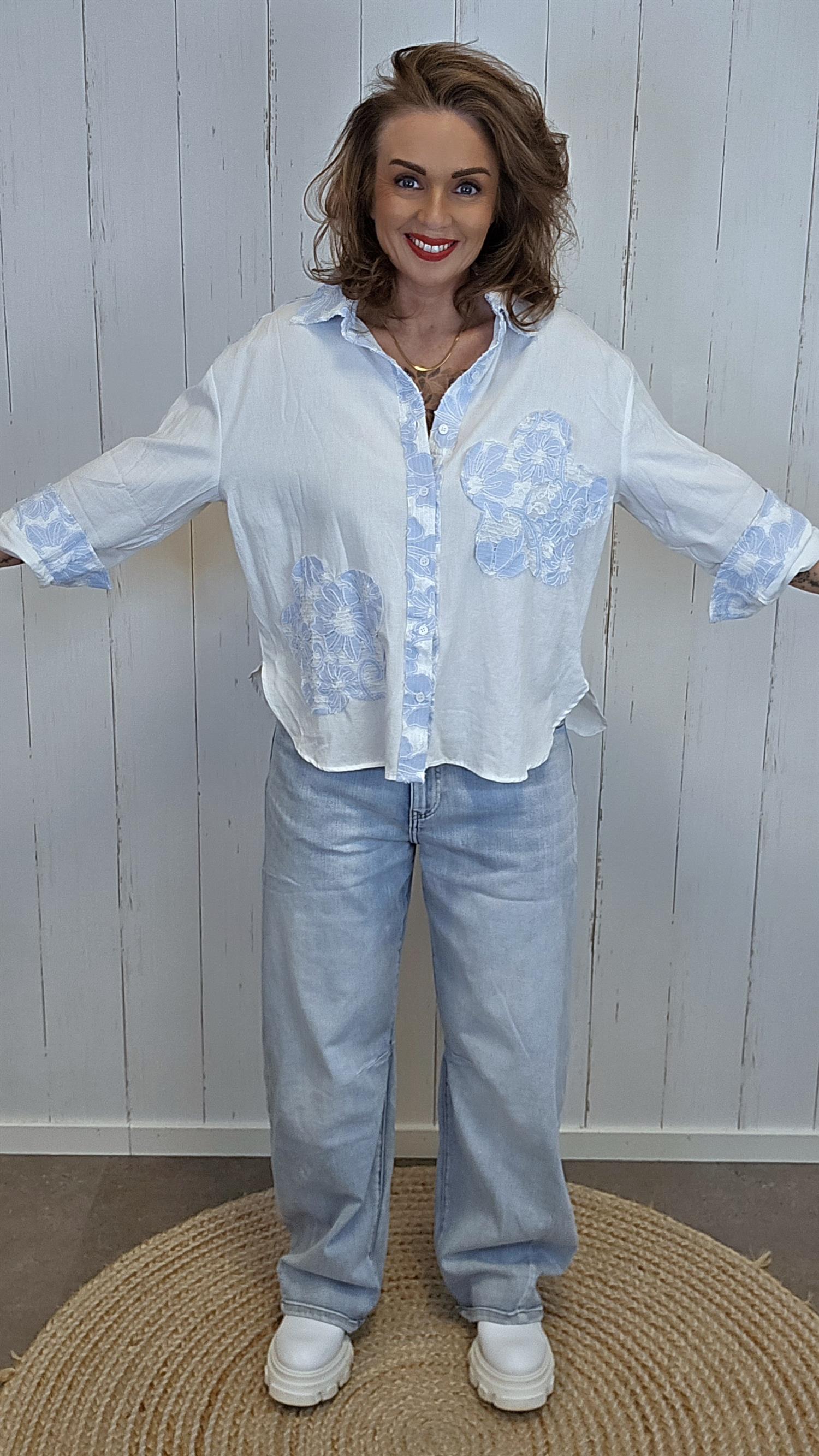 Lekker bomullsskjorte med påsydde blondedetaljer som gir et romantisk og gjennomført uttrykk. Skjorten har vakkert blåblomstret stoff på kragen, i blondene og på ryggen, som skaper en fin helhet. Knappestolpen i front er også i samme blonde-/blomstermateriale. Modellen har en avslappet passform og faller pent på kroppen – like fin til hverdags som til mer pyntede anledninger.
