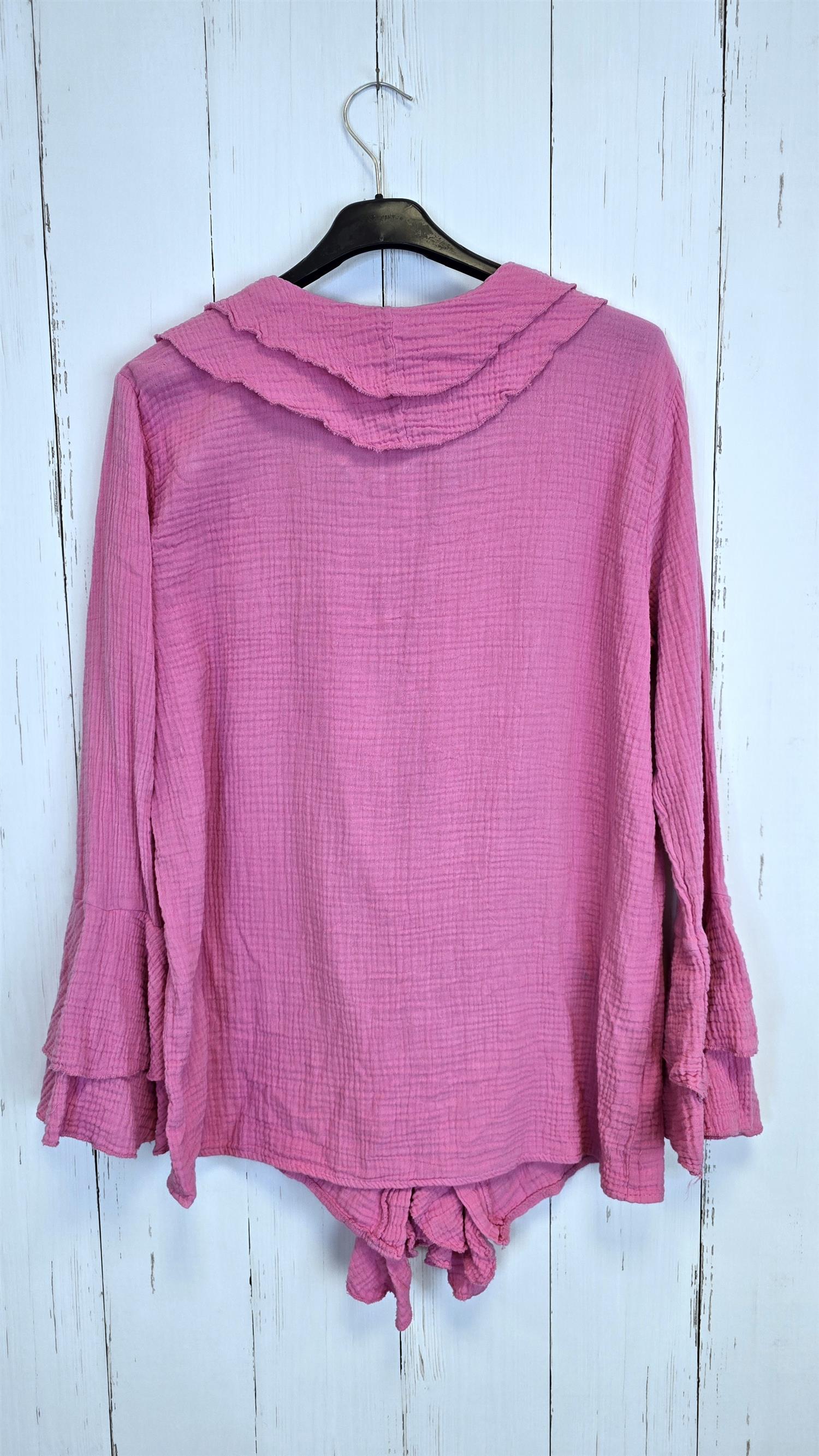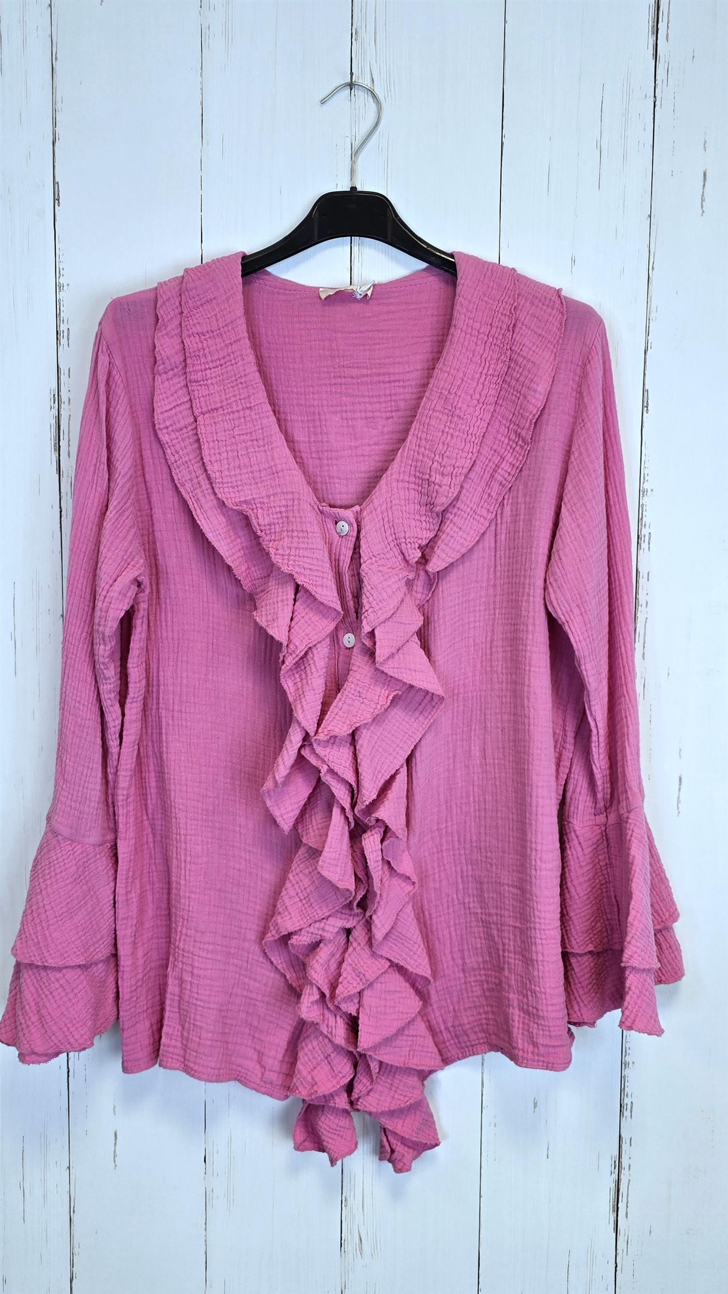 Lekker skjortebluse i vaflet bomullskvalitet med ekstra store og feminine volanger i fronten. Blusen har V-hals som gir et lett og elegant uttrykk, samt lange ermer med fine volanger nederst som gir en gjennomført og romantisk stil. Stoffet er lett og behagelig, og blusen faller pent på kroppen.