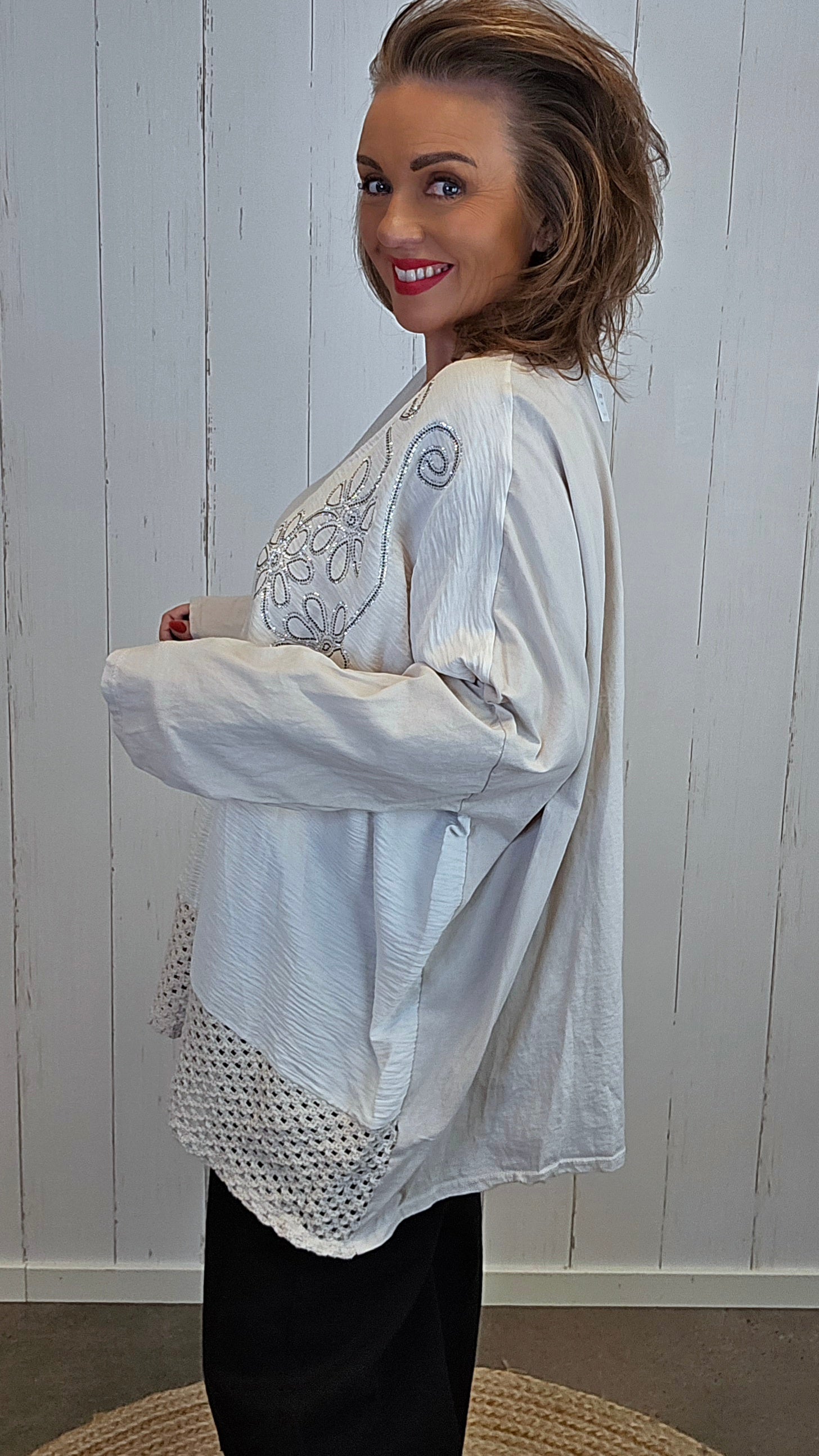 Oversized topp som faller utrolig lekkert på kroppen, med romslig passform og mykt stoff. Modellen har V-hals og dekorative blomster i front pyntet med små paljetter, som gir et feminint og eksklusivt uttrykk. Nederst i front er det en heklet kant som tilfører en fin håndverksdetalj. Toppen har lange ermer og god vidde, noe som gjør den både komfortabel og elegant i bruk.
