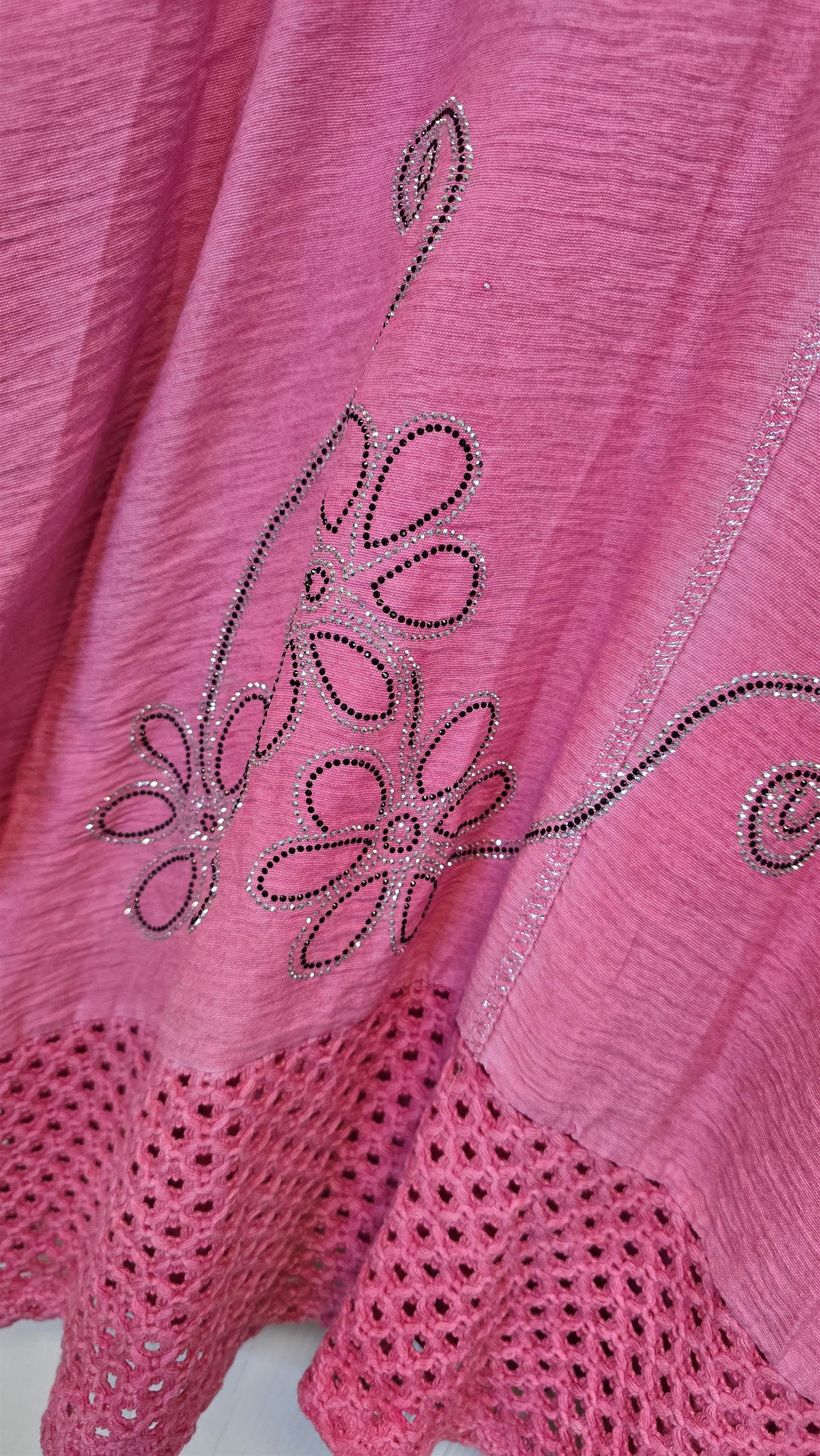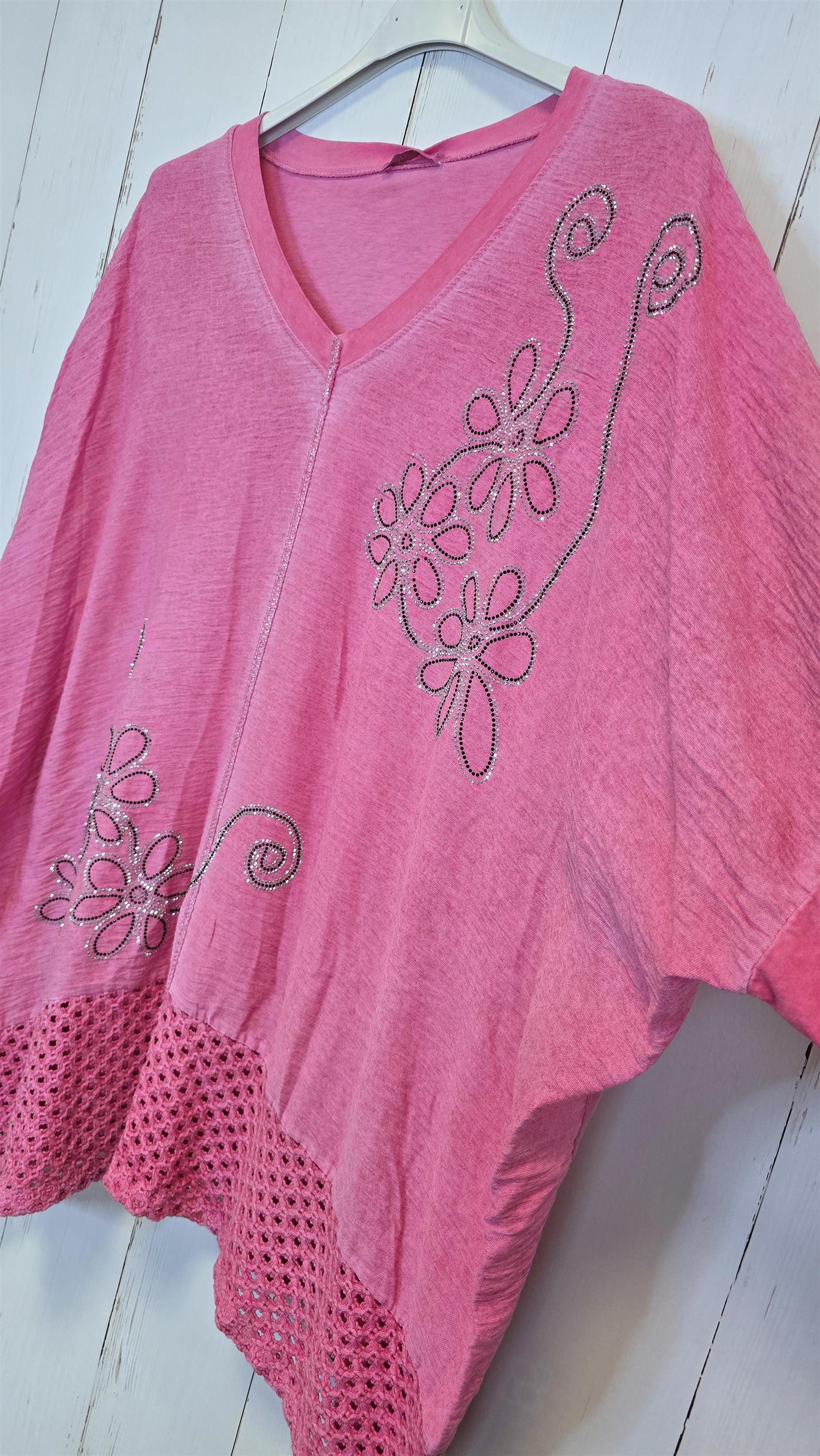 Oversized topp som faller utrolig lekkert på kroppen, med romslig passform og mykt stoff. Modellen har V-hals og dekorative blomster i front pyntet med små paljetter, som gir et feminint og eksklusivt uttrykk. Nederst i front er det en heklet kant som tilfører en fin håndverksdetalj. Toppen har lange ermer og god vidde, noe som gjør den både komfortabel og elegant i bruk.
