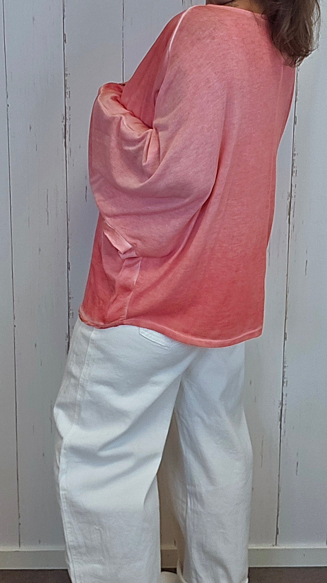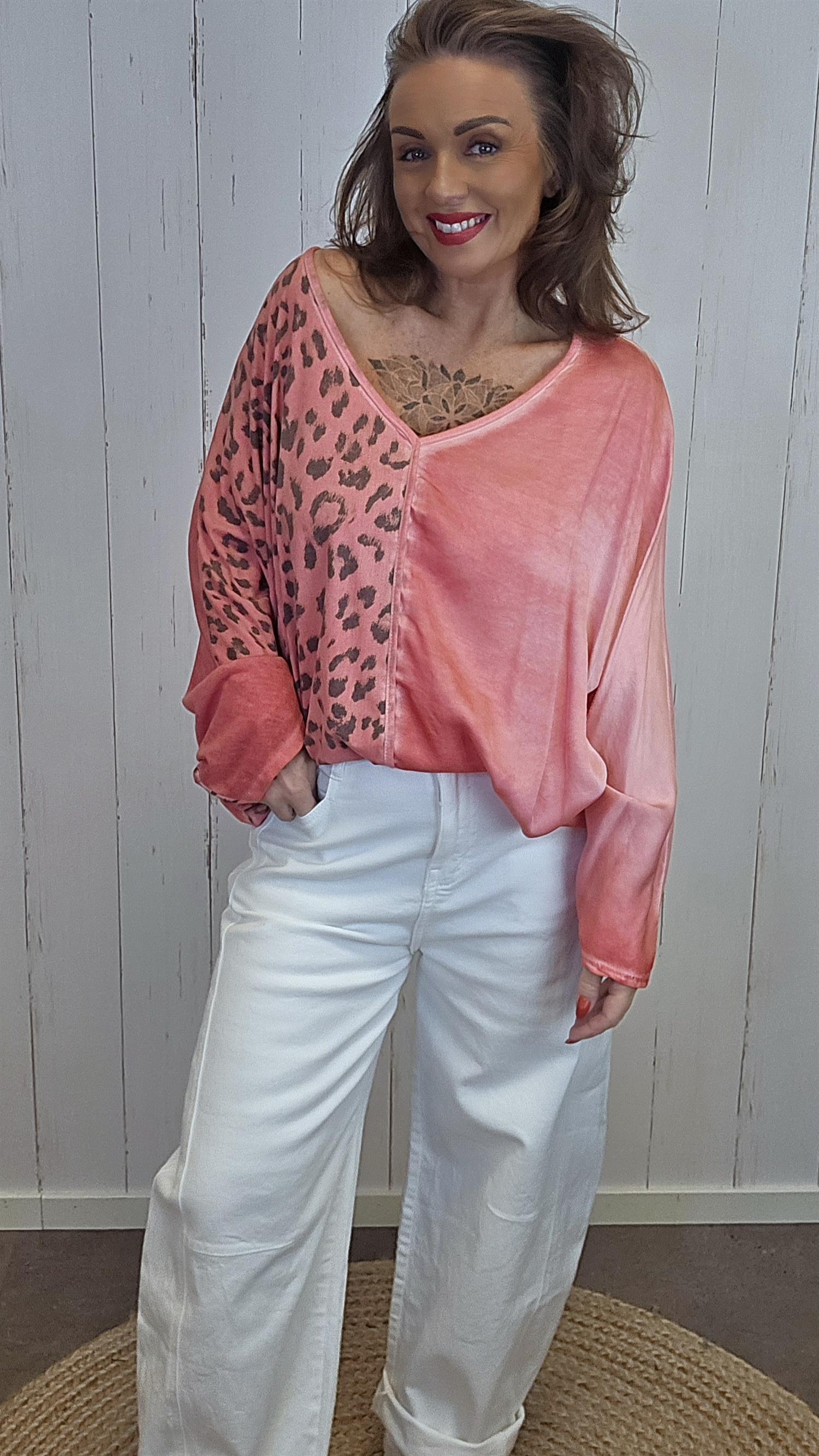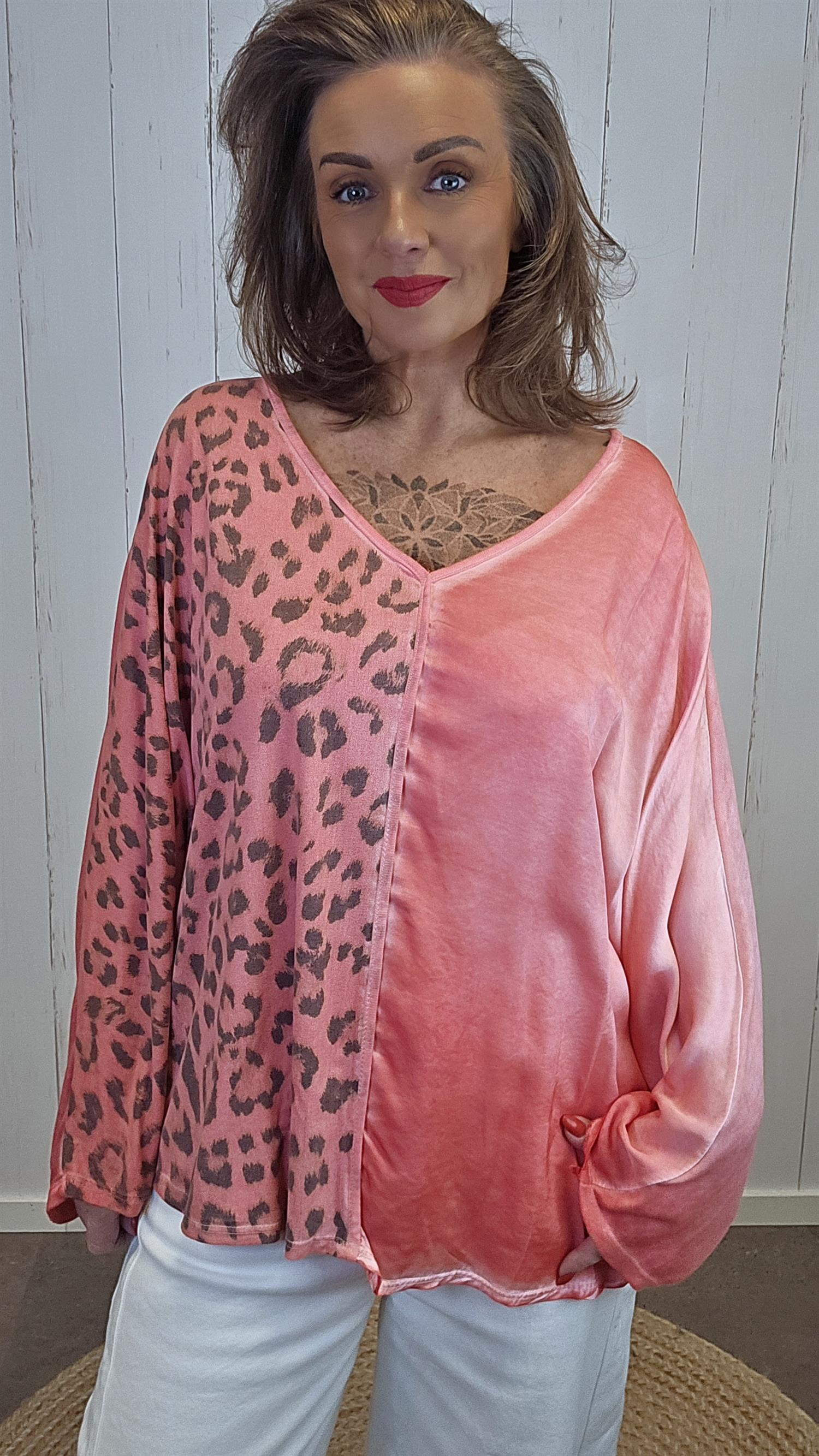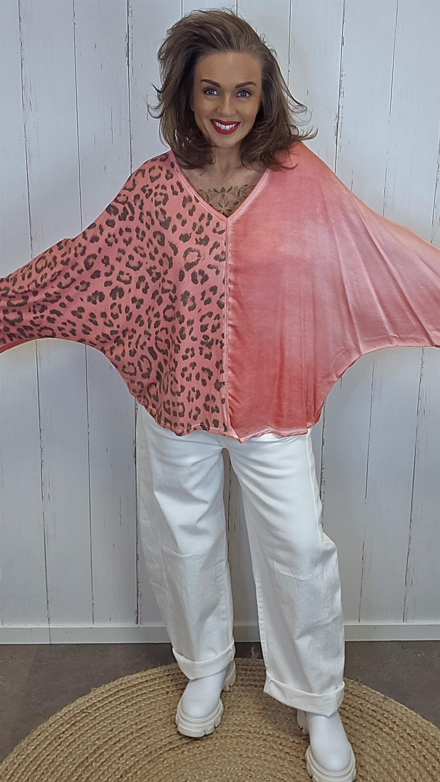 Lekker topp med dyp V-hals og spennende kombinasjon av to ulike stoffer i front. Den ene siden har et mykt leopardprint, mens den andre siden er i et glattere stoff, noe som gir et moderne og elegant uttrykk. Toppen har lange flaggermusermer som gir god bevegelse og en flatterende silhuett. Modellen har god vidde over bysten og er smalere nedover, slik at den faller pent på kroppen.