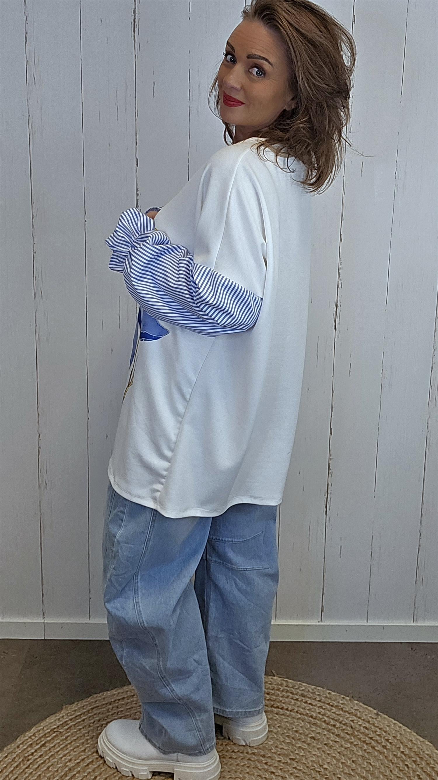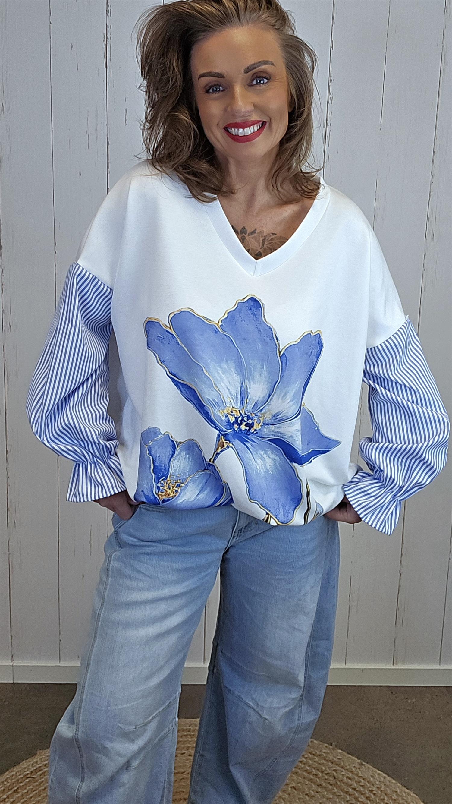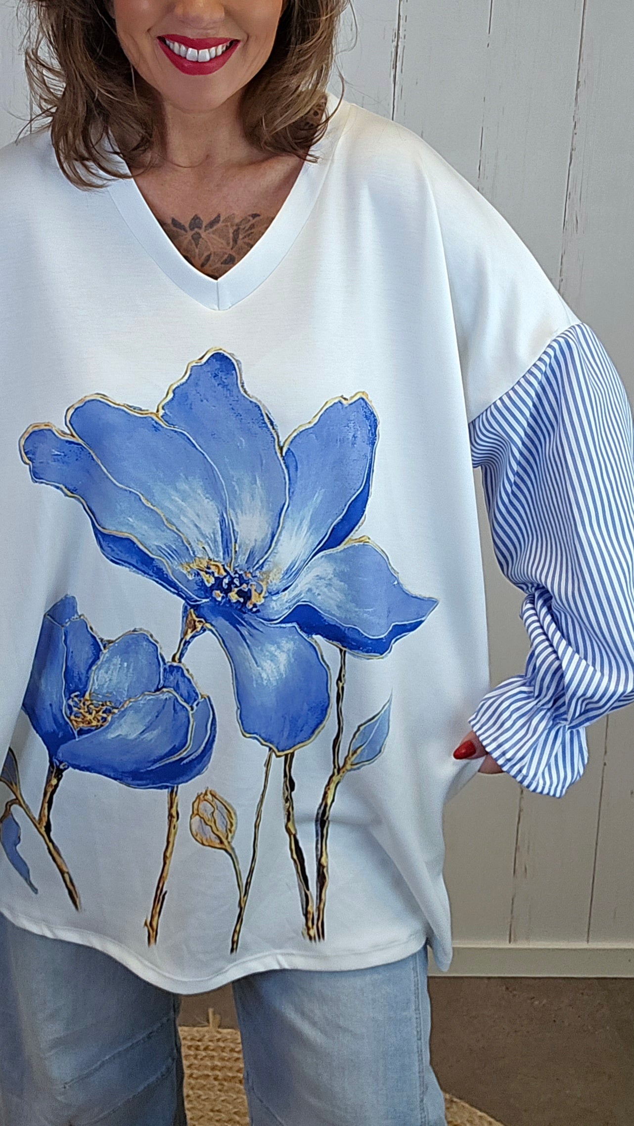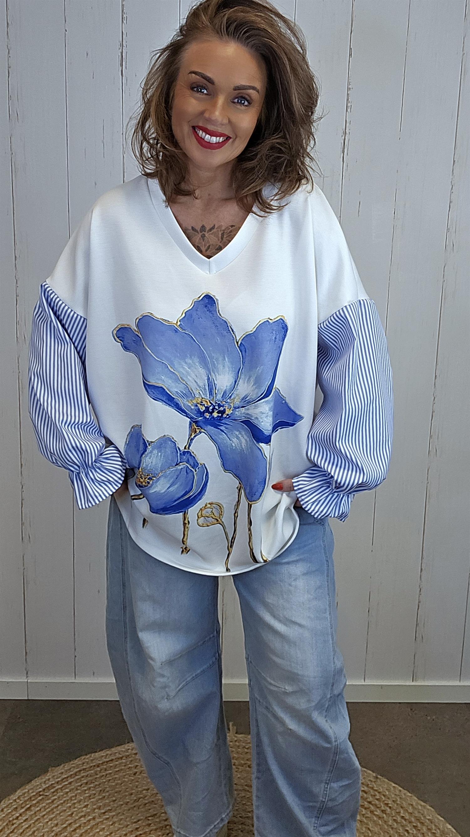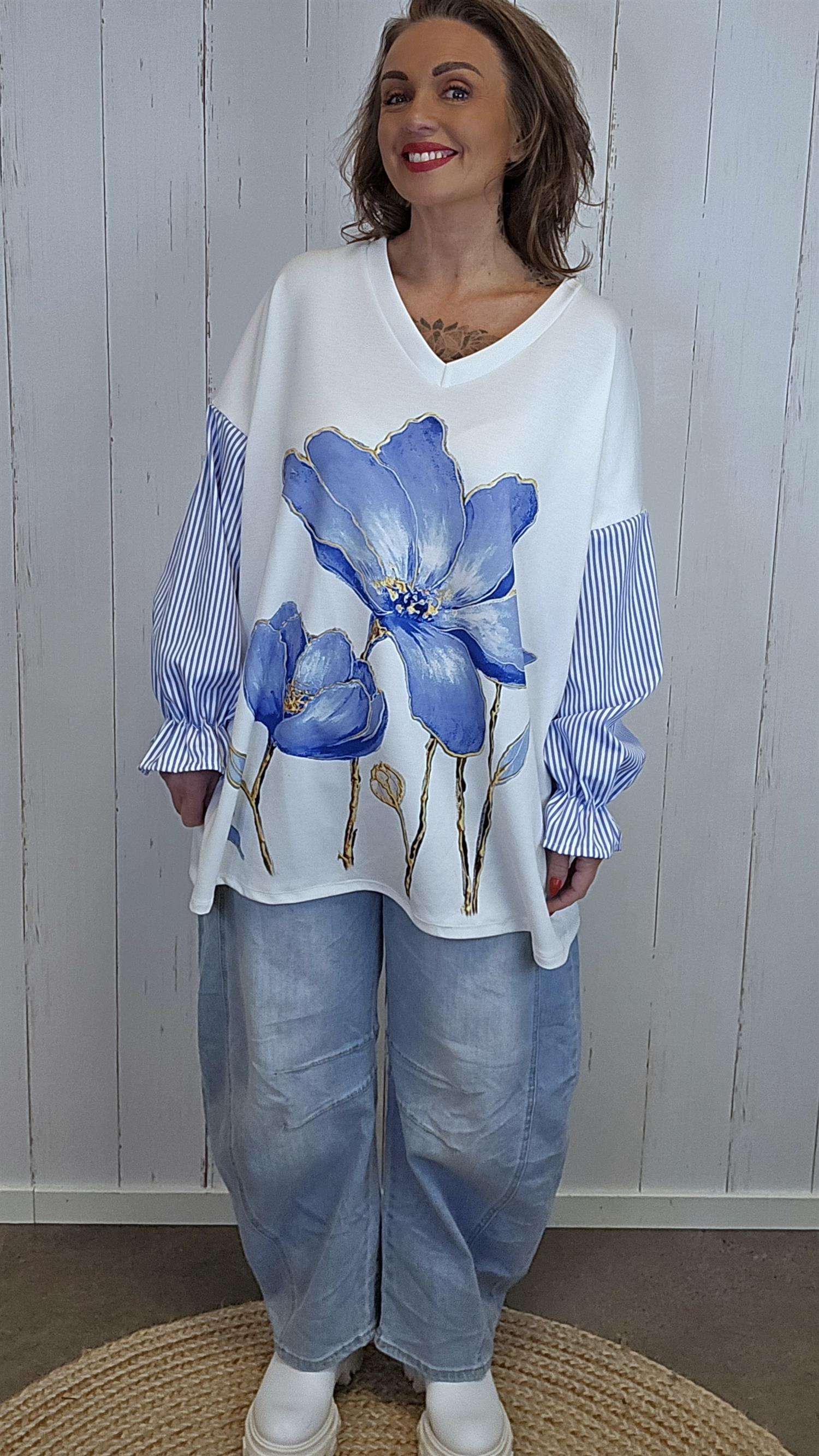 Myk og komfortabel baggytopp med V-hals og et lekkert stort blomsterprint i front som gir et tydelig statement. Toppen har påsydd ermer i stripete stoff, som skaper en kul kontrast til resten av plagget. Ermene avsluttes med strikk nederst, noe som gir en fin form og god komfort. Modellen har romslig vidde over bysten og en flatterende lengde som faller pent.