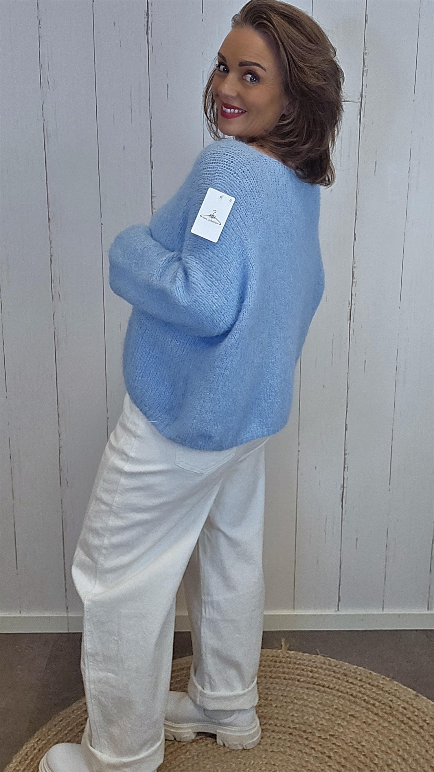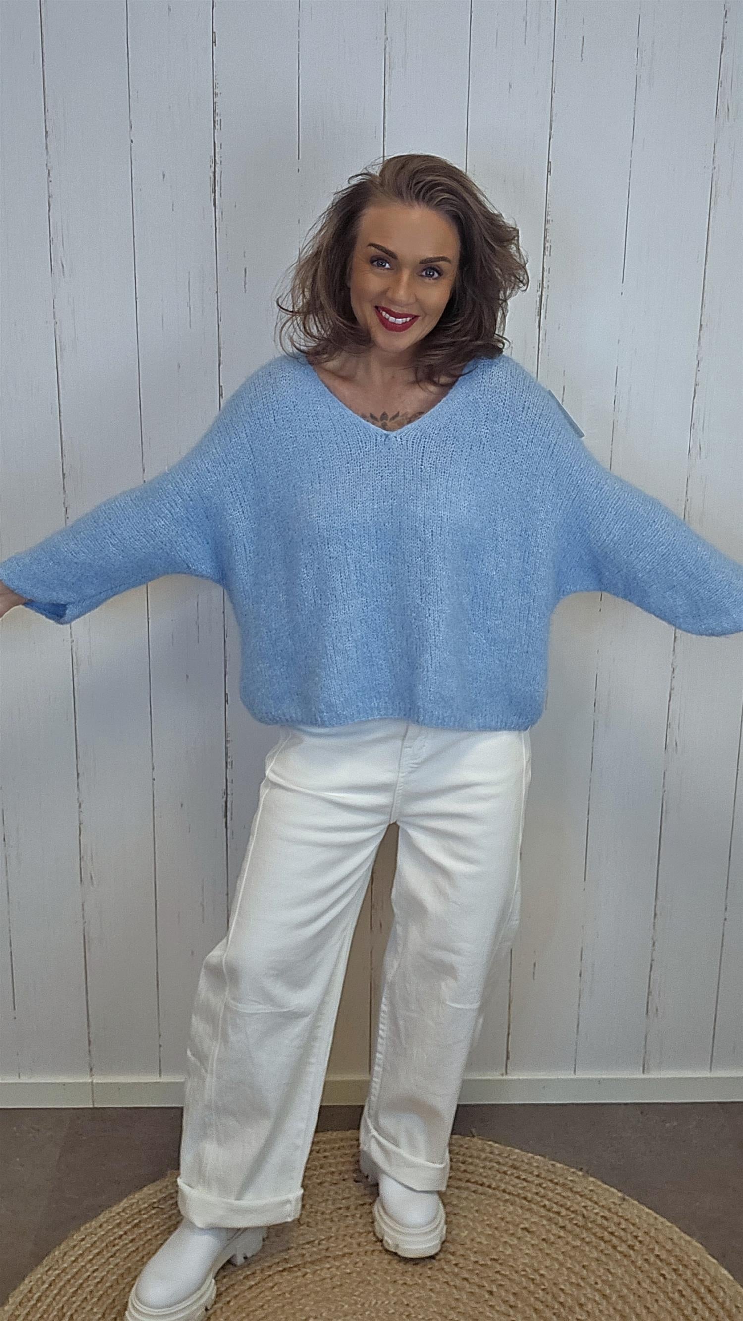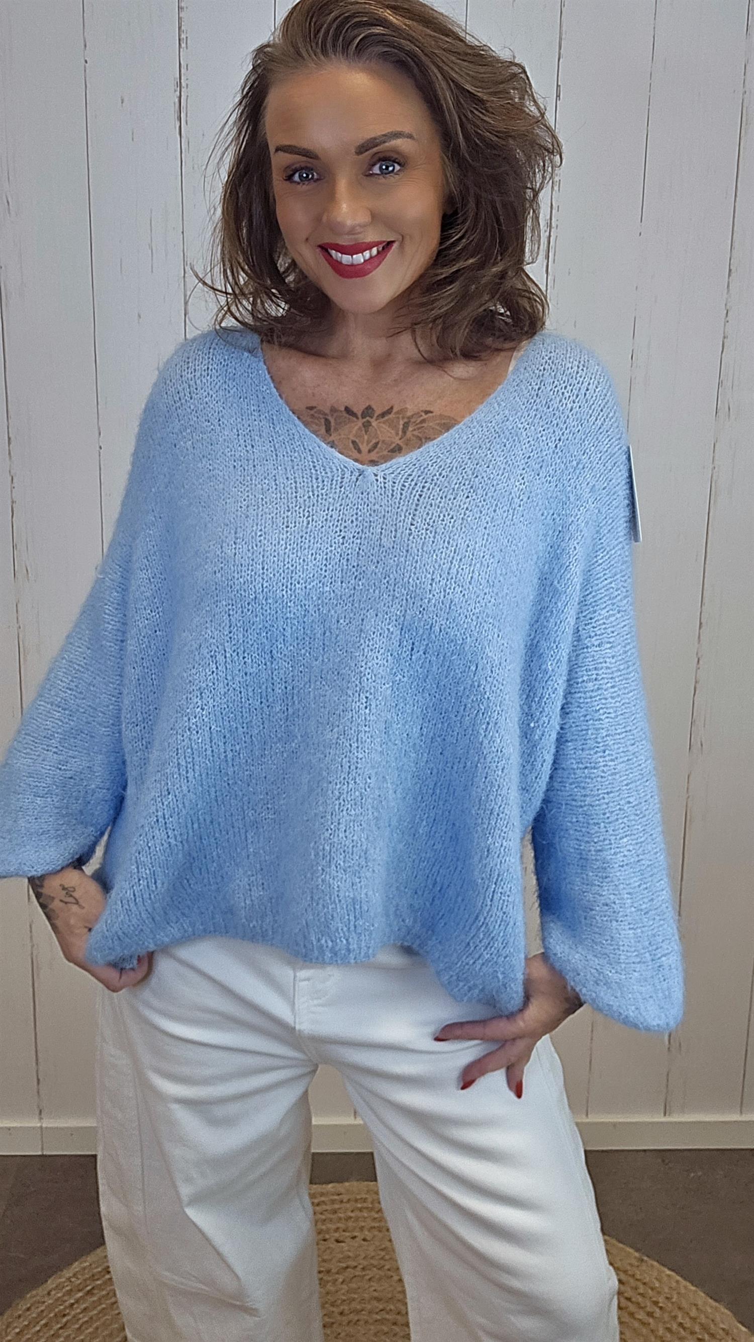 Anna genser er en myk, fluffy og lett strikket genser med avslappet passform. Den har en pen og dyp V-utringning som gir et flatterende uttrykk, og den luftige strukturen gjør den behagelig både inne og ute gjennom hele sesongen. De vide ermene og den avrundede kanten nederst gir plagget en naturlig og elegant fasong.