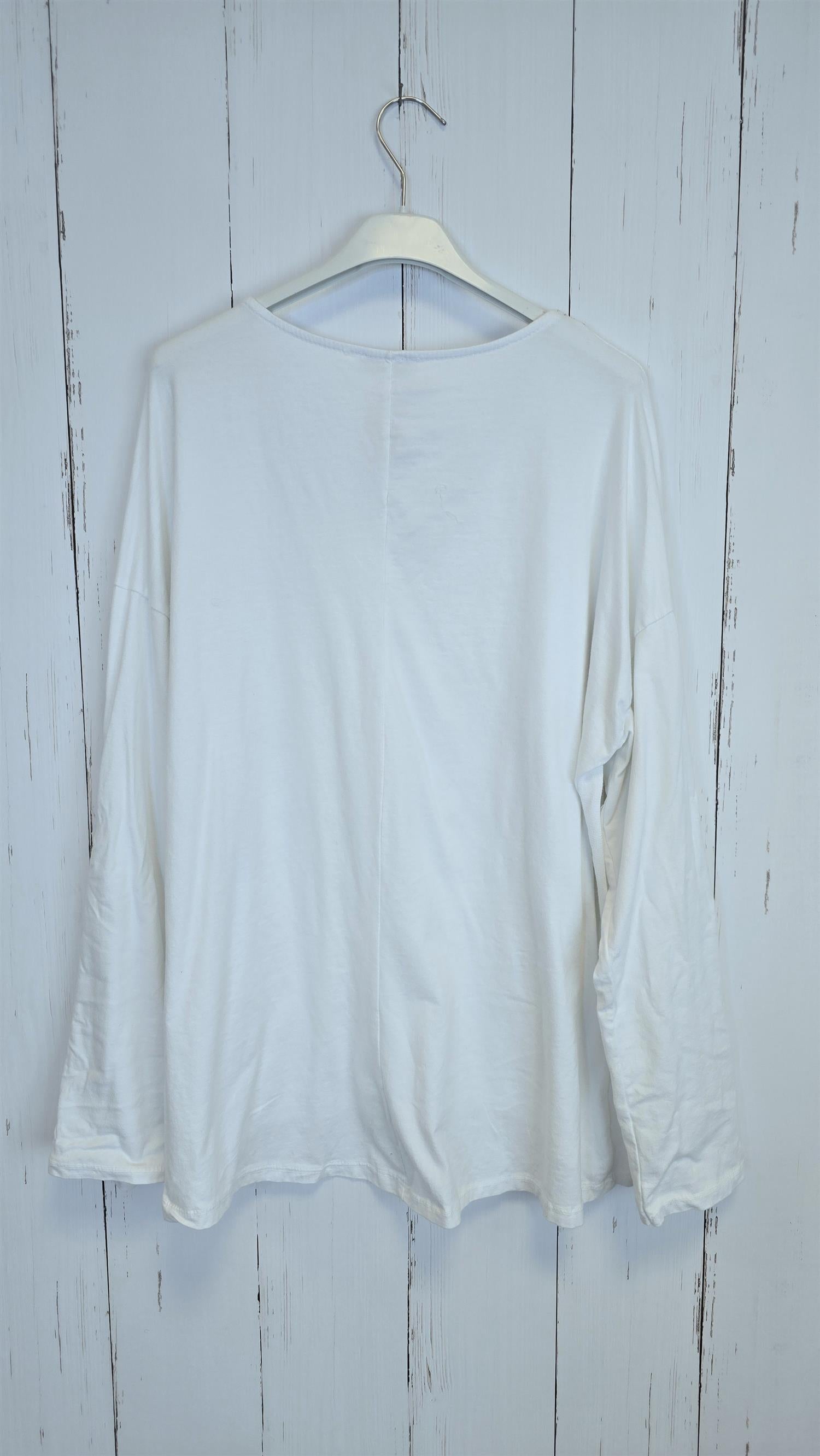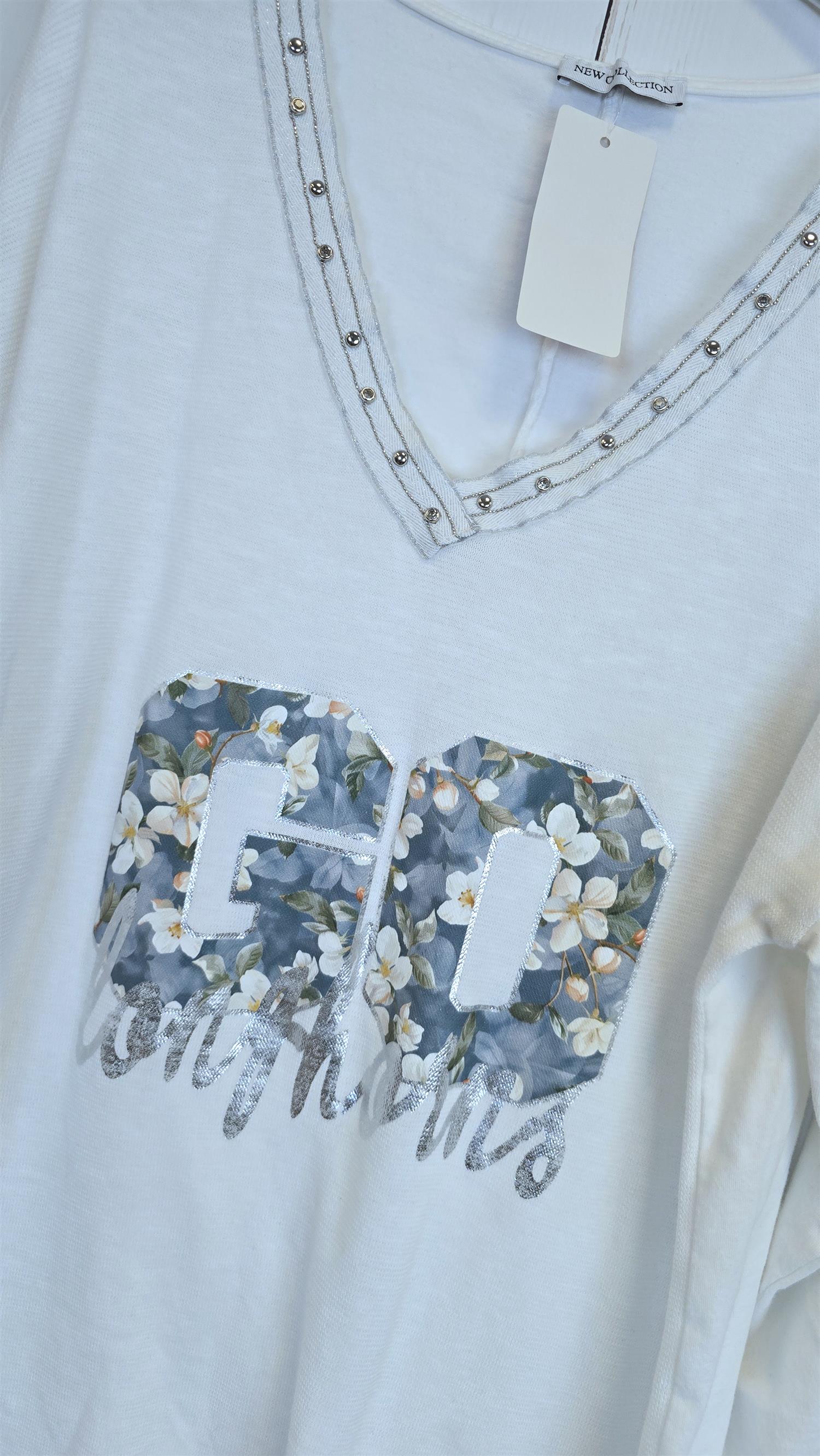 Myk og deilig topp med V-hals og dekorativt trykk i front i lekre farger. Rundt V-halsen er det stensnagler/nagledetaljer som gir et tøft og eksklusivt uttrykk. Toppen har lange ermer som kan brettes opp og festes med knapp, slik at du enkelt kan variere uttrykket. Modellen er lengre bak enn foran og faller pent på kroppen.