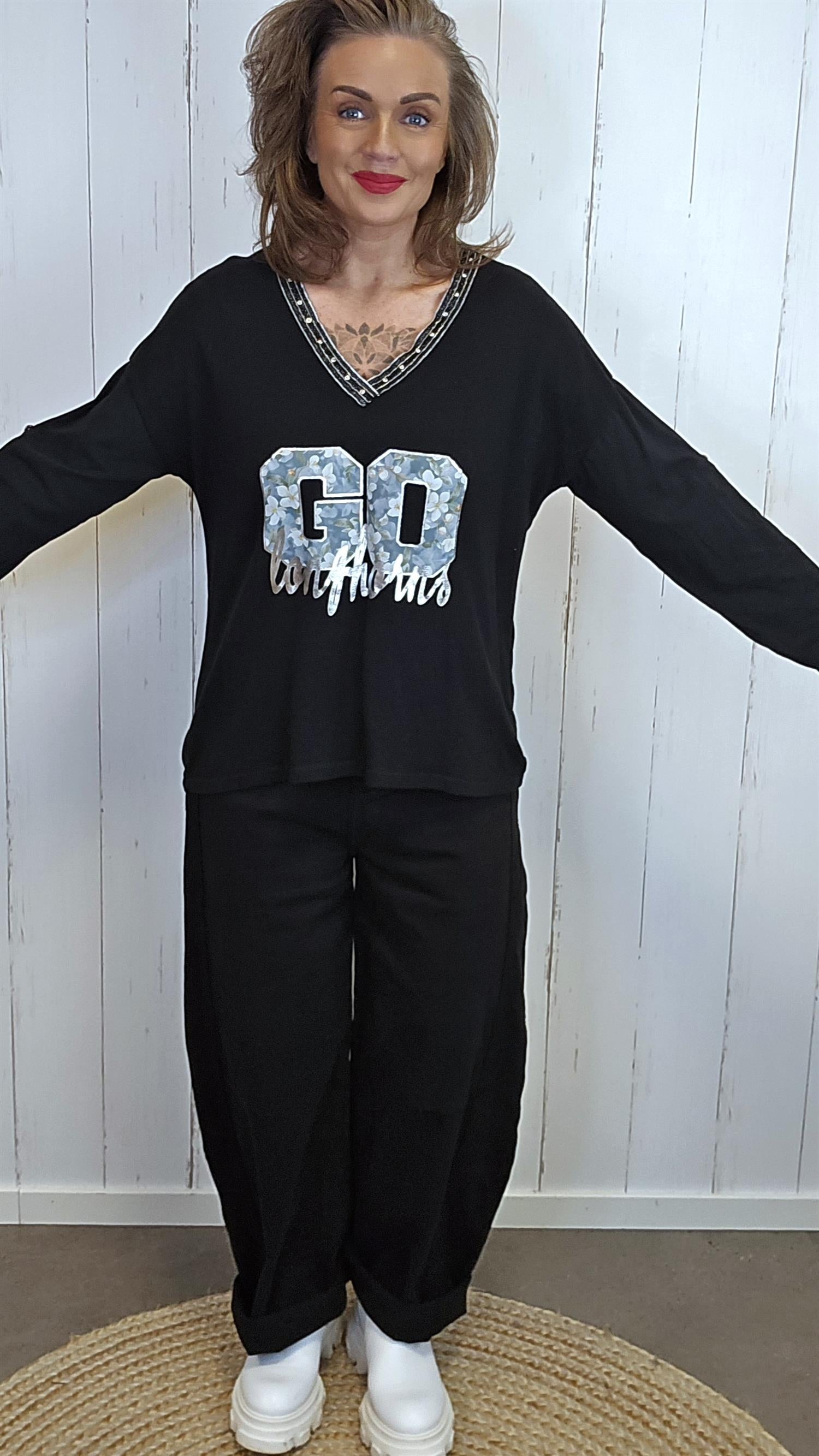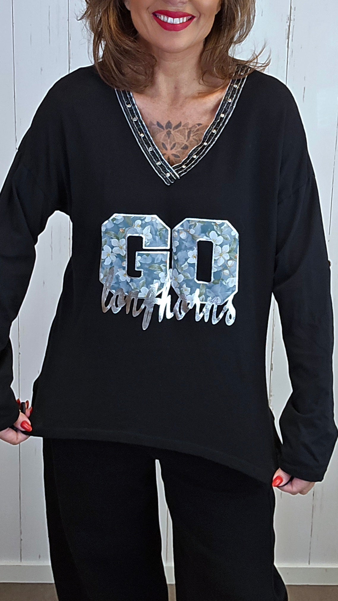 Myk og deilig topp med V-hals og dekorativt trykk i front i lekre farger. Rundt V-halsen er det stensnagler/nagledetaljer som gir et tøft og eksklusivt uttrykk. Toppen har lange ermer som kan brettes opp og festes med knapp, slik at du enkelt kan variere uttrykket. Modellen er lengre bak enn foran og faller pent på kroppen.