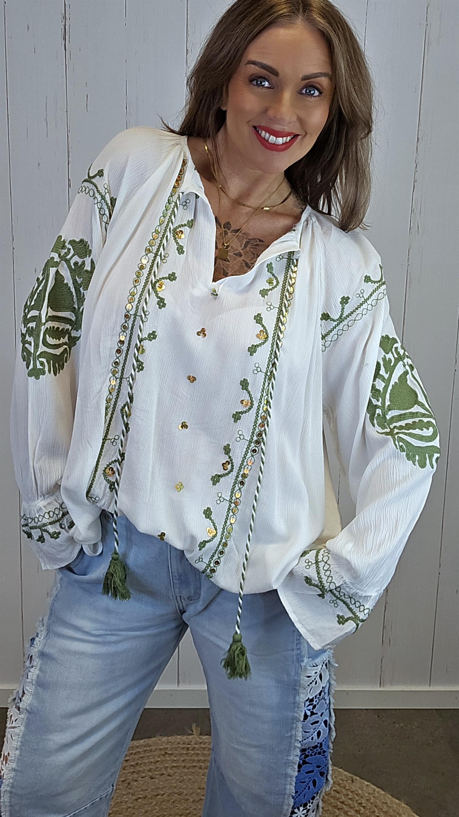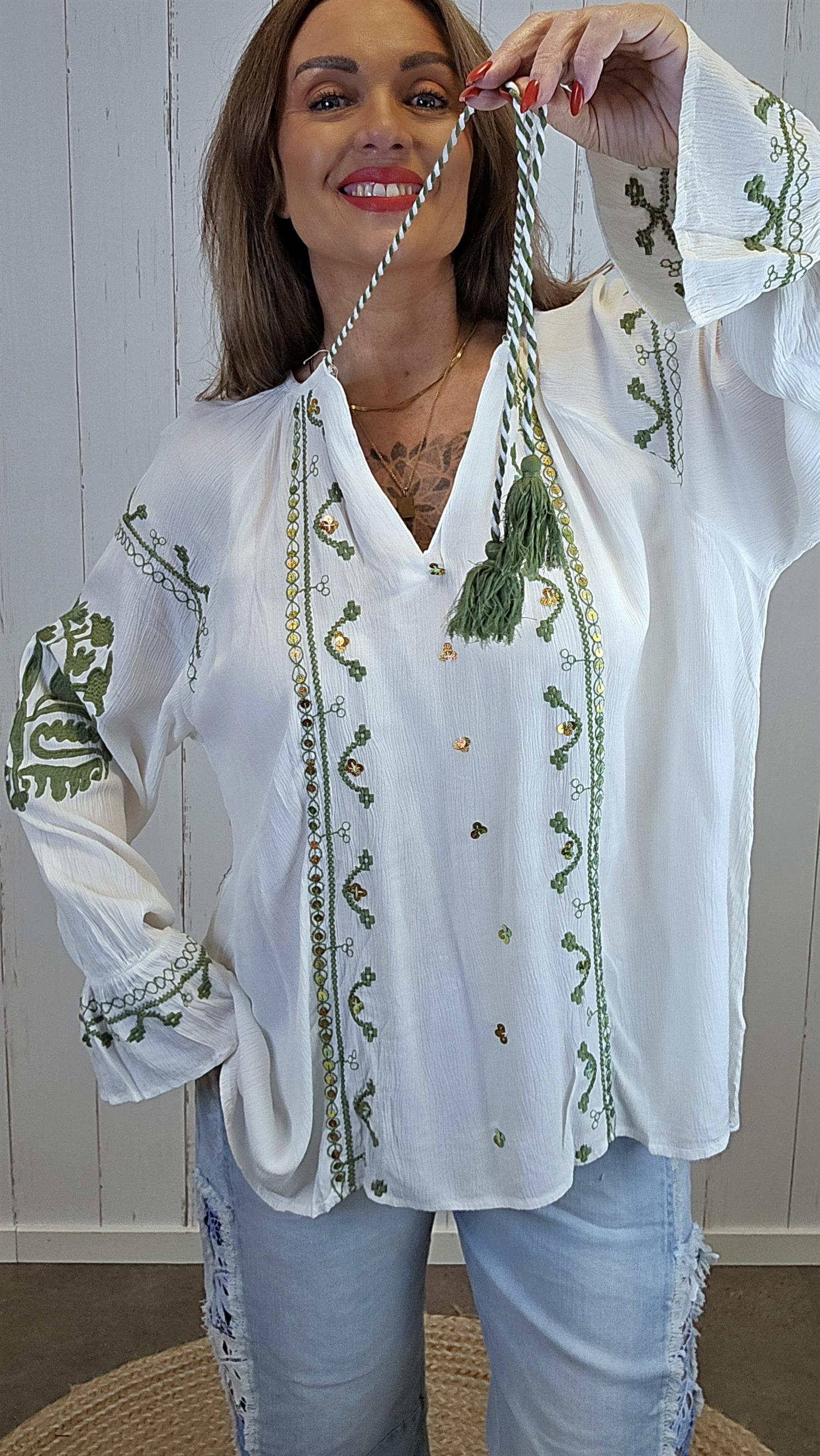 Lett og feminin bluse i myk viskose med vakre broderte detaljer i grønntoner og små innslag av varme farger. Blusen har rund hals med knyting og dekorative dusker i front som gir et bohemsk preg. Lange ermer med lett vidde og brodert avslutning nederst gir plagget et gjennomført og eksklusivt uttrykk.