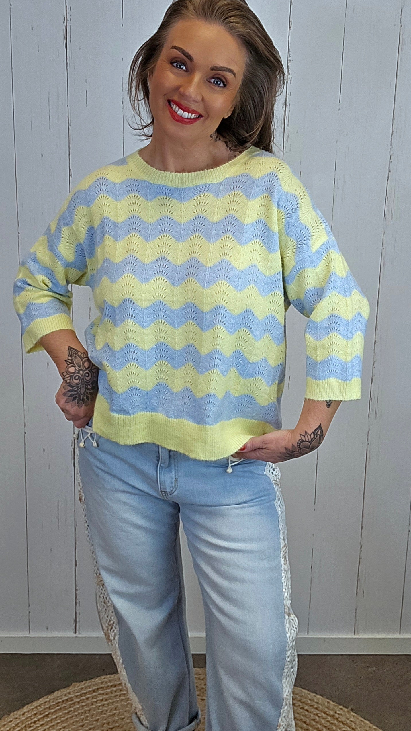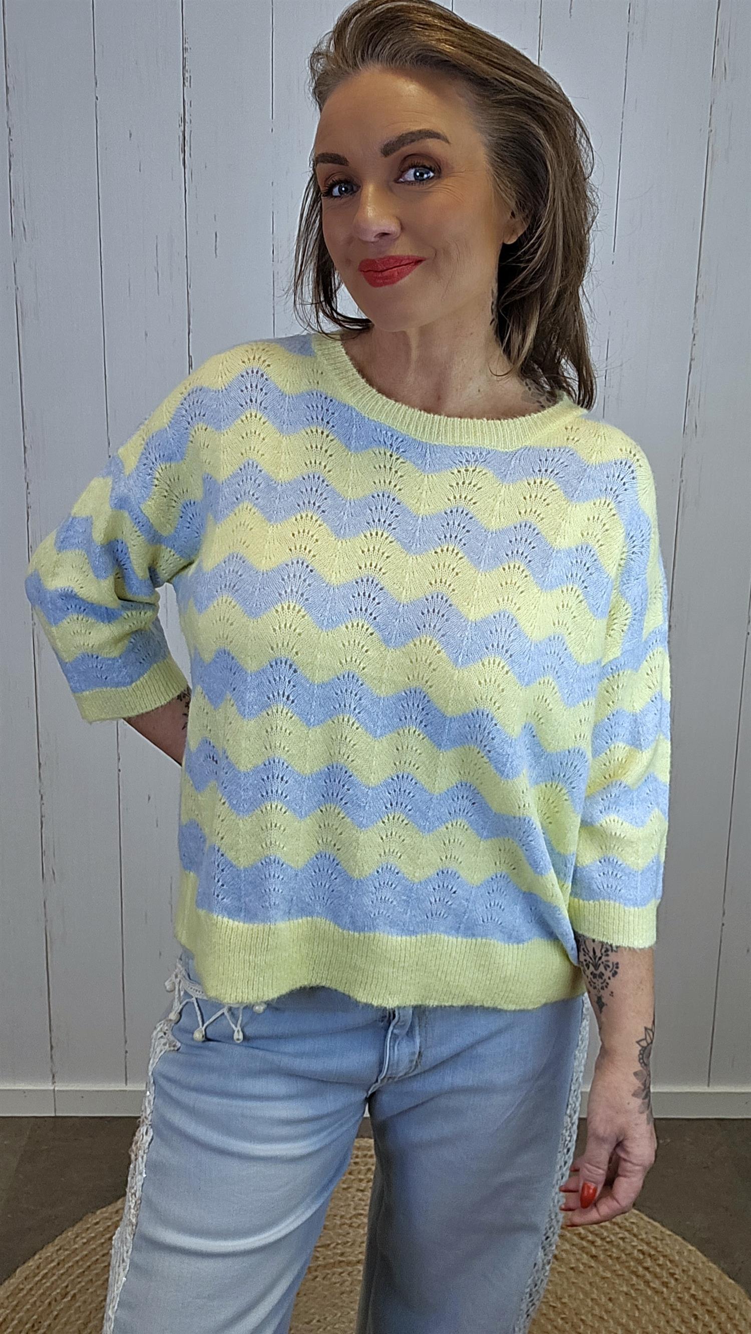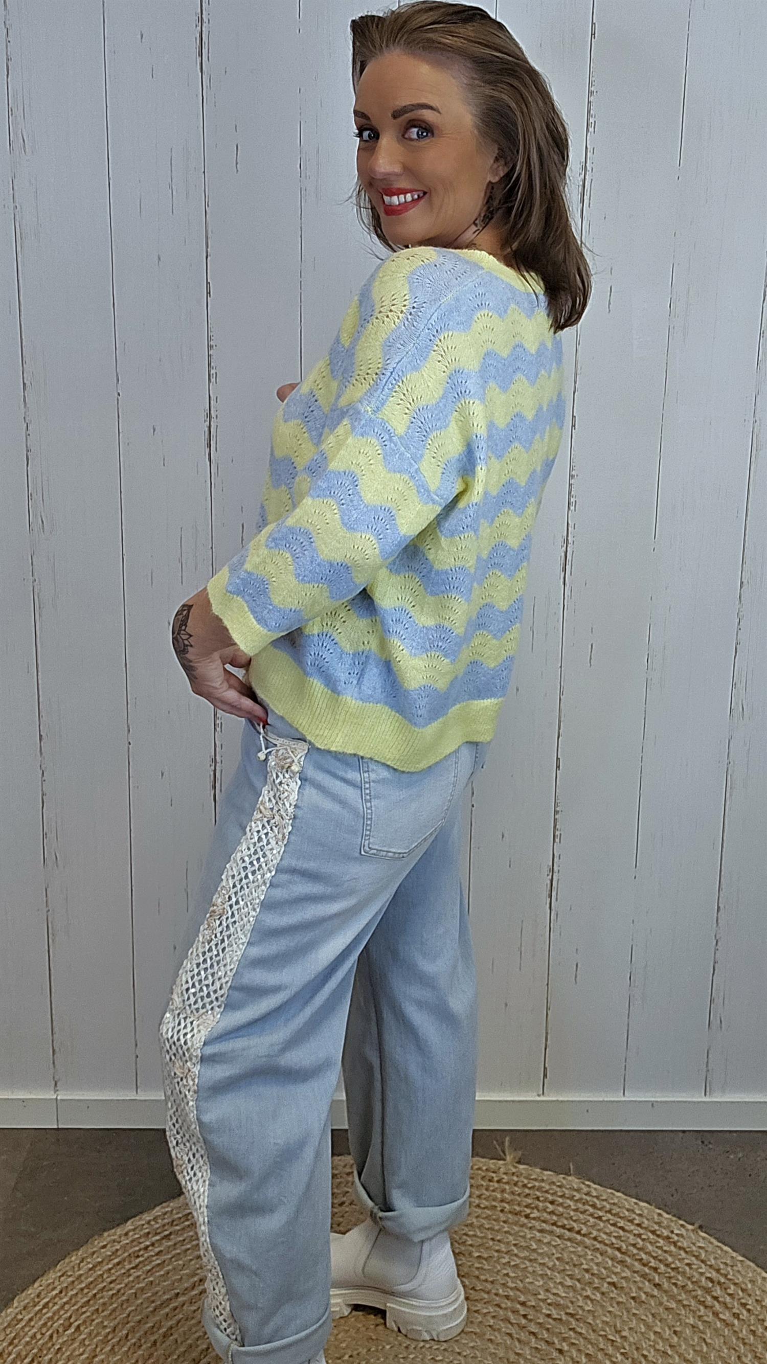 Myk og behagelig strikkegenser med dekorativt sikksakkmønster. Genseren har rund hals og en avslappet passform som gir et ledig og komfortabelt uttrykk. Den er lett, lun og perfekt både til hverdagsbruk og roligere dager, samtidig som den enkelt kan styles opp.