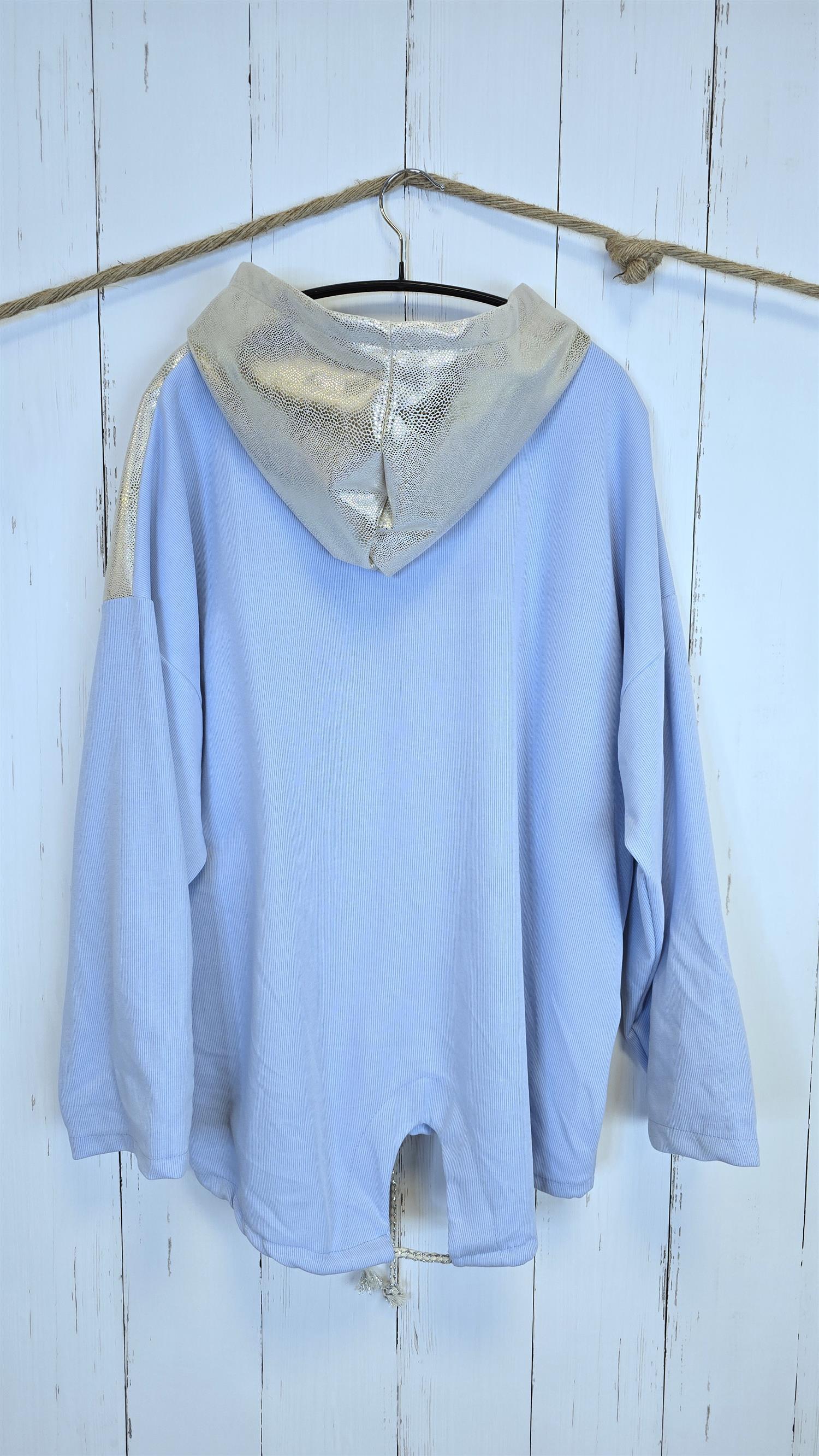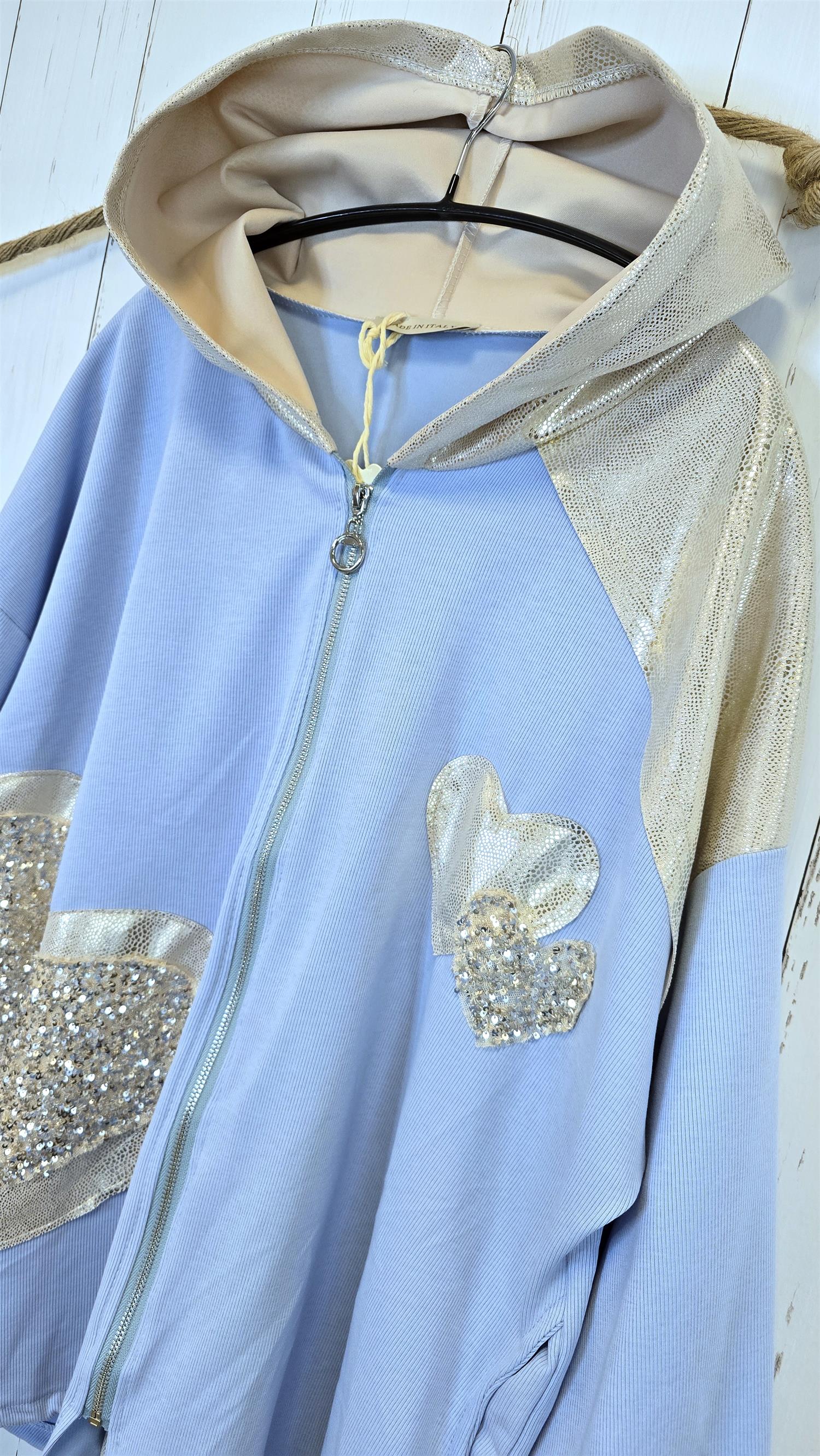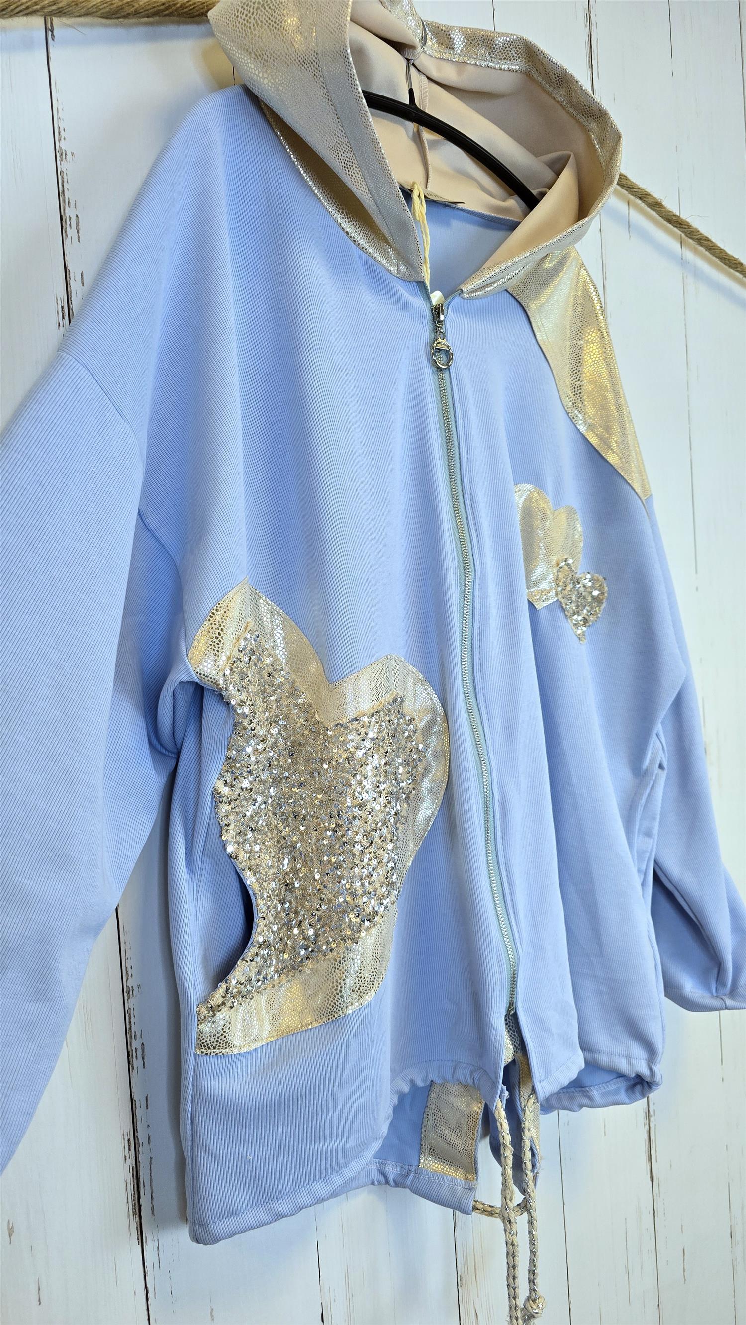 Myk og behagelig hettejakke med glidelås og dekorative hjerteapplikasjoner foran. Jakken har hette og justerbar knyting nederst, slik at du enkelt kan tilpasse passformen. Perfekt som en lett jakke til hverdagsbruk.