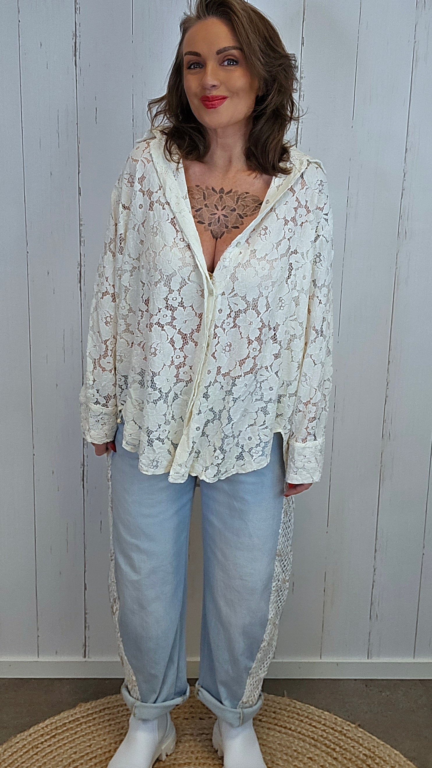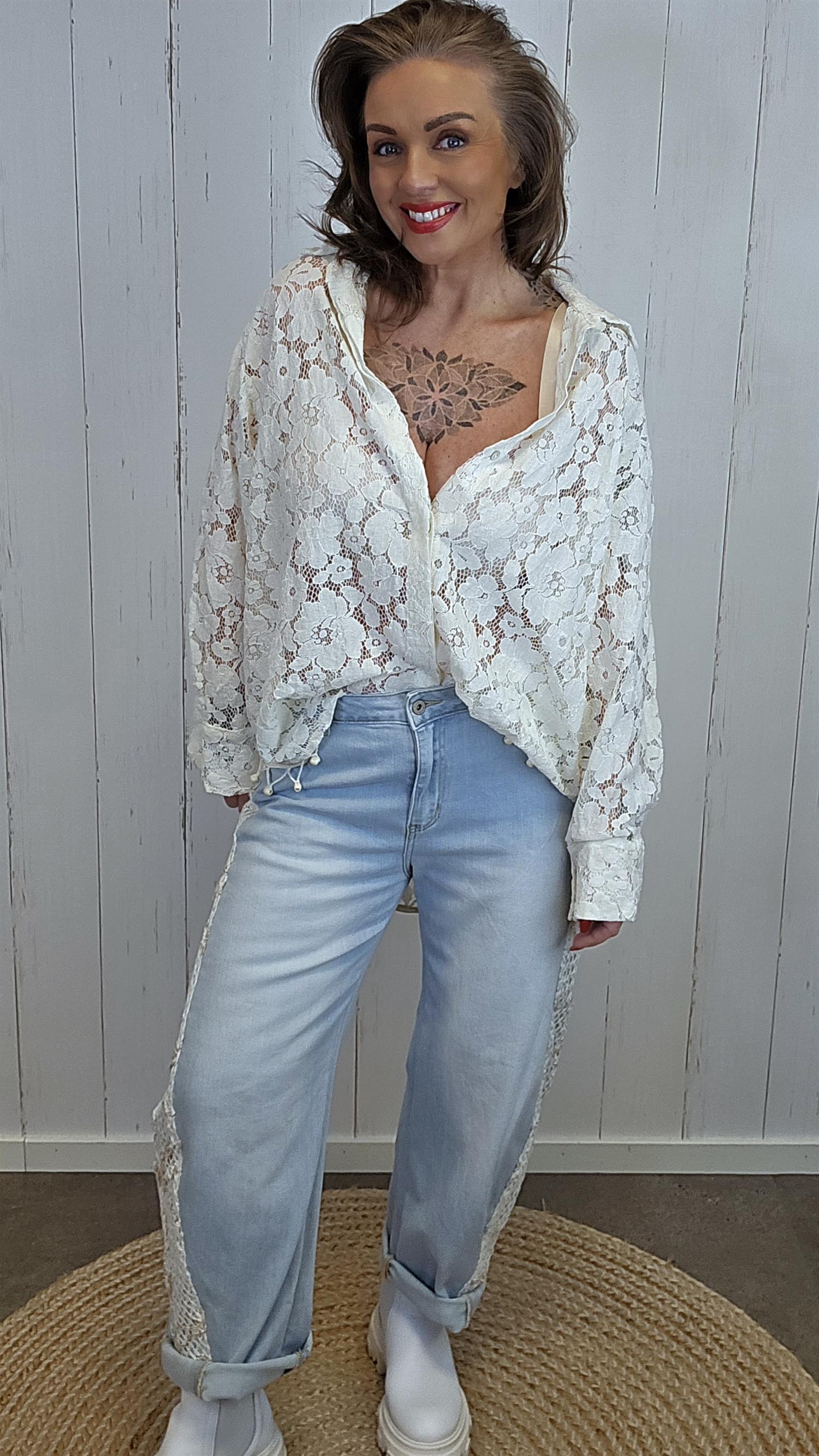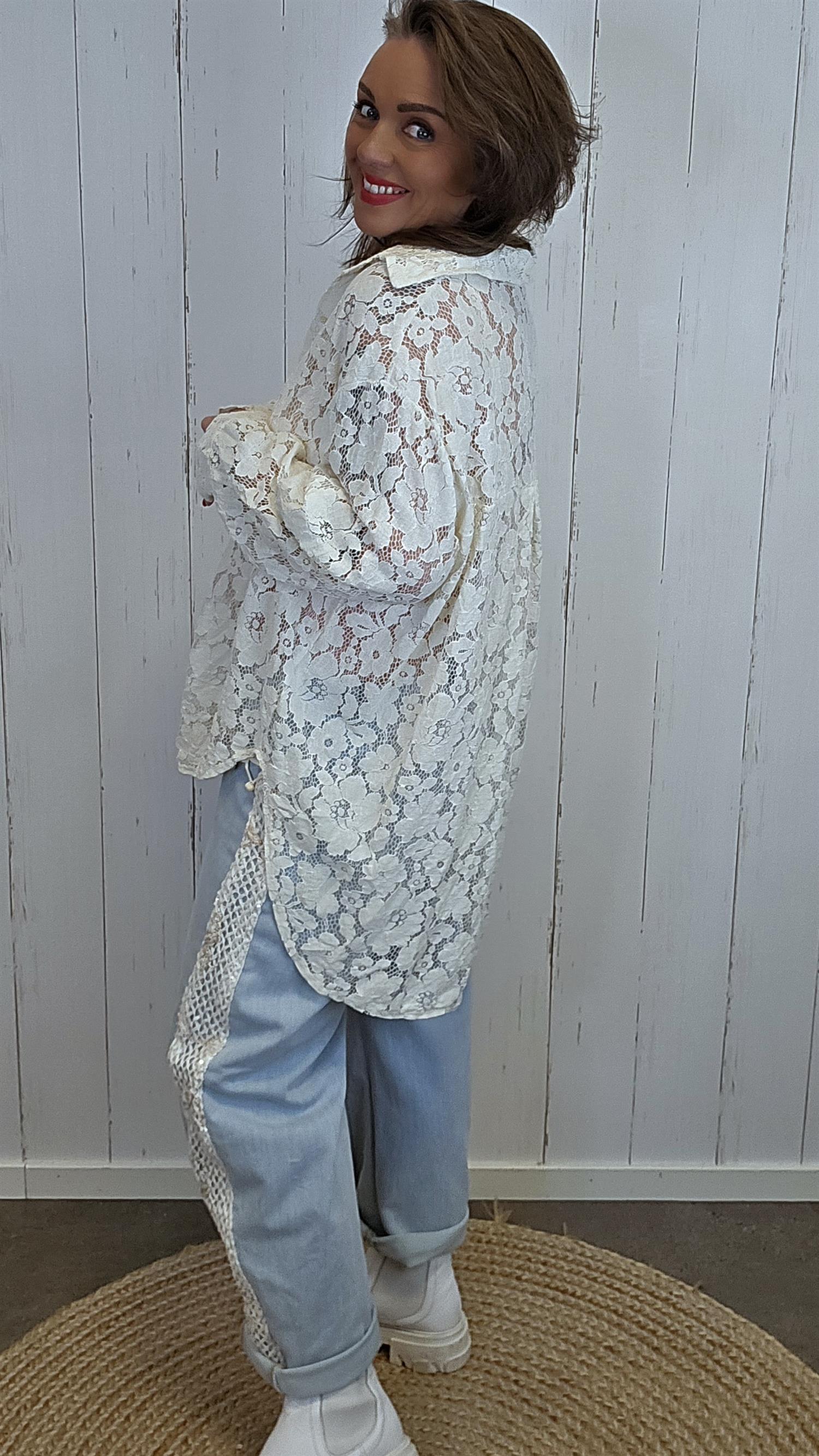 Elegant blondeskjorte med gjennomgående blomsterblonde og klassisk skjortekrage. Modellen har knapper i front og et lett, luftig uttrykk som gjør den like fin til hverdags som til mer pyntede anledninger. Den faller pent på kroppen og kan styles både lukket og åpen over en topp.