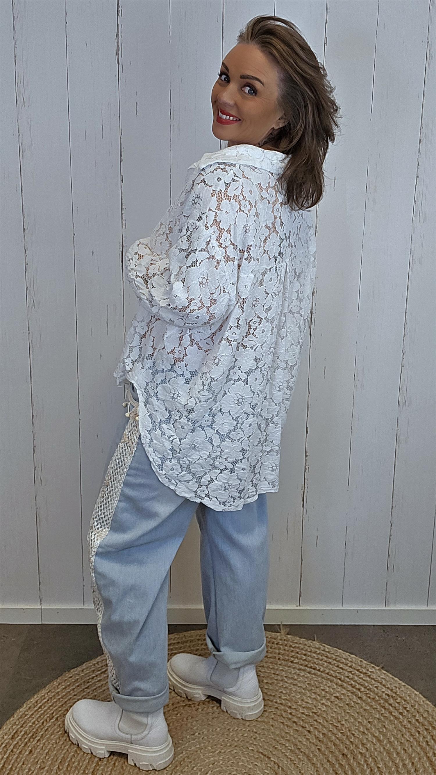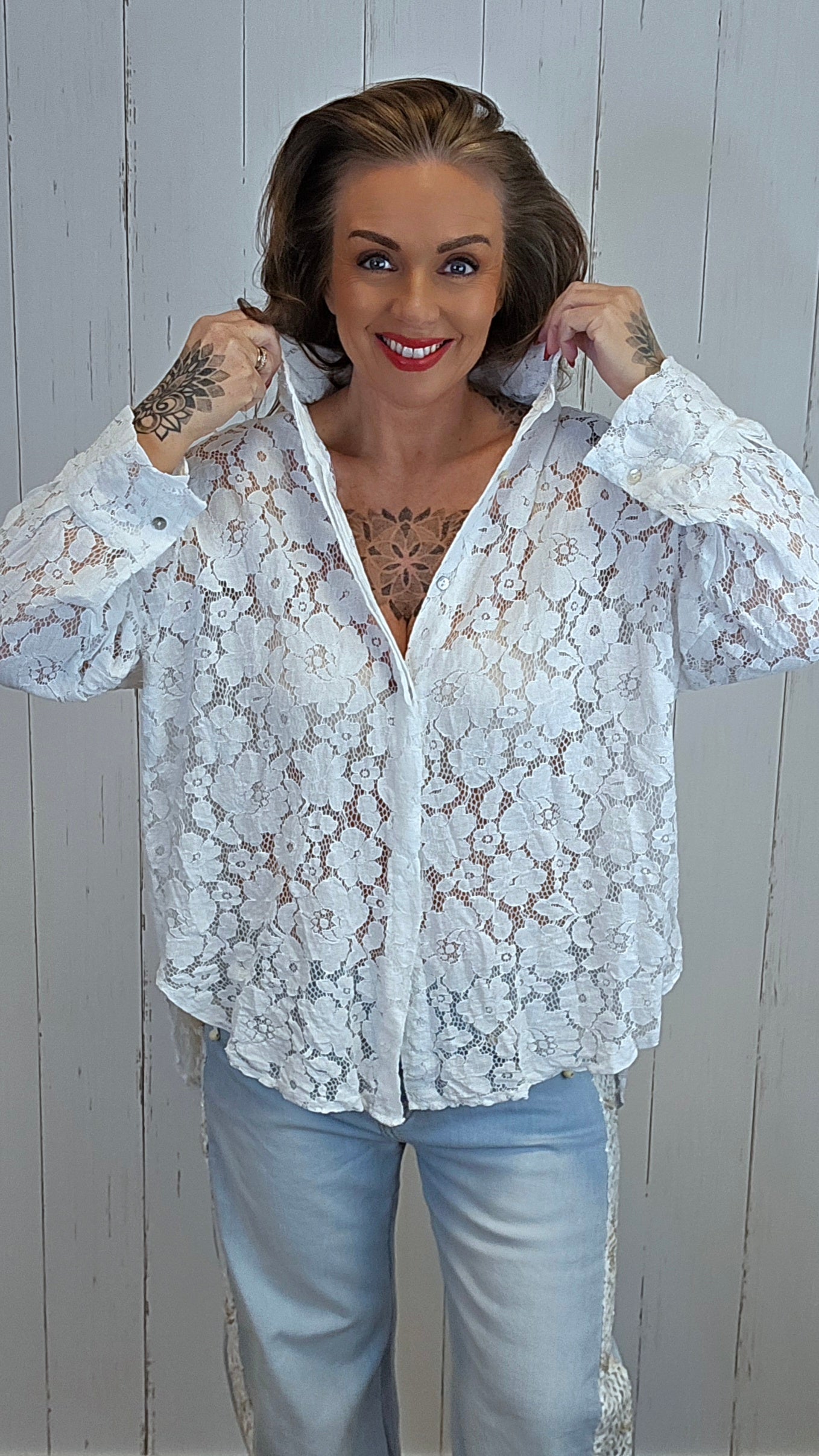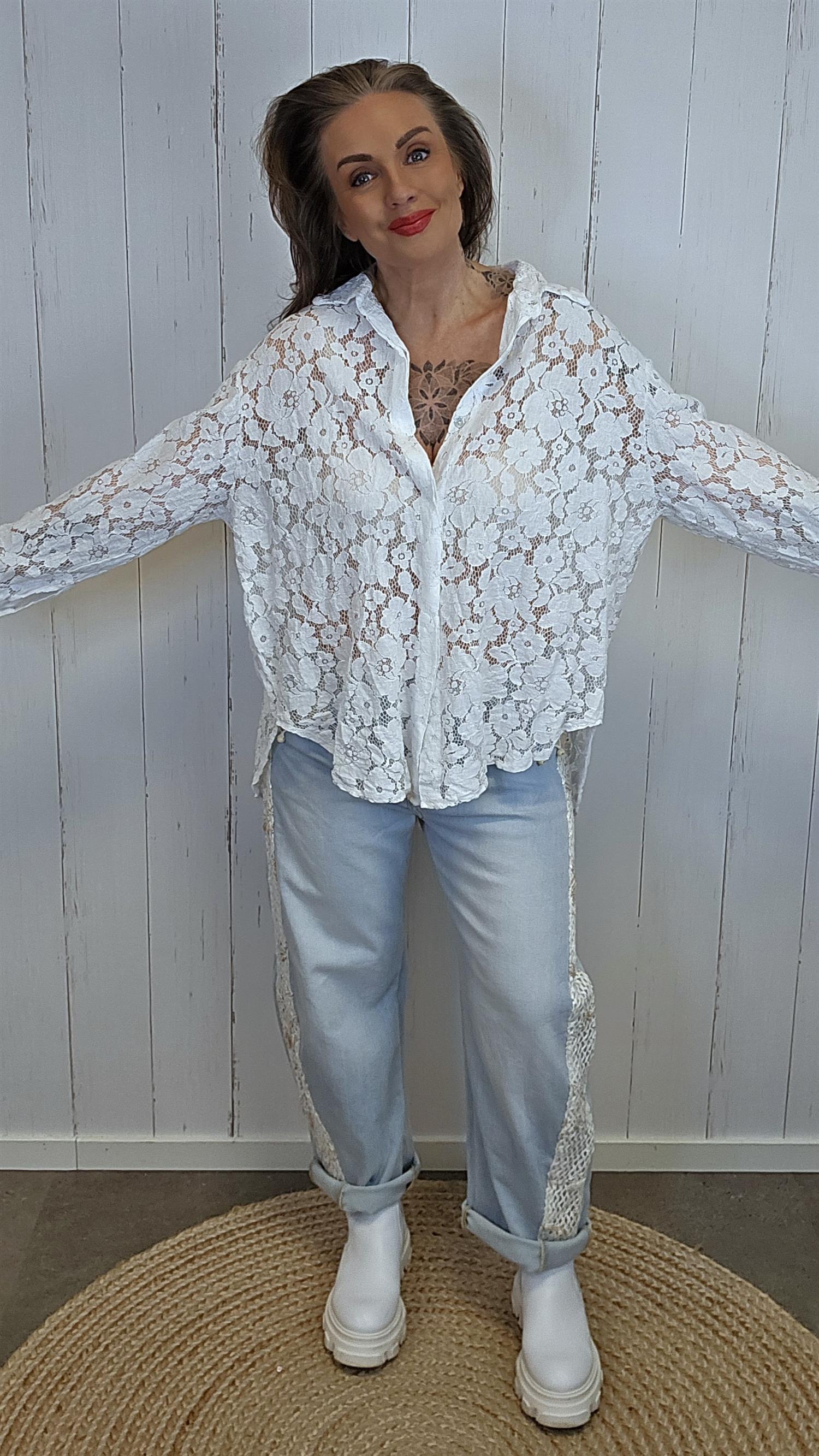 Elegant blondeskjorte med gjennomgående blomsterblonde og klassisk skjortekrage. Modellen har knapper i front og et lett, luftig uttrykk som gjør den like fin til hverdags som til mer pyntede anledninger. Den faller pent på kroppen og kan styles både lukket og åpen over en topp.