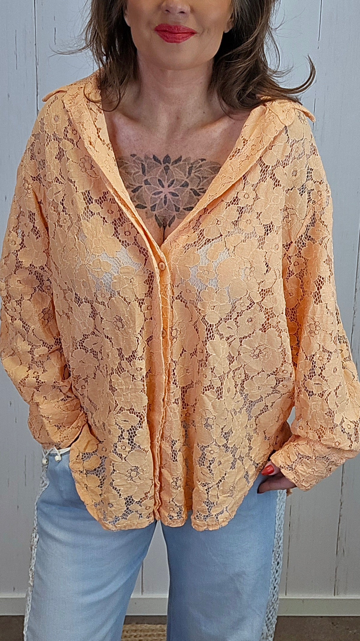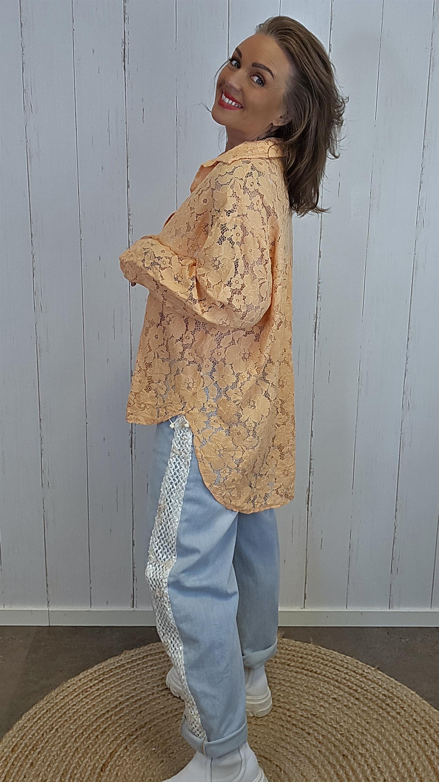 Elegant blondeskjorte med gjennomgående blomsterblonde og klassisk skjortekrage. Modellen har knapper i front og et lett, luftig uttrykk som gjør den like fin til hverdags som til mer pyntede anledninger. Den faller pent på kroppen og kan styles både lukket og åpen over en topp.