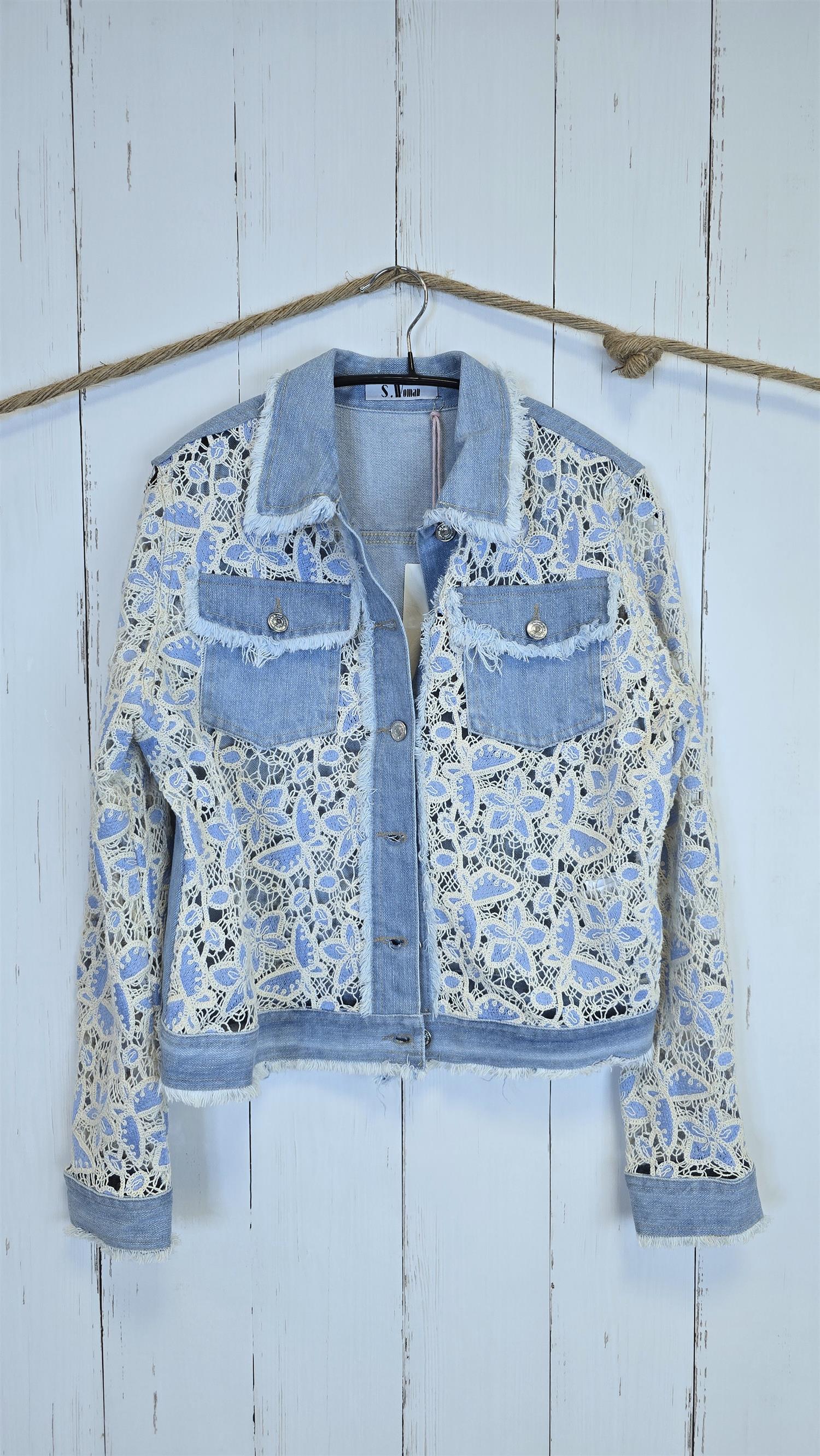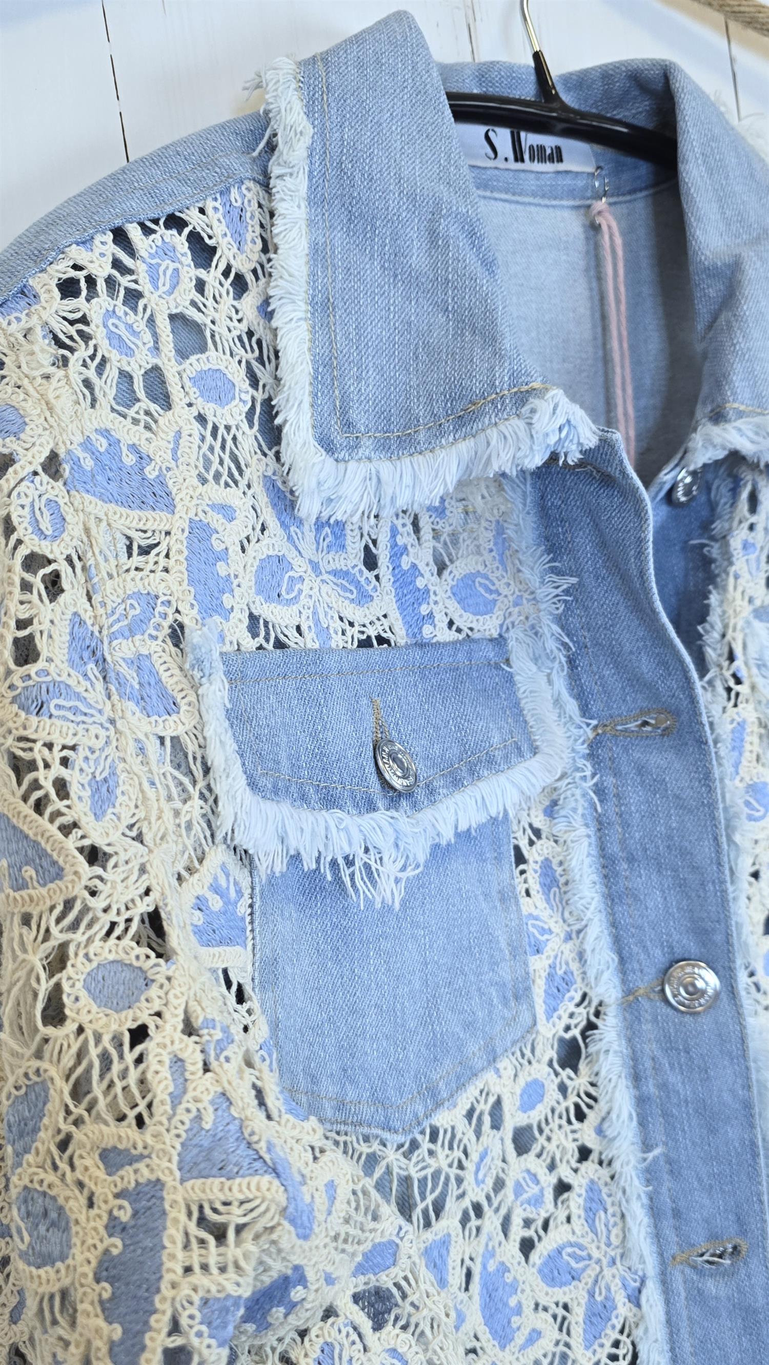 Kort jakke i en spennende kombinasjon av denim og dekorativ blonde. Jakken har klassisk krage, knapper i front og brystlommer med denimdetaljer. Blondene gir et feminint og lett uttrykk, mens denimstoffet tilfører kontrast og struktur. Perfekt som et statement-plagg over en enkel topp eller kjole.