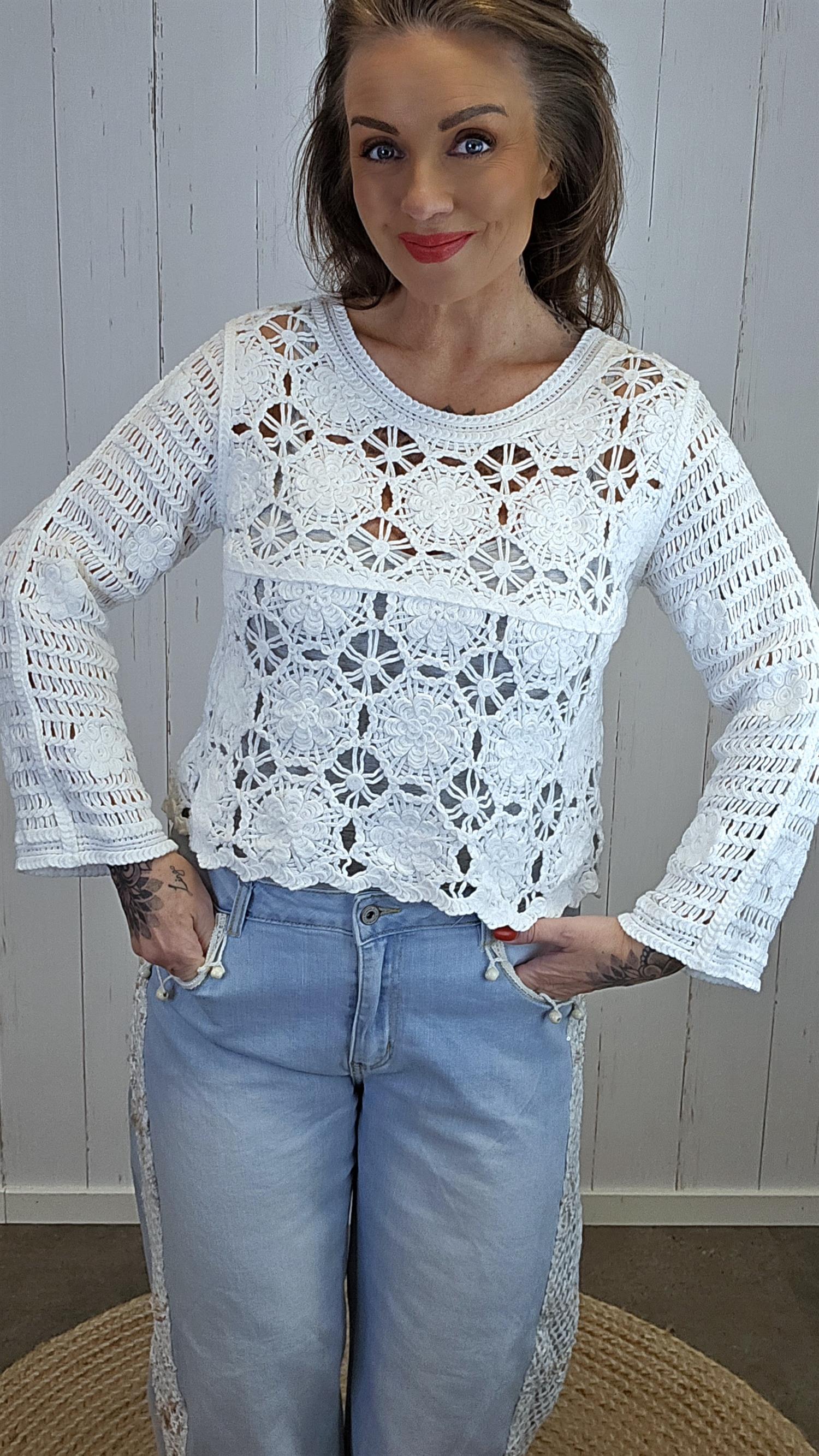 Dekorativ blondetopp i kraftig, heklet blonde med gjennombrutt mønster. Toppen har lange ermer og en lett A-formet fasong som gir et feminint og luftig uttrykk. Perfekt alene med en enkel topp under, eller som et lag-på-lag-plagg over kjole eller singlet.