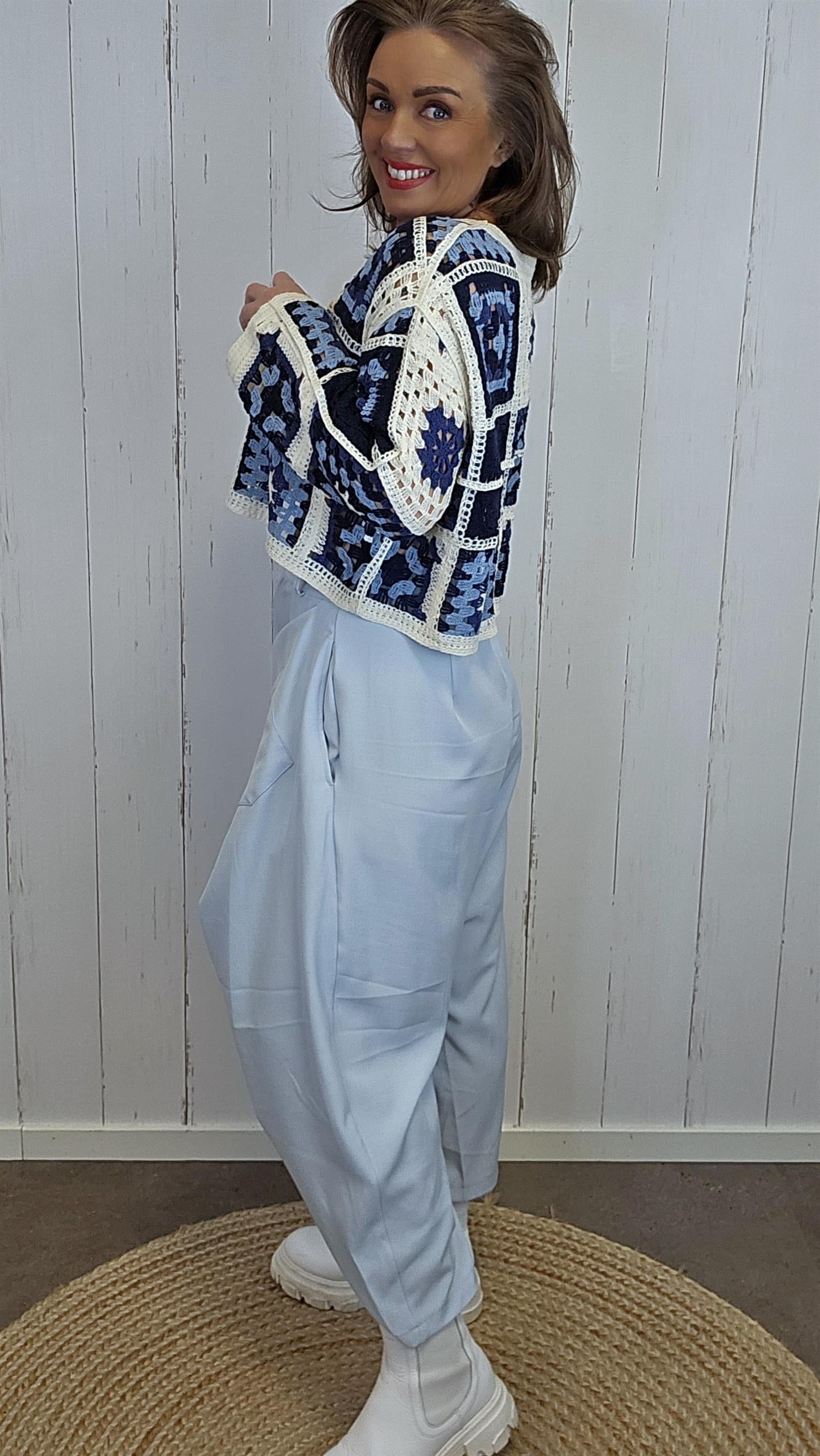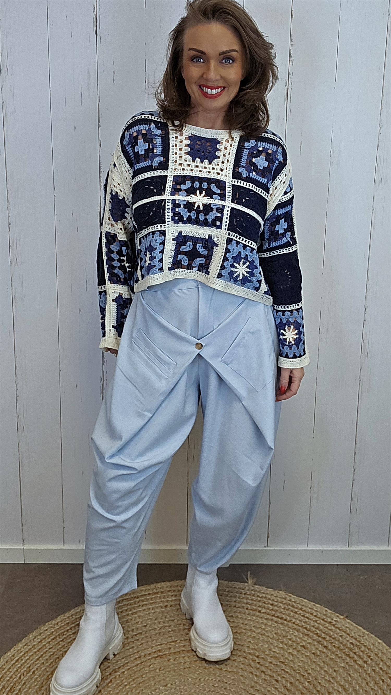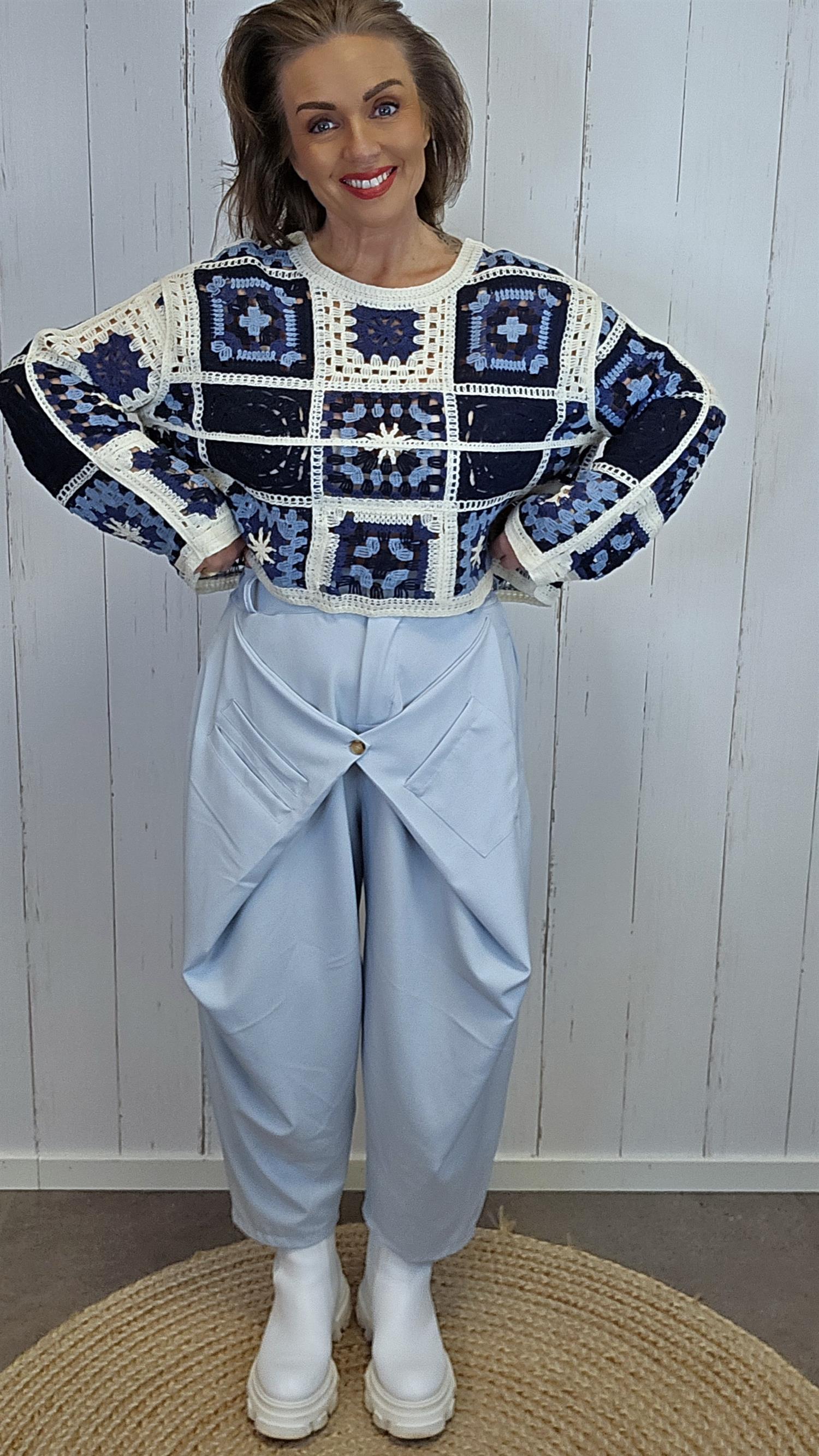 Tiril er en stilren og komfortabel bukse med en spennende omslagsdetalj i front. Buksen har beltestropper, knapp og glidelås, og en flatterende passform med strikk i livet fra sidene og bak – ikke i front. Dette gir et pent uttrykk foran samtidig som den er behagelig å bruke. Omslagsdelen har én lomme og én praktisk innerlomme, mens motsatt side har én romslig lomme.