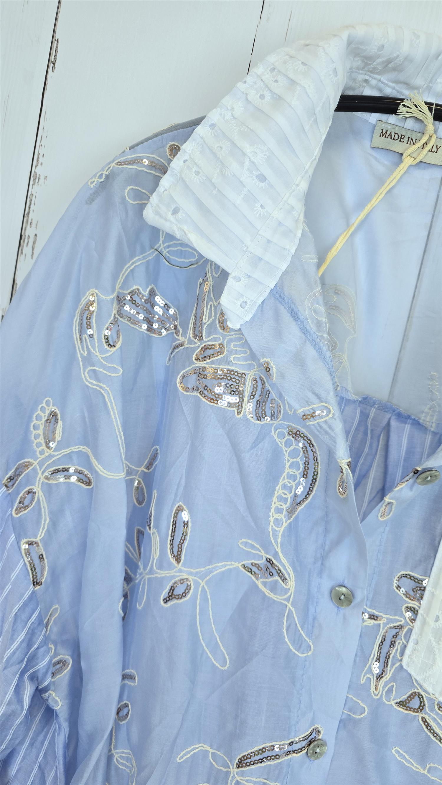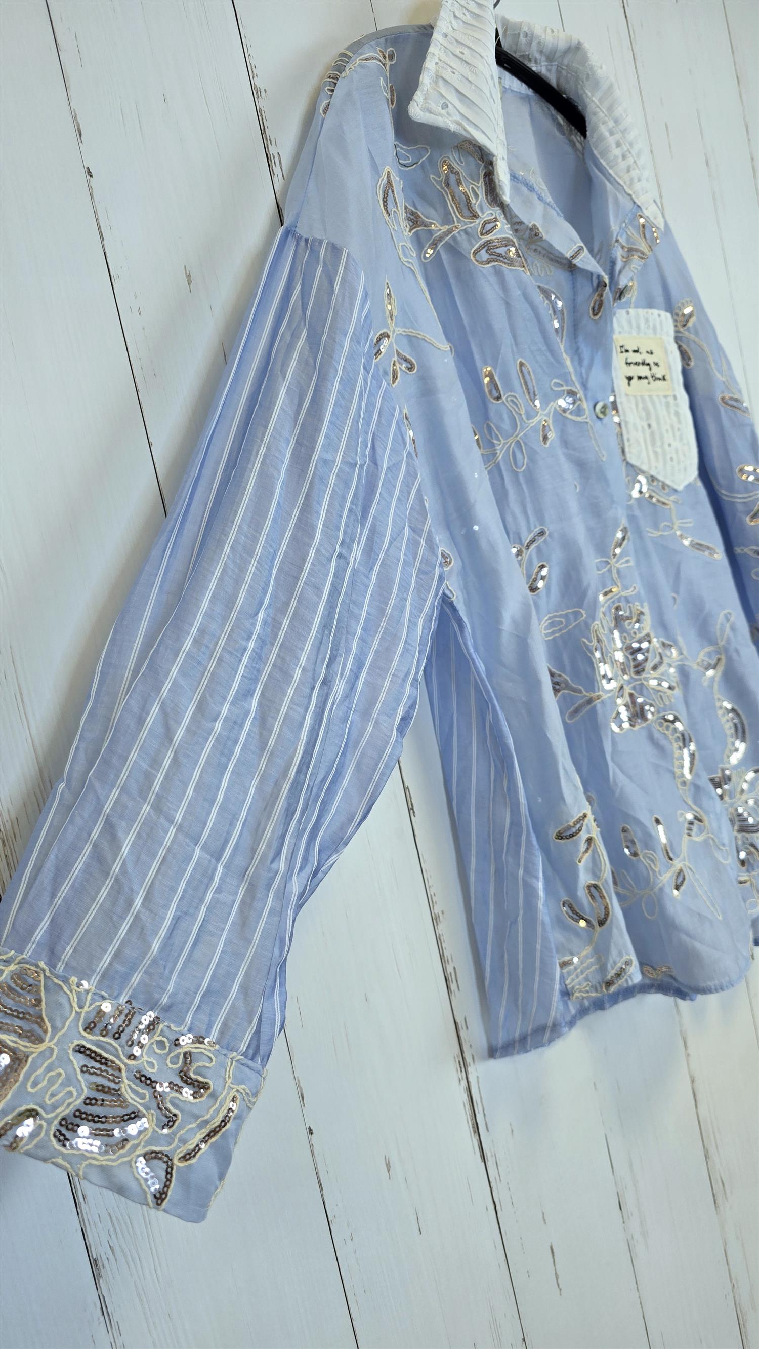 Lisa er en lett og luftig skjorte i en delikat lyseblå farge, dekorert med broderte blomsterdetaljer og små paljetter som gir et eksklusivt og feminint uttrykk. Skjorten har krage, knapper i front og en brystlomme med dekorativ tekstdetalj. Perfekt både til hverdags og når du ønsker å pynte opp antrekket litt ekstra.