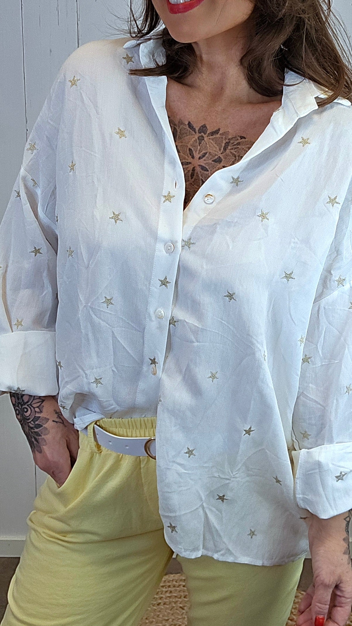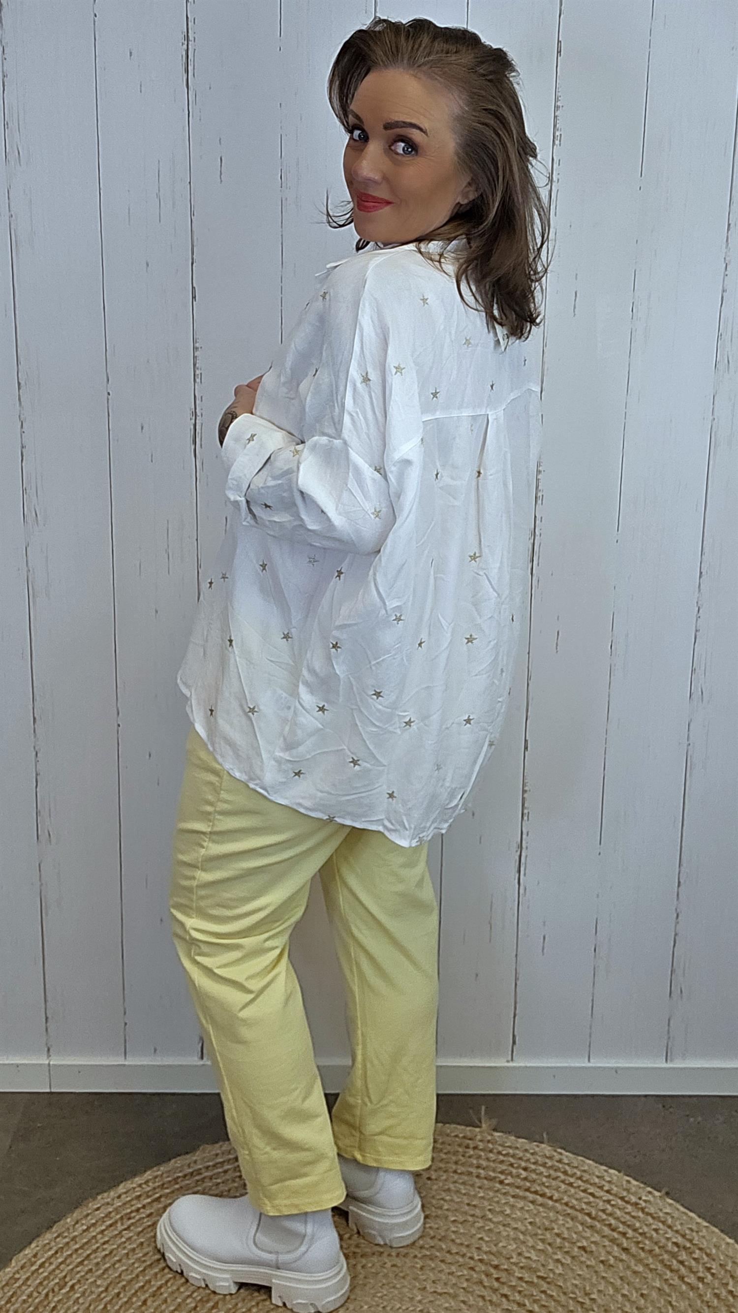 En lett og luftig skjorte i ren bomull, dekorert med små broderte stjerner som gir et diskret, men lekent uttrykk. Skjorten har klassisk krage, knapper i front og lange ermer som enkelt kan brettes opp. Fasongen er avslappet og behagelig, perfekt både til hverdag og litt penere anledninger.