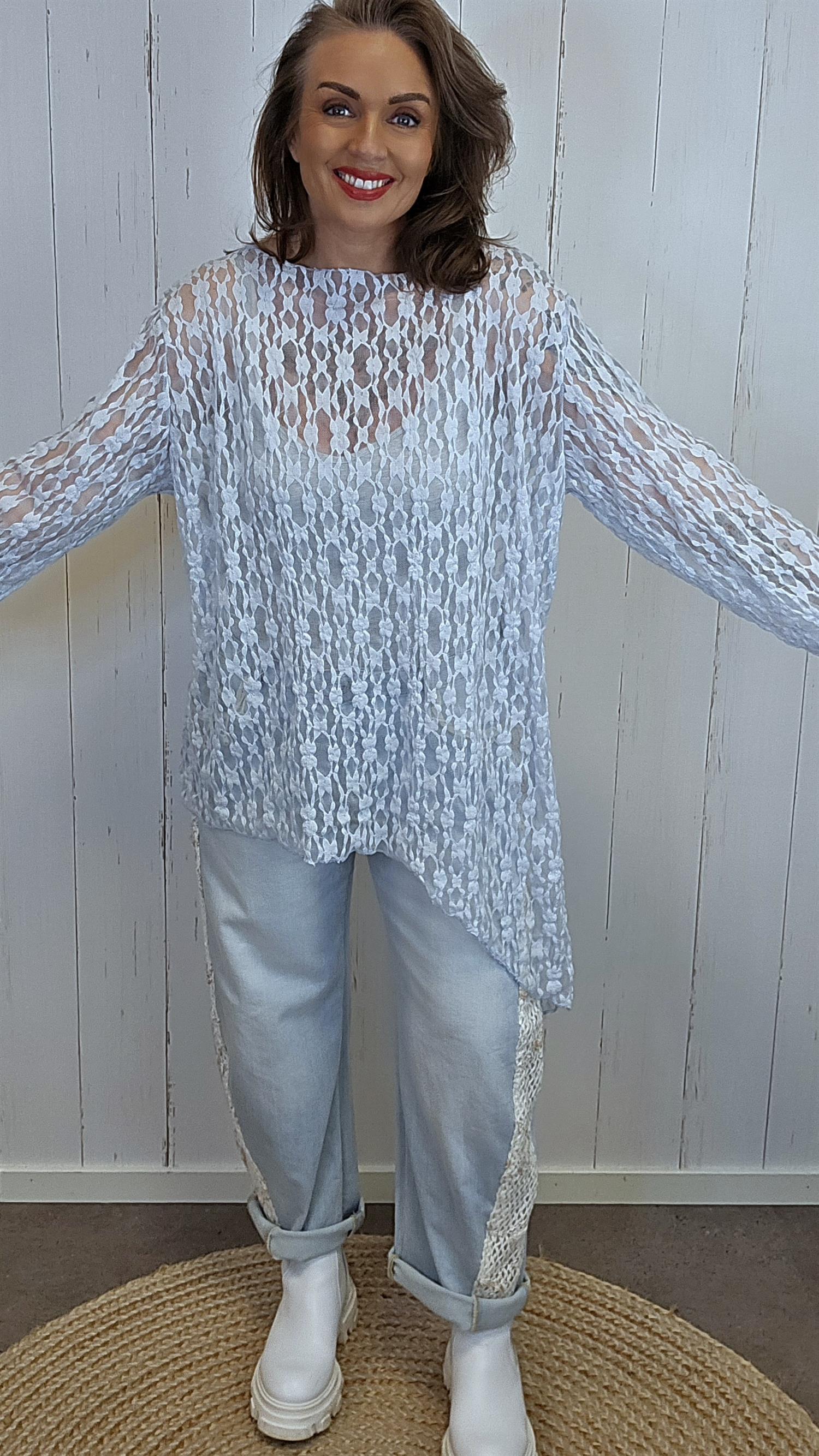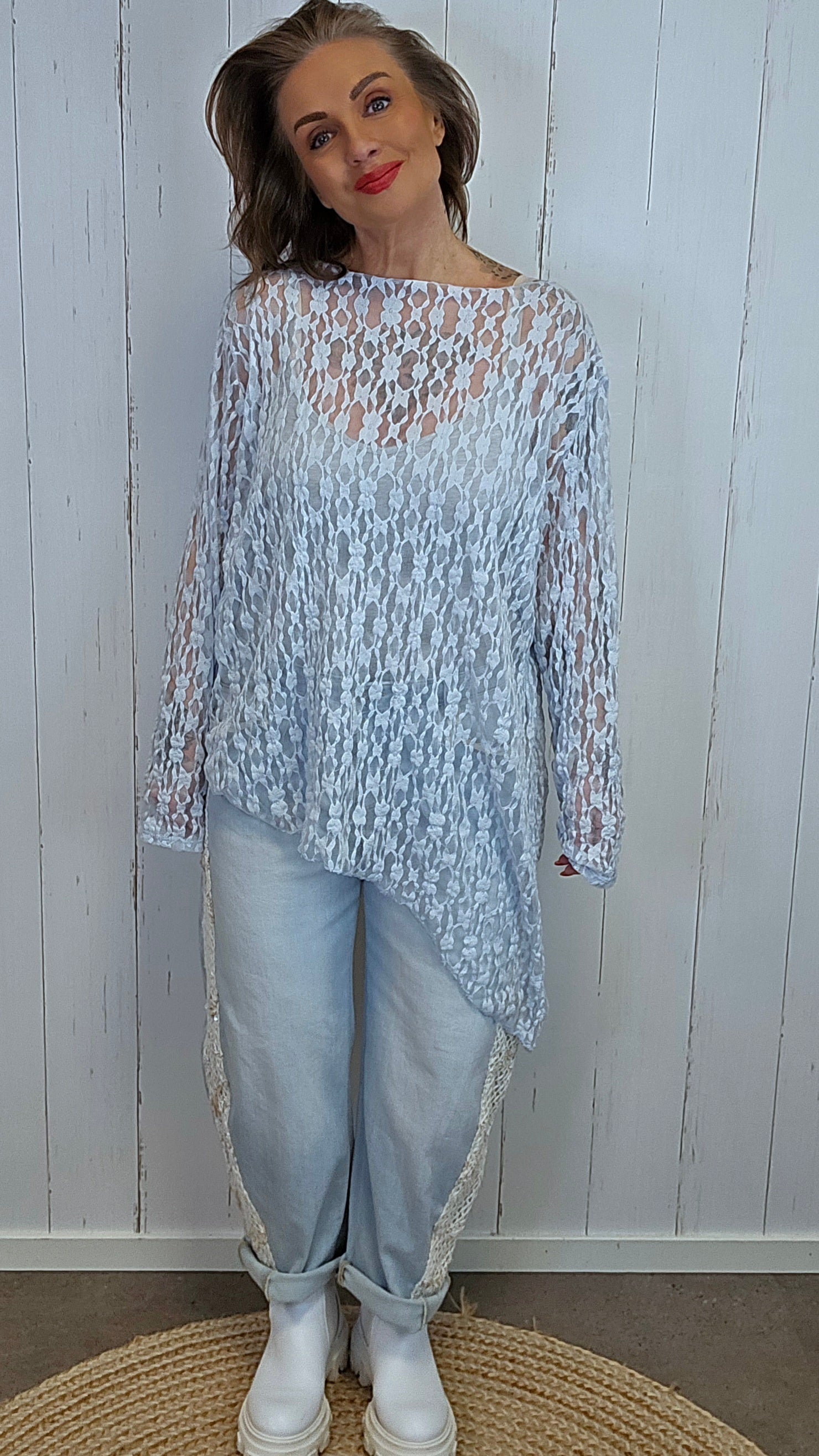 En elegant og feminin blondetopp med lett gjennomsiktig struktur og vakkert mønster i stoffet. Toppen har lange ermer og en asymmetrisk avslutning nederst som gir et moderne og spennende uttrykk. Passformen er avslappet og luftig, perfekt både til hverdagsbruk og mer pyntede anledninger. Like fin over en enkel singlet som alene med en pen BH eller topp under.