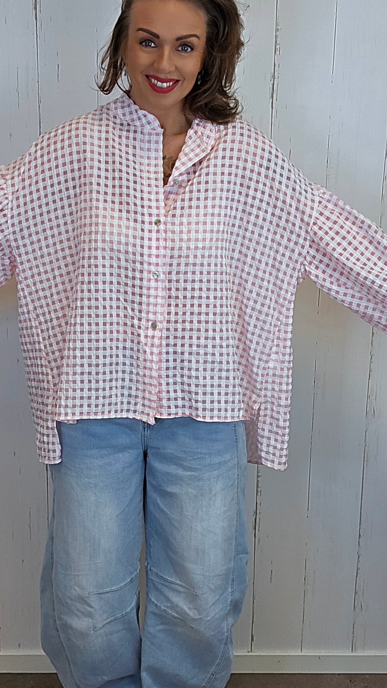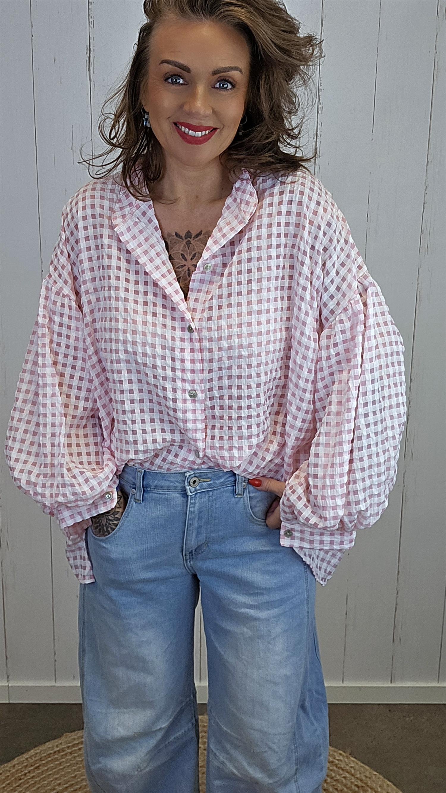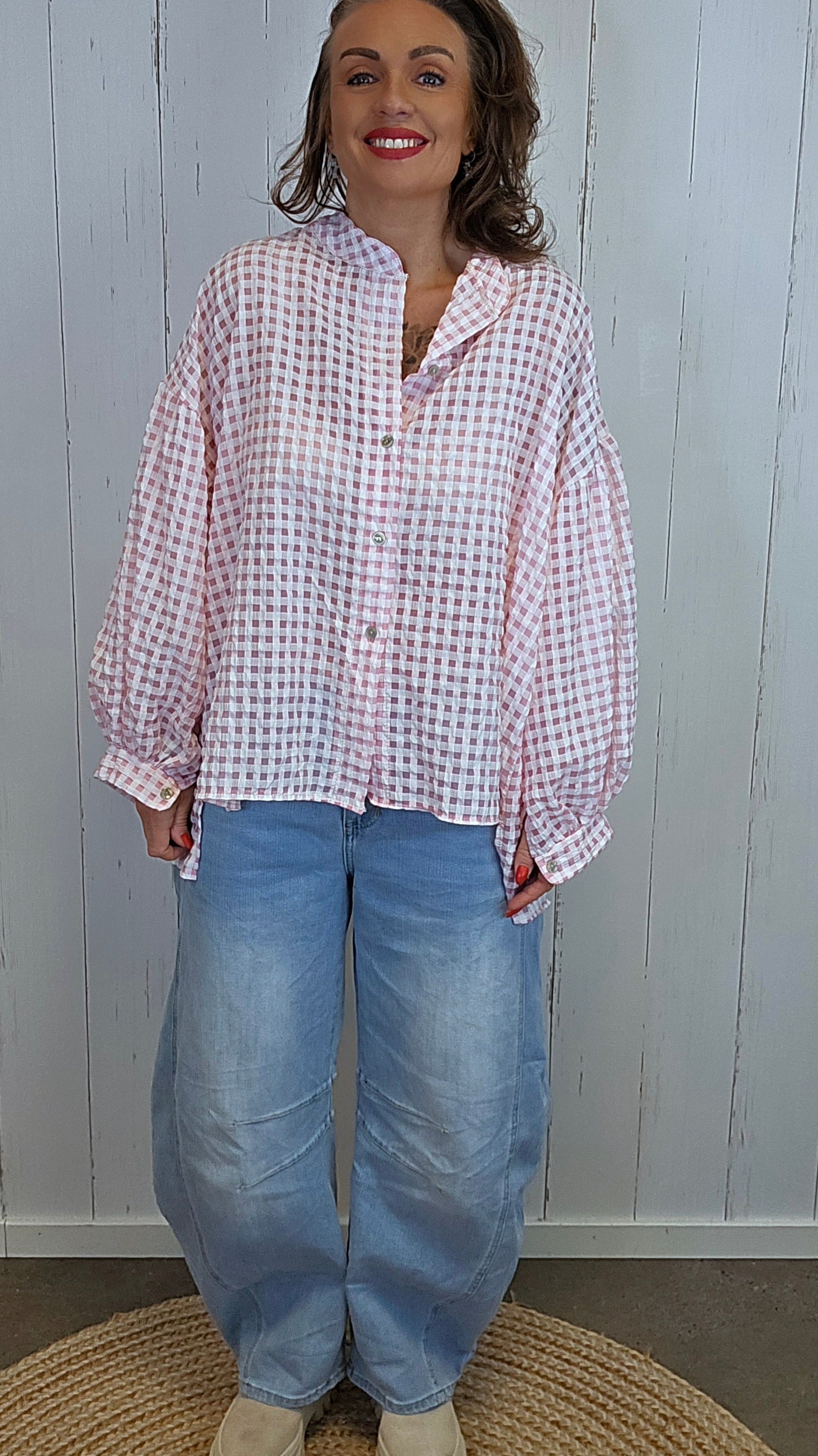 Rutete skjorte i lett og behagelig bomullskvalitet. Modellen har en avslappet fasong med knapper i front og lange ermer. Skjorten faller pent og er enkel å bruke både lukket og åpen over en topp.