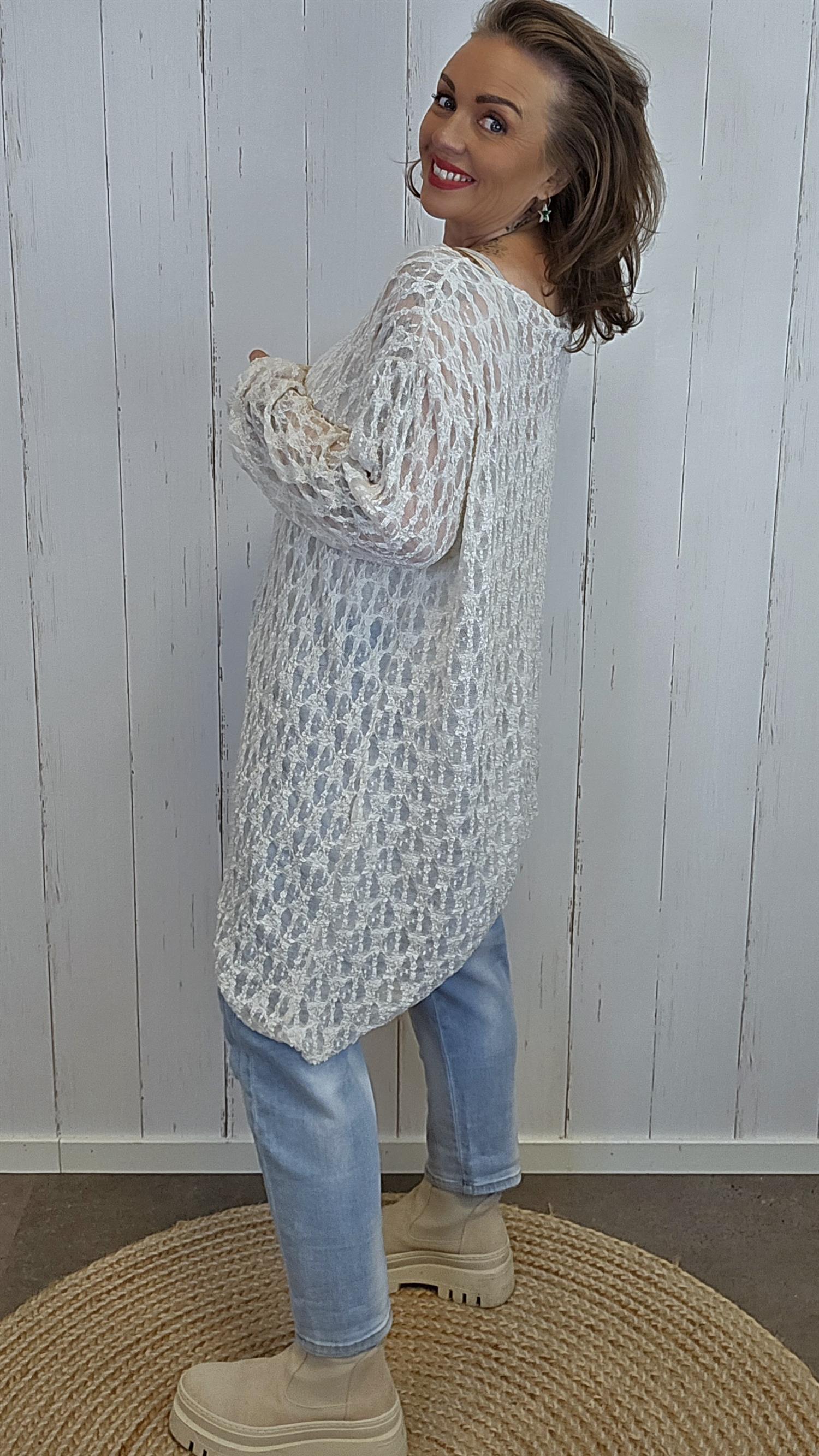 En elegant og feminin blondetopp med lett gjennomsiktig struktur og vakkert mønster i stoffet. Toppen har lange ermer og en asymmetrisk avslutning nederst som gir et moderne og spennende uttrykk. Passformen er avslappet og luftig, perfekt både til hverdagsbruk og mer pyntede anledninger. Like fin over en enkel singlet som alene med en pen BH eller topp under.