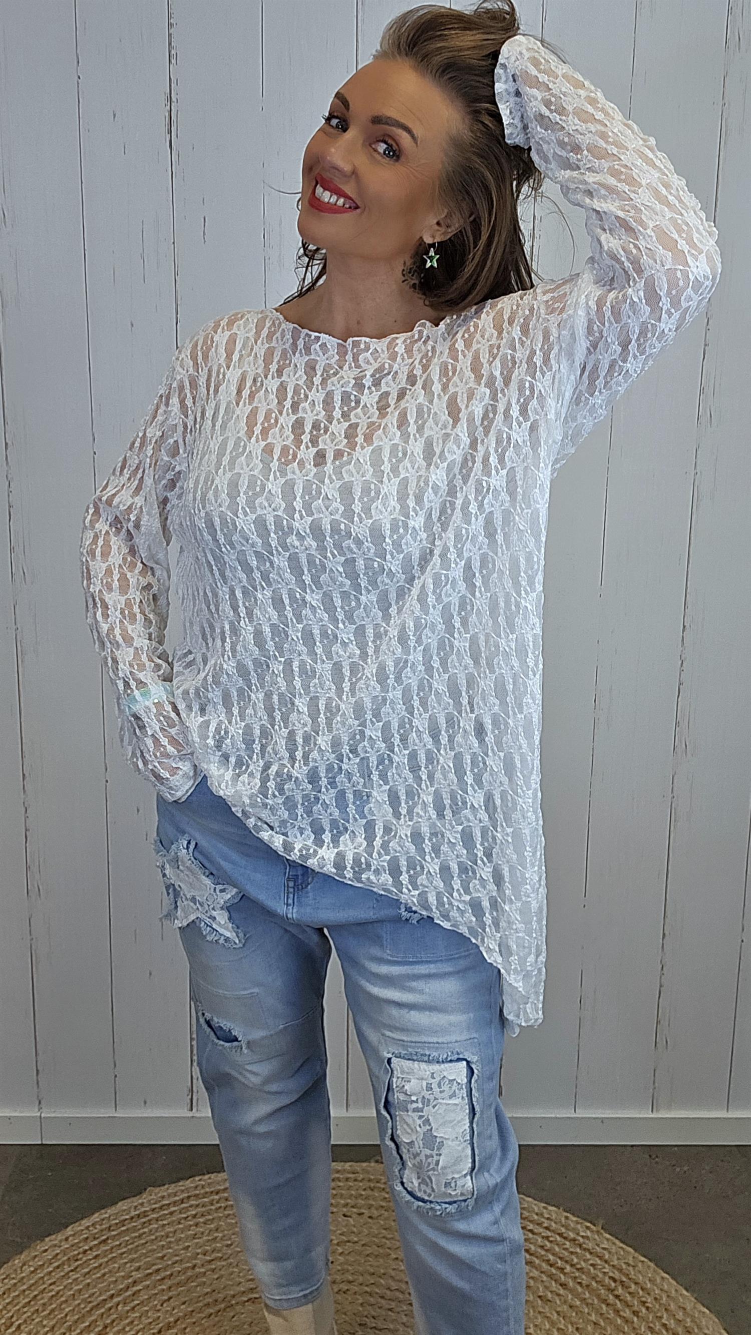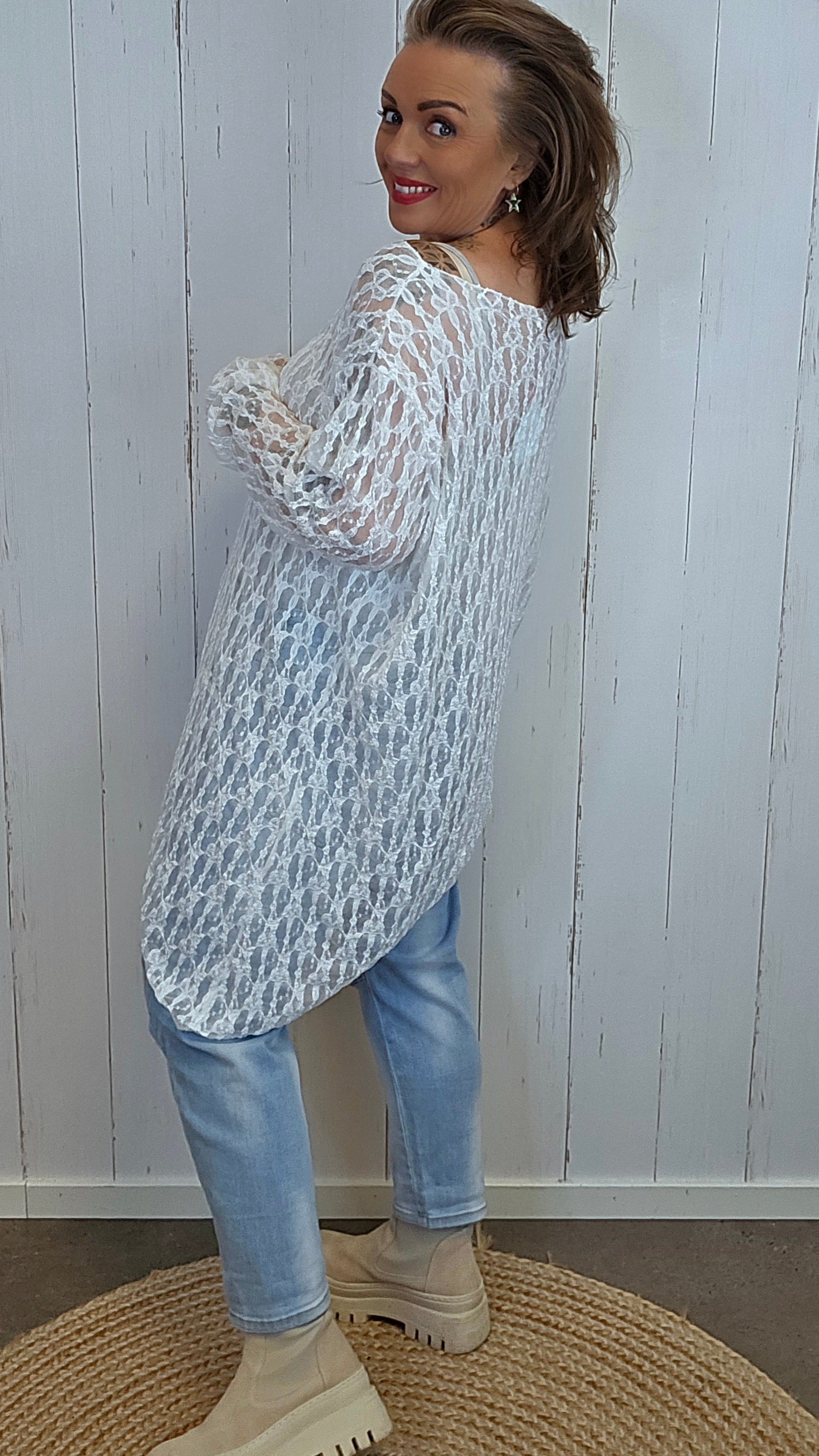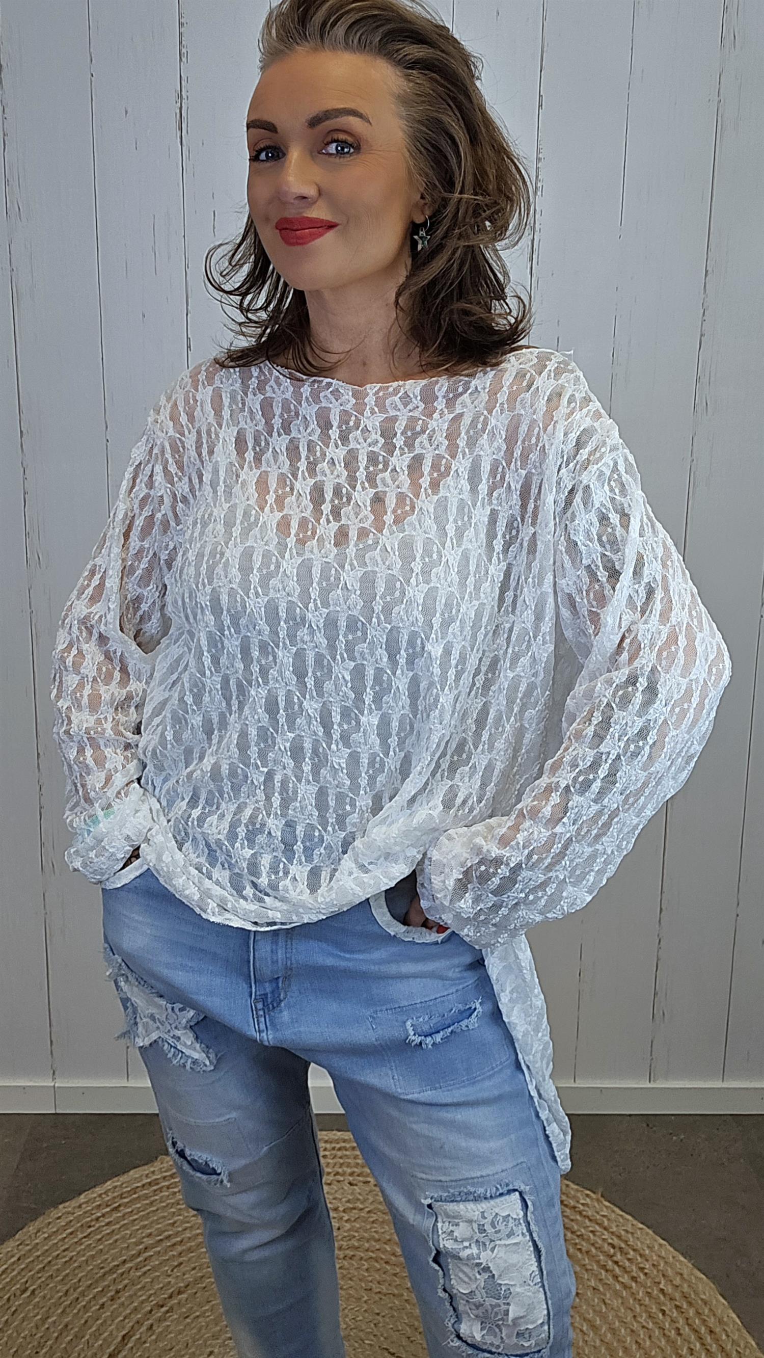 En elegant og feminin blondetopp med lett gjennomsiktig struktur og vakkert mønster i stoffet. Toppen har lange ermer og en asymmetrisk avslutning nederst som gir et moderne og spennende uttrykk. Passformen er avslappet og luftig, perfekt både til hverdagsbruk og mer pyntede anledninger. Like fin over en enkel singlet som alene med en pen BH eller topp under.