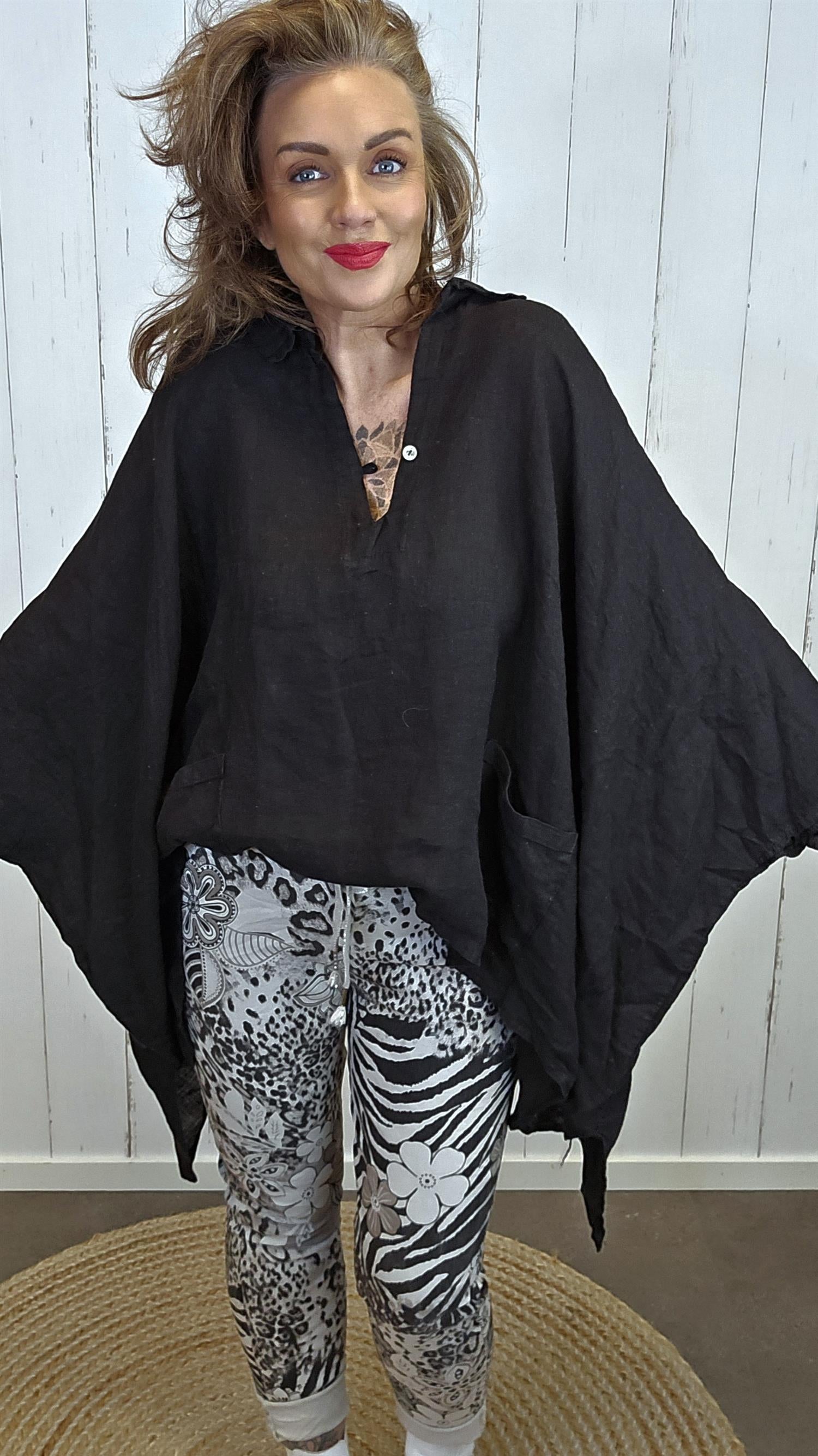 Myk og lett oversized bluse i 100% lin med et avslappet tidløst uttrykk. Modellen har v-hals med krage , lange ermer . Praktiske lommer i front som tilfører både funksjon og en uformell detalj. Et perfekt plagg for deg som liker rene linjer og komfort med karakter.