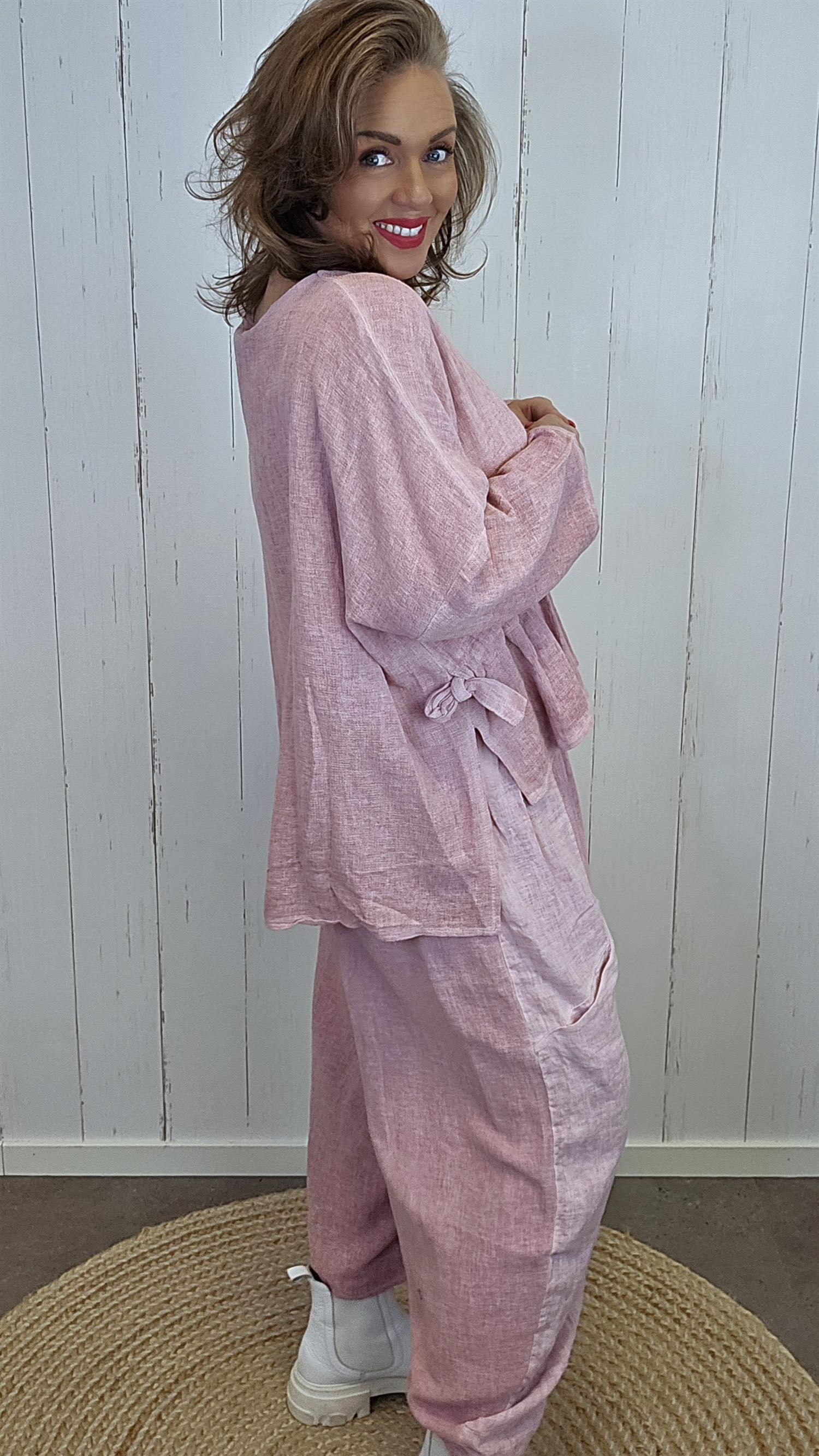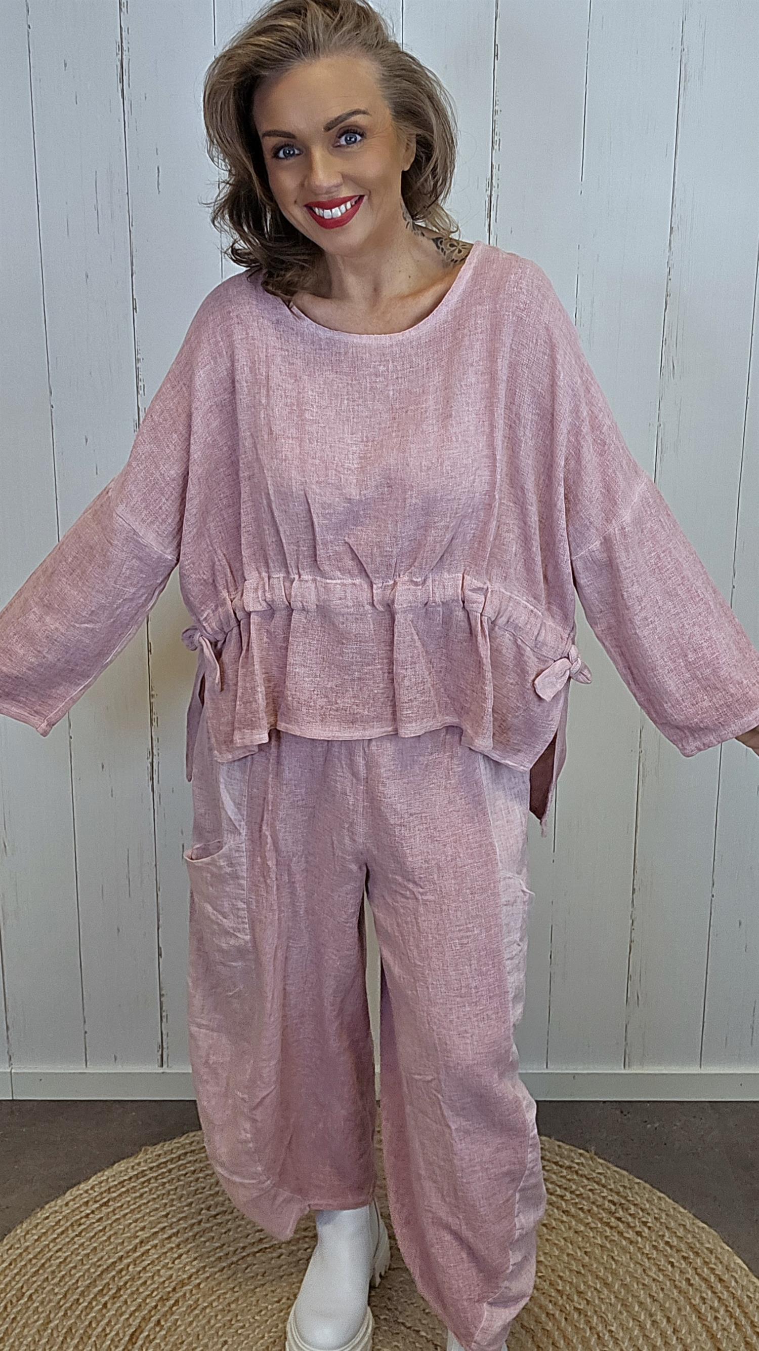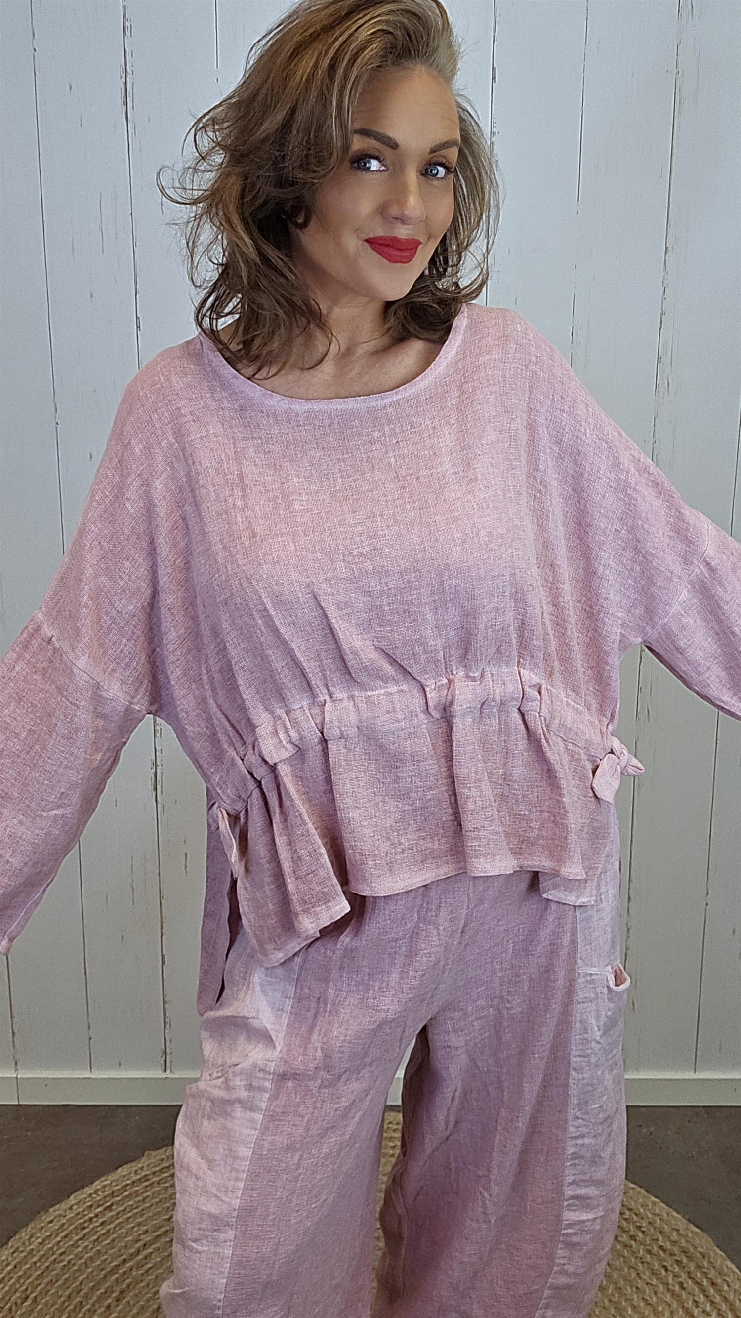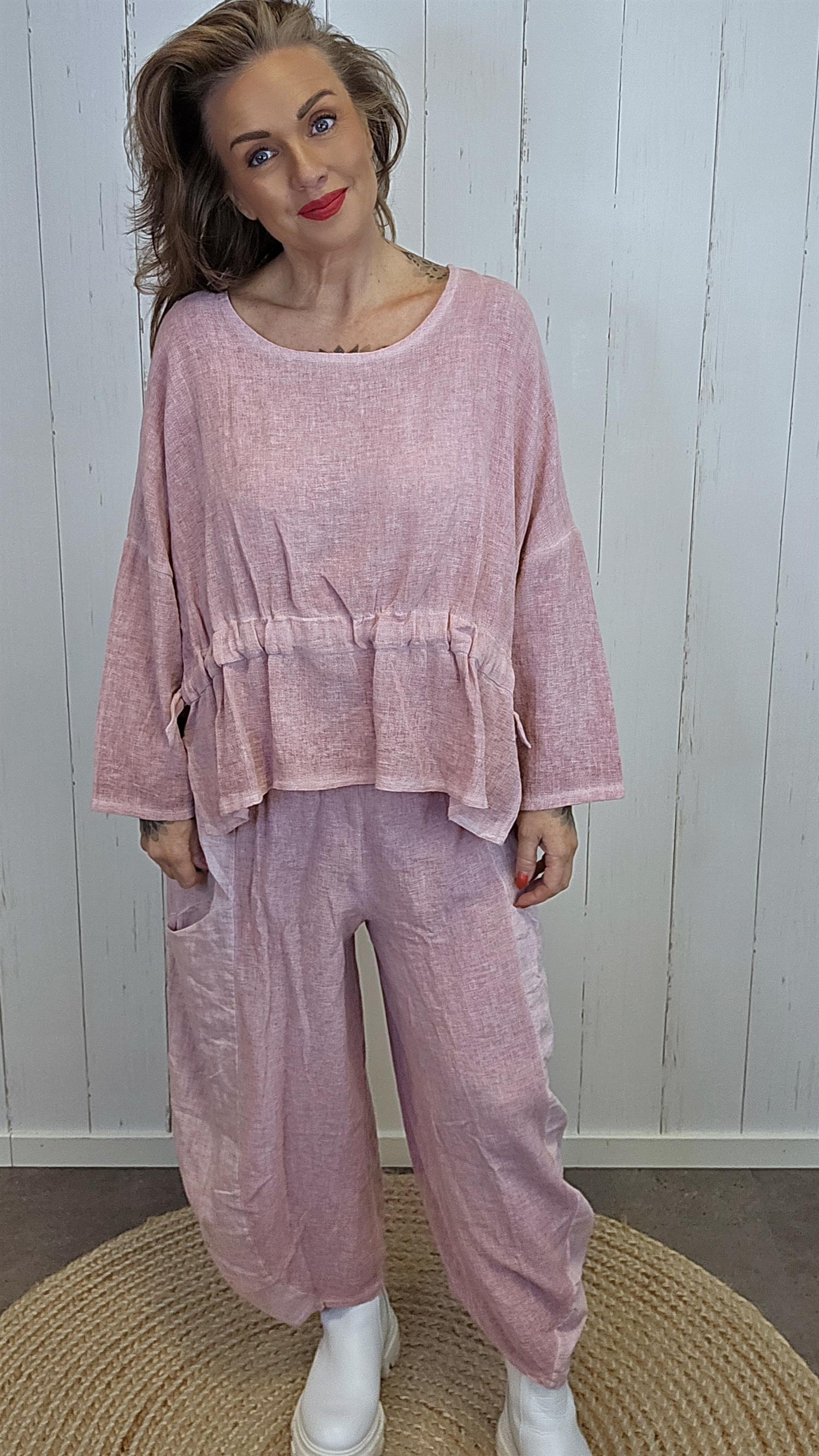 Lekker topp med rund hals i en litt grovere lin- og bomullskvalitet som gir et naturlig og eksklusivt uttrykk. Toppen har herlig vidde i ermene og en ekstra kul detalj i front med knyting og rynking, som gir en feminin og moderne fasong. Modellen er kortere i front og lengre bak, noe som gir et flott fall og en flatterende silhuett.
