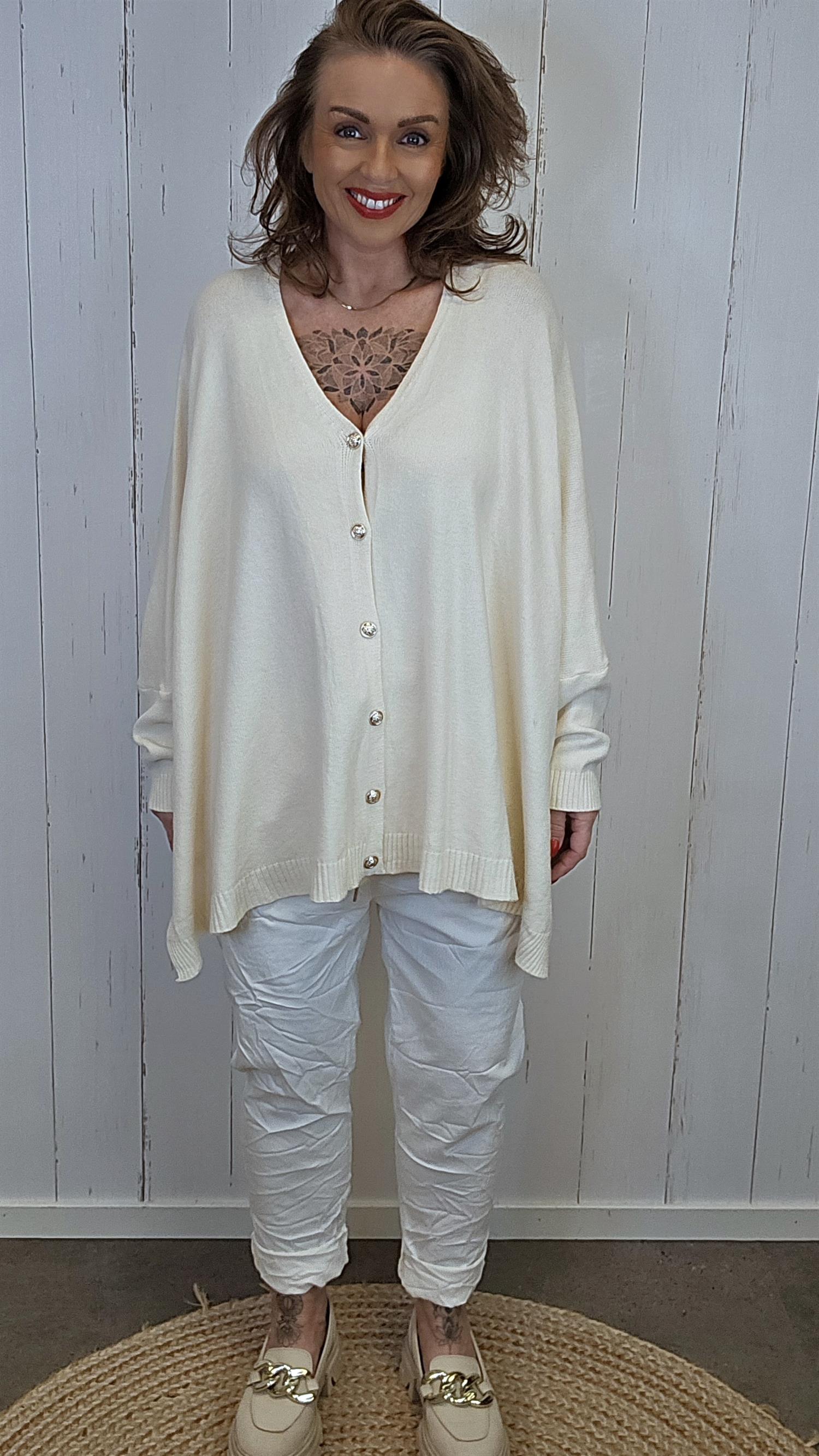 En utrolig fin genserjakke med knapper hele veien ned, som kan styles både som genser og som lett jakke. Den har en bling-stjerne bak i nakken, dyp v-hals og splitter i sidene. Modellen er superbaggy, faller tungt og er laget i et stretchy materiale som gir en flatterende og komfortabel passform.