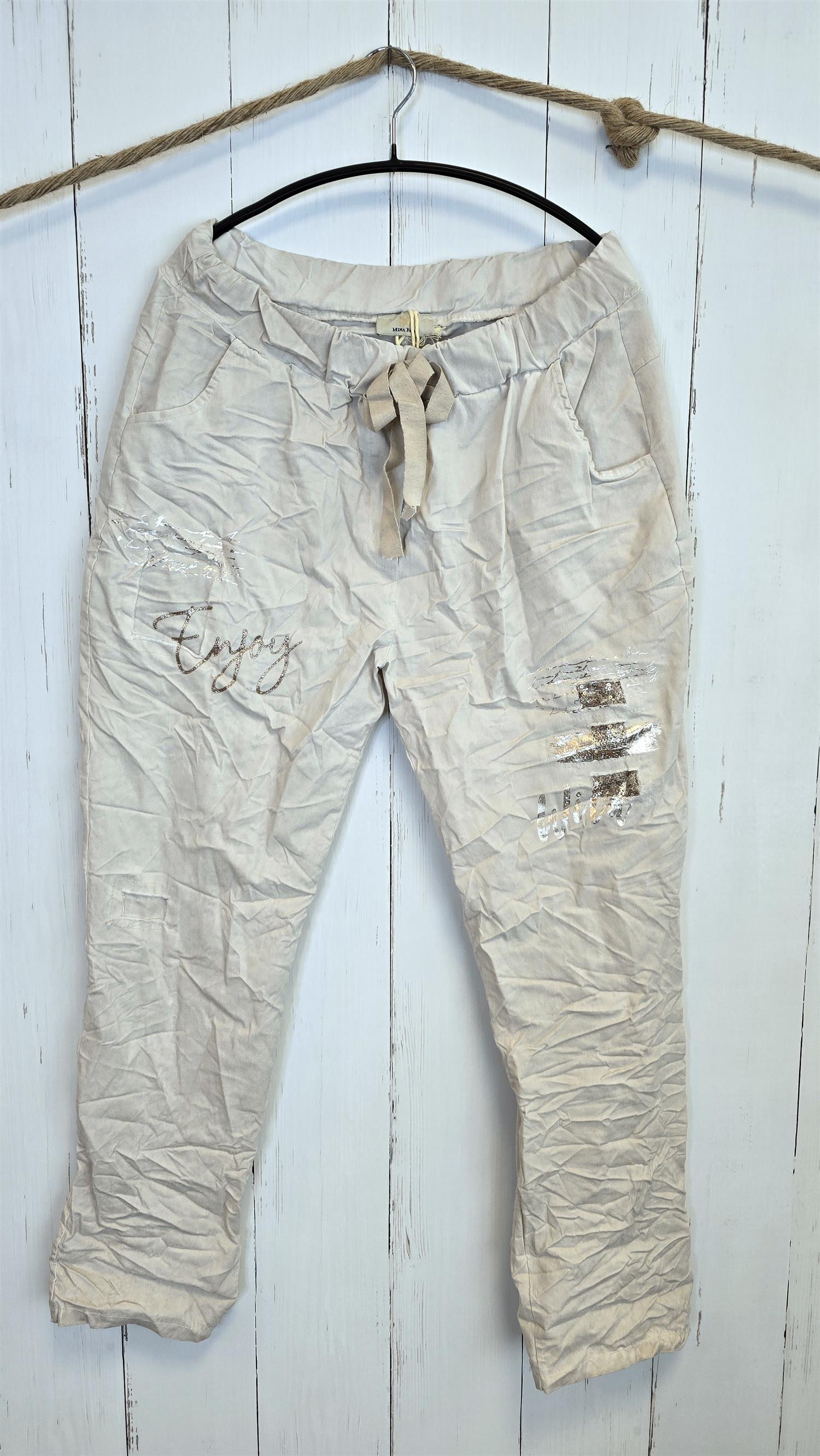 En avslappet og komfortabel bukse med dekorative detaljer som gir et unikt uttrykk. Buksen har strikk i livet med knyting, noe som gjør den enkel å tilpasse. Den er utstyrt med lommer både i front og bak, og har subtile print- og paljettdetaljer som gir et moderne preg uten å bli for mye.