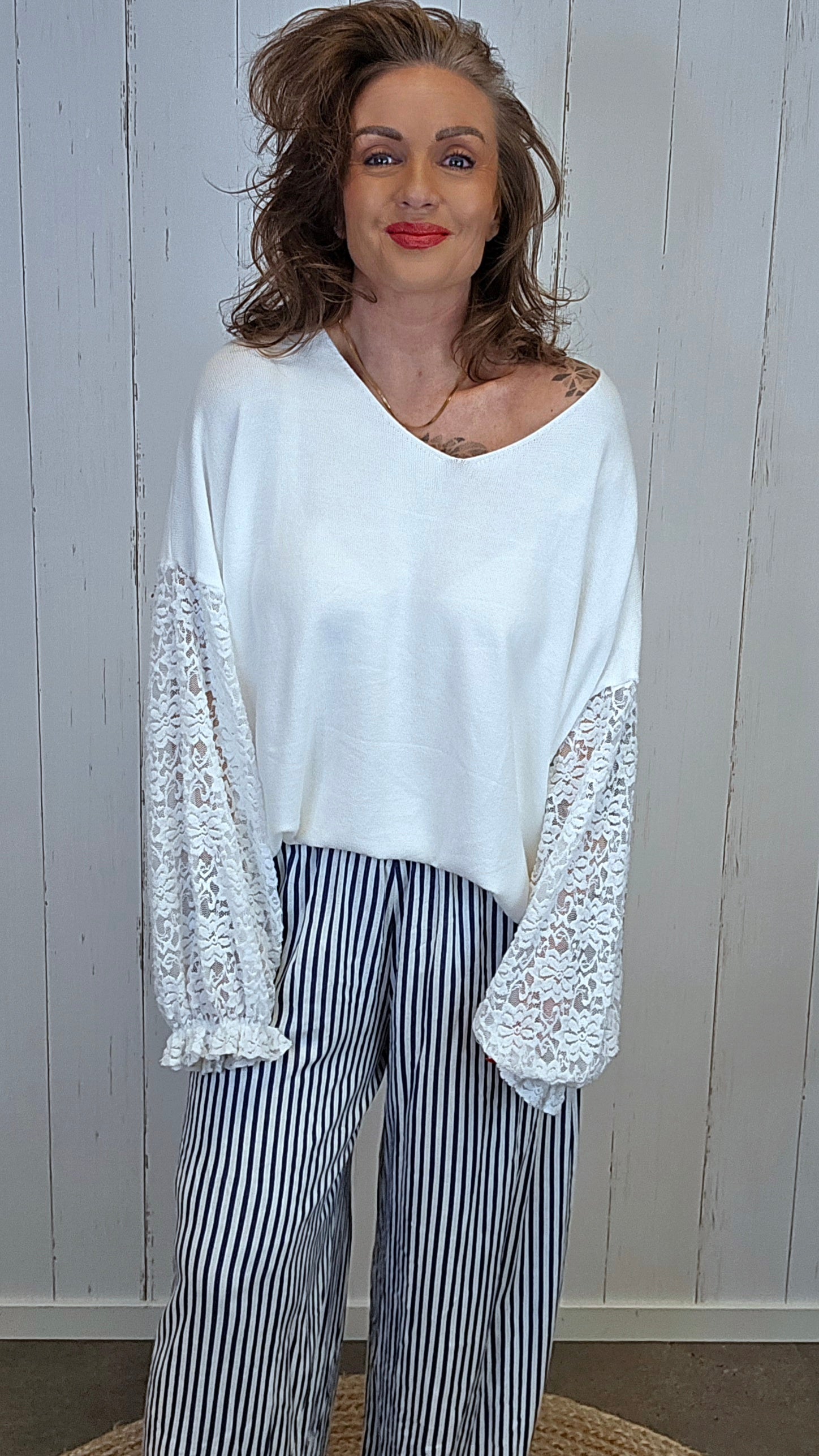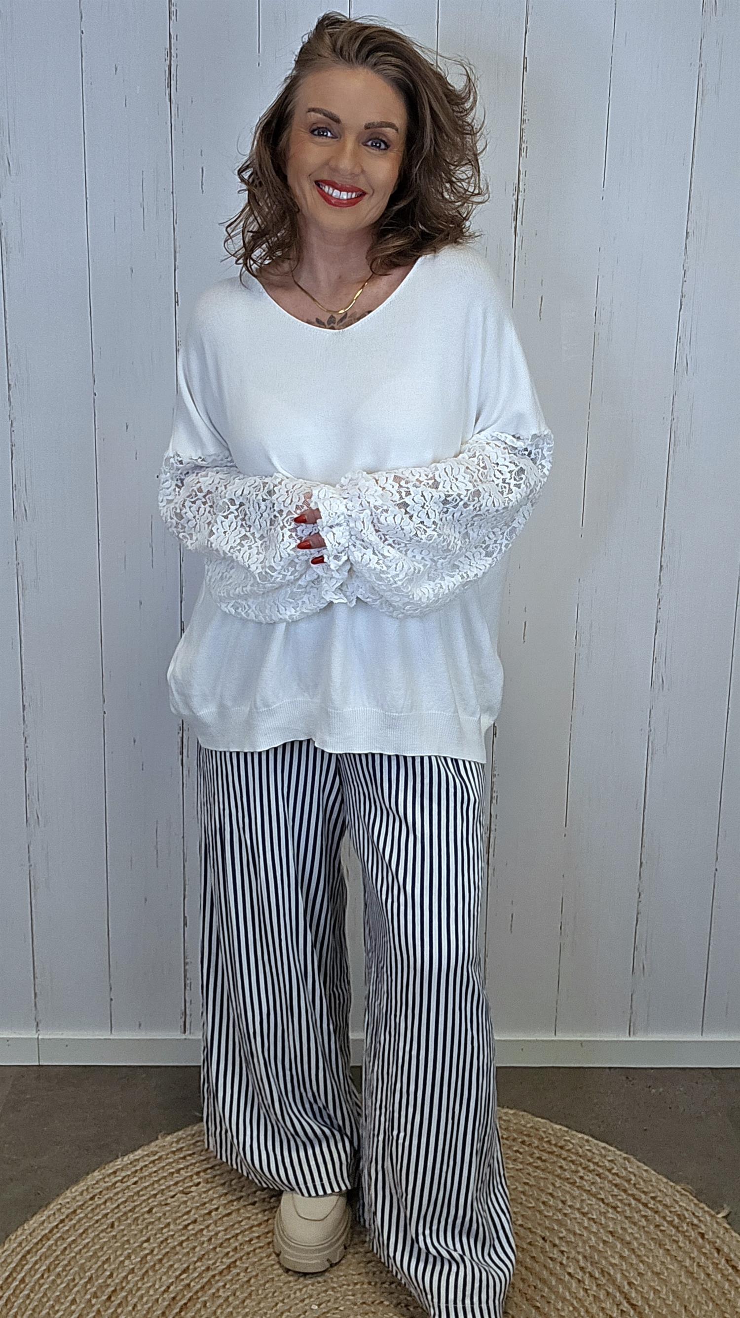 Denne toppen har et mykt og behagelig uttrykk med dekorative blondedetaljer på ermene som gir et feminint og lett preg. Stoffet faller pent og gir god komfort gjennom hele dagen. Blondene på ermene tilfører et elegant element som gjør plagget like fint til hverdags som til mer pyntede anledninger.