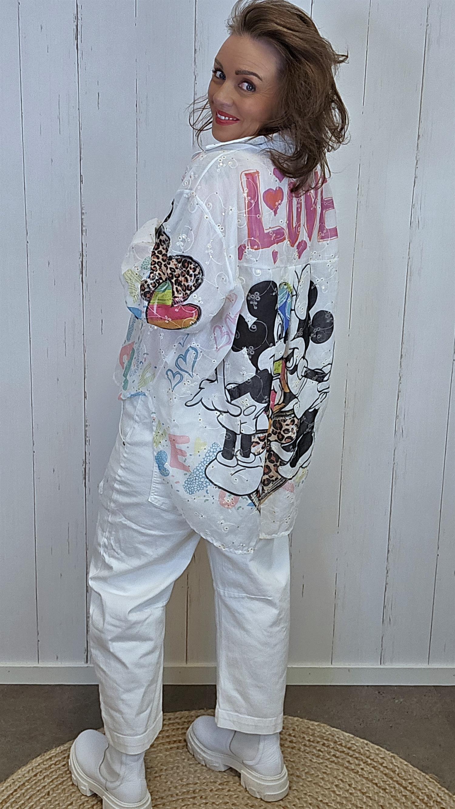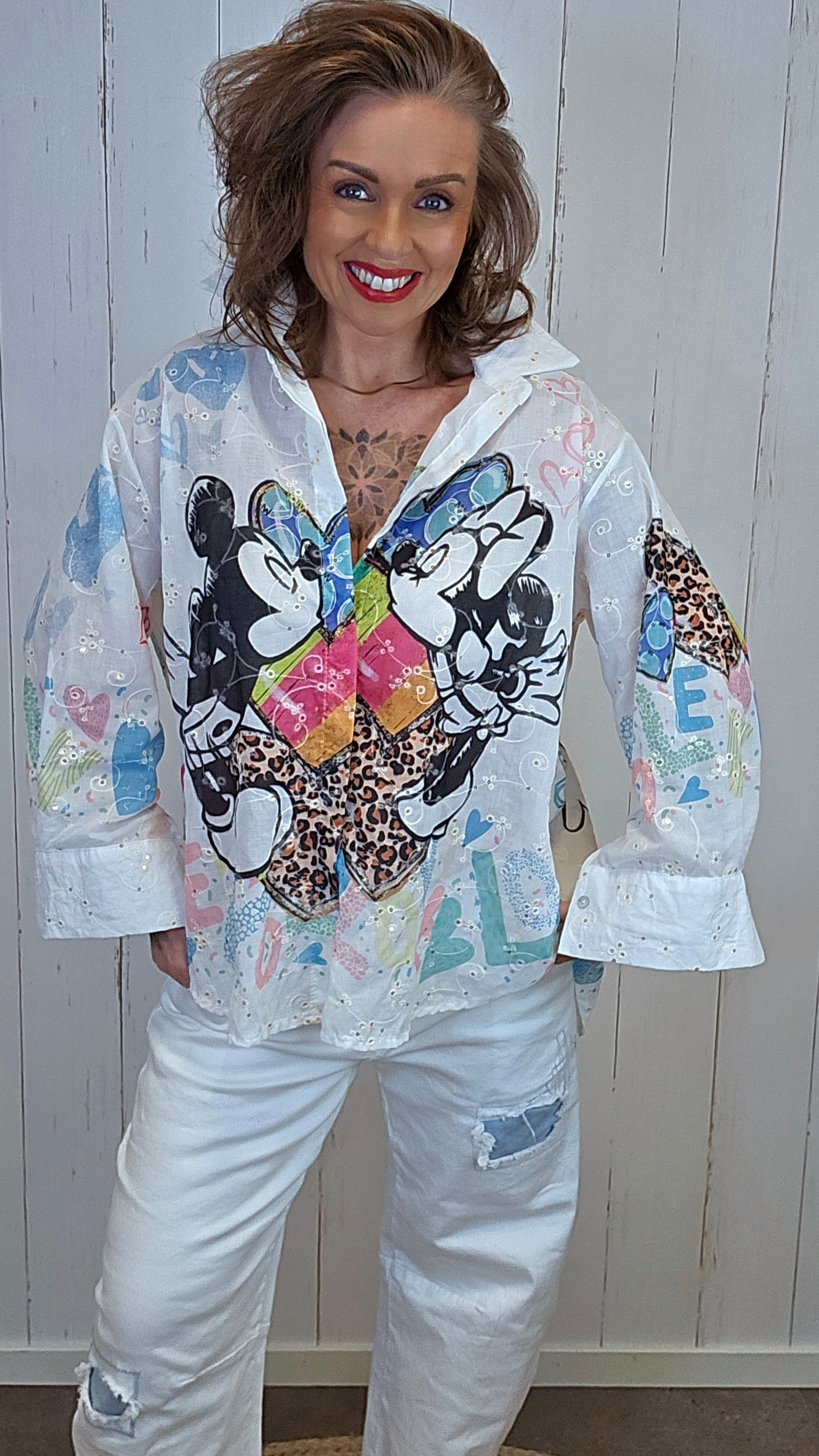 Lett og luftig skjorte i 100 % bomull med delikate broderi- og paljett-detaljar i stoffet. Denne varianten har eit stort og fargerikt Mikke Mus-motiv i front som gir eit tøft og leikent uttrykk. Skjorta har klassisk krage, knappestolpe og lange ermar med mansjett og knapp. Den romslege passforma og gode lengda gjer den behageleg og enkel å kombinere med ulike antrekk.