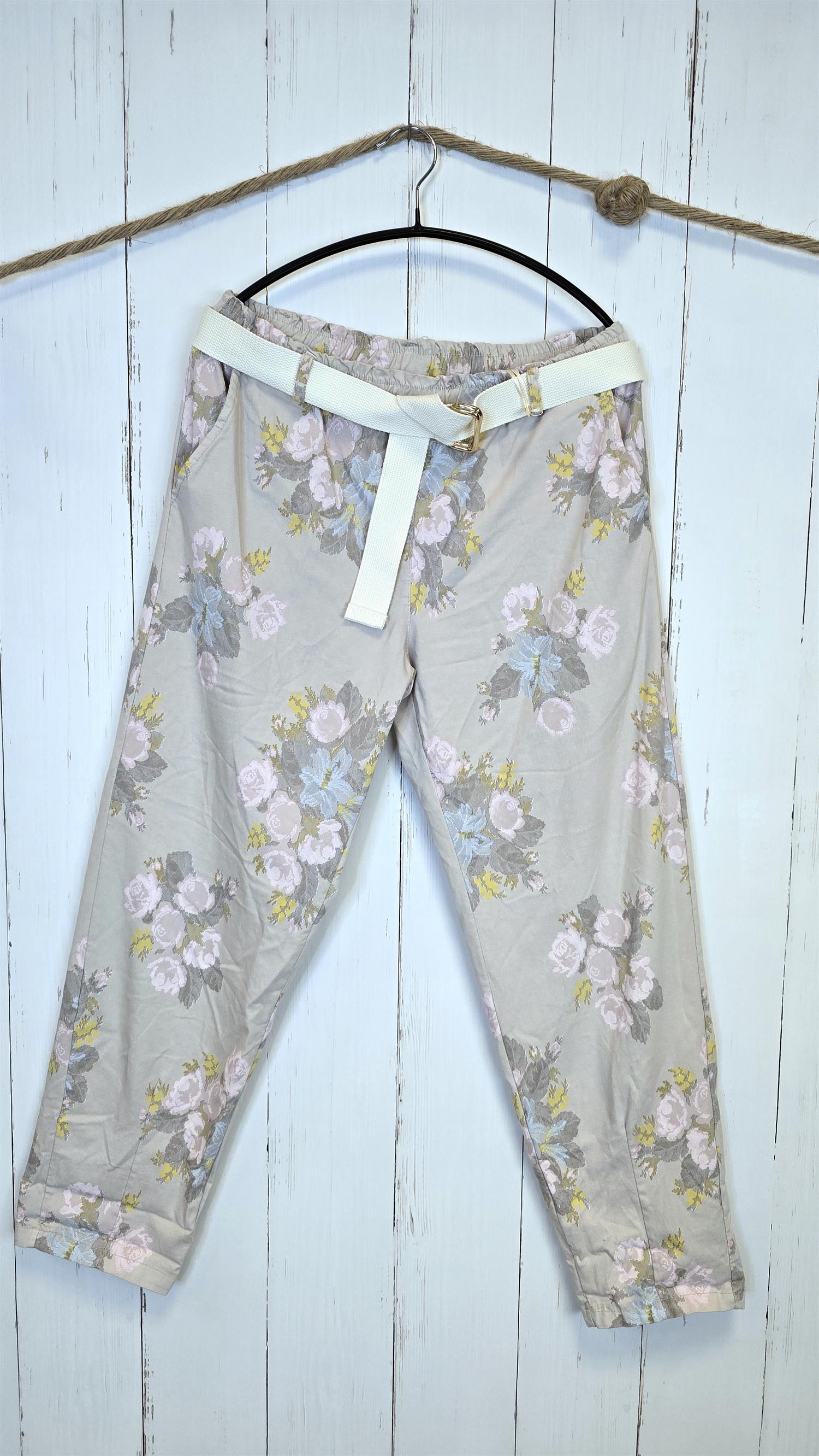 Myk og behagelig bukse med delikat blomsterprint i duse toner. Modellen har strikk i livet som gir fleksibel og komfortabel passform, og belte følger med for en mer definert silhuett.