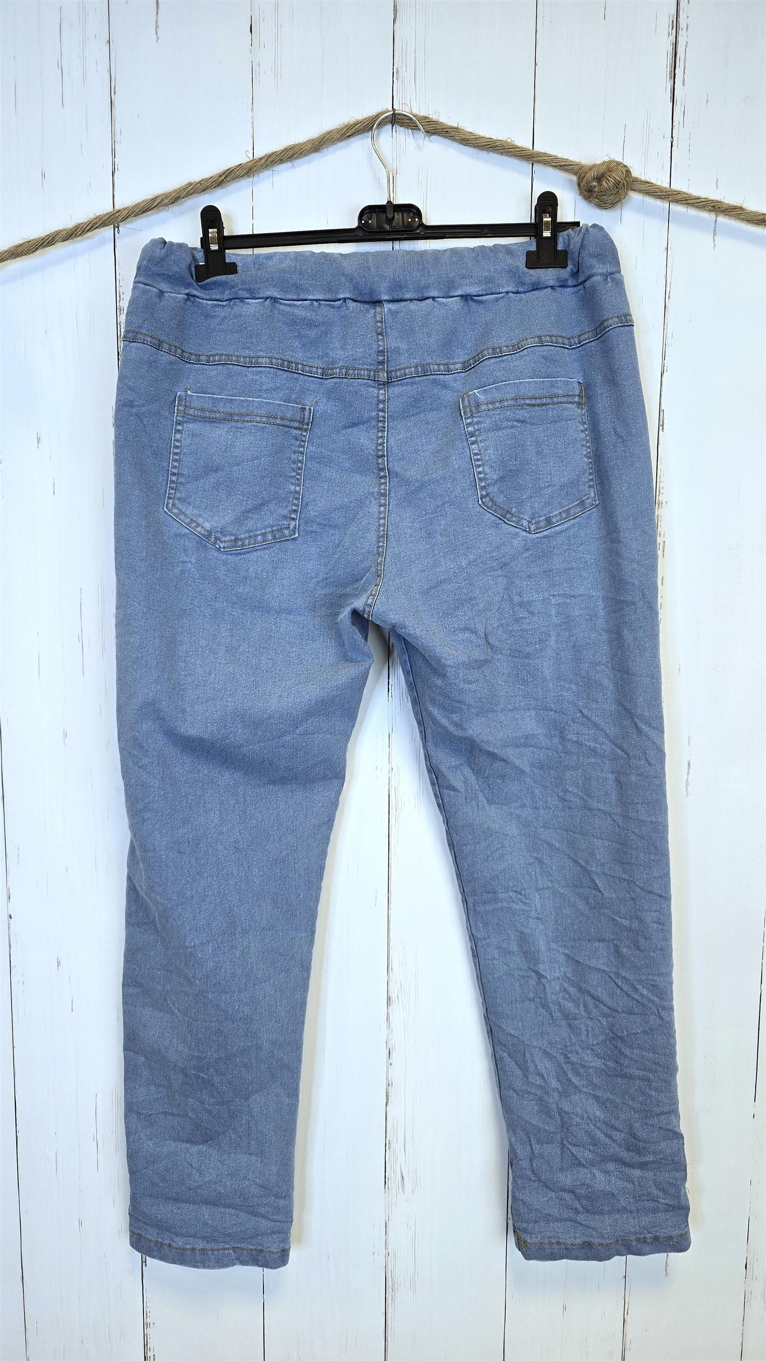Myk og komfortabel denimbukse i lyseblå vask med dekorative hjertedetaljer med bling langs lommene. De små hjerteknappene gir buksen et feminint og lekent uttrykk som skiller seg ut.