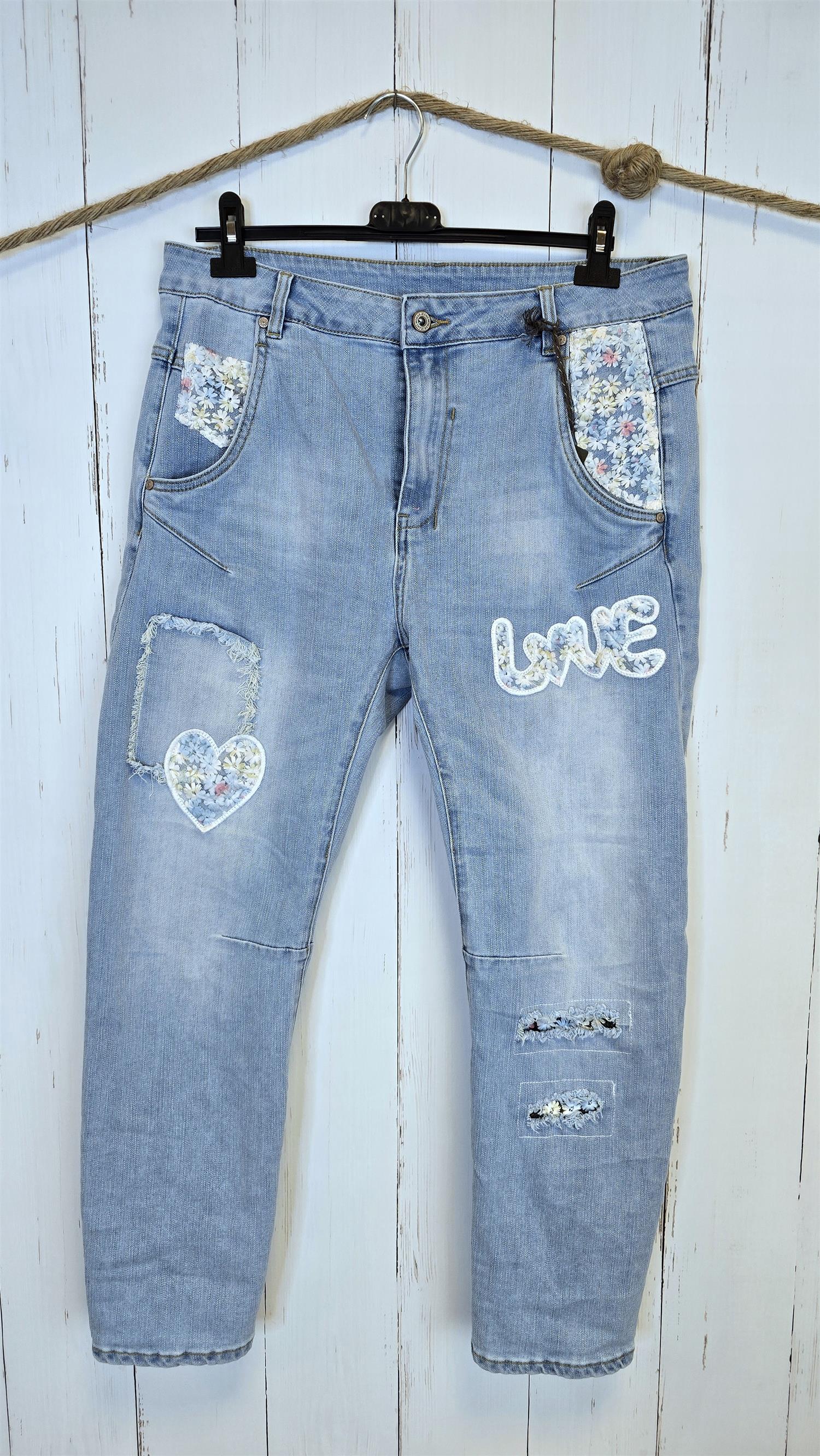 Tøff og feminin denimbukse i lys vask med lekre blomsterdetaljer i lommene og dekorativ “Love”-applikasjon på låret. Modellen har også slitte partier og påsydd hjertepatch som gir et røft, men samtidig romantisk uttrykk.
