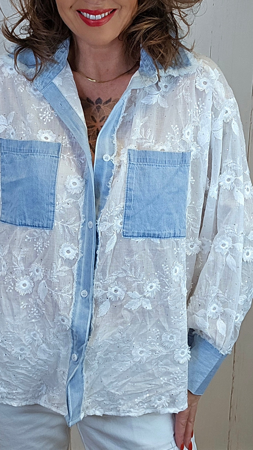 Romantisk og røff på samme tid Denne skjorten kombinerer delikat blondestoff med rå denimdetaljer for en spennende kontrast. Den har klassisk krage, knappelukking i front og to brystlommer i denim. Mansjetter og stolpe er også i denim som gir plagget et moderne uttrykk.