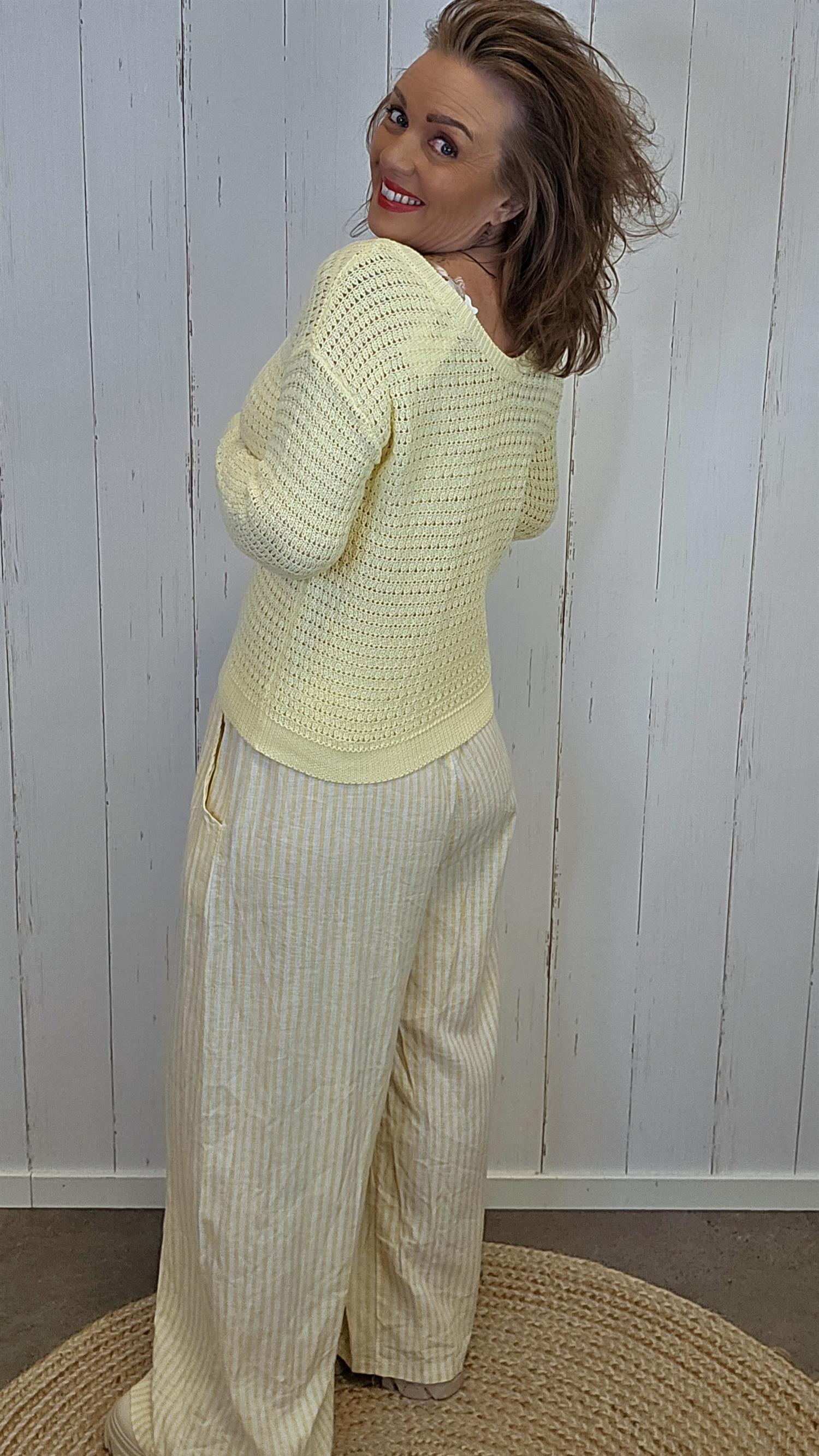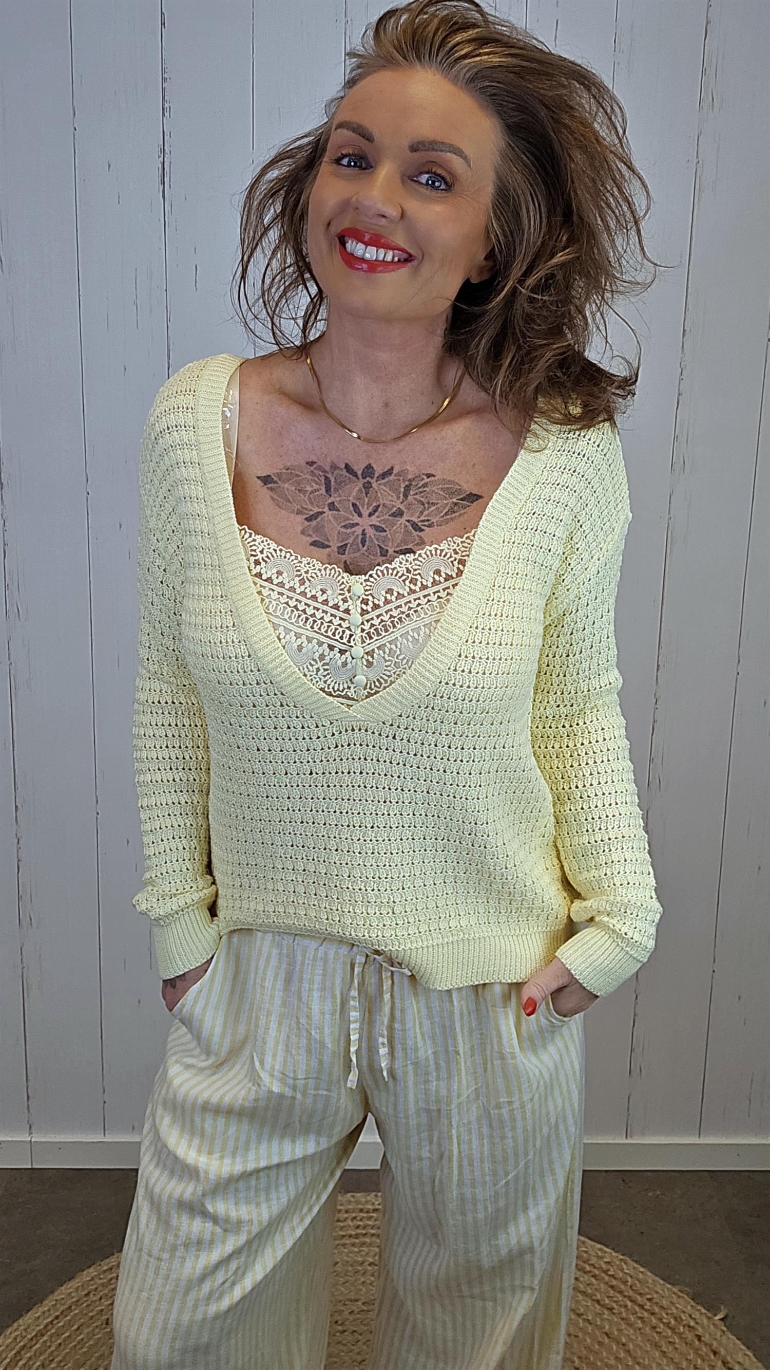 Nydelig strikkegenser i en myk og delikat gulfarge. Genseren har V-hals med vakre hekledetaljer og små dekorative knapper i front som gir et feminint uttrykk. Den har lange ermer og en behagelig, lett struktur i strikken som gjør den luftig og komfortabel på.