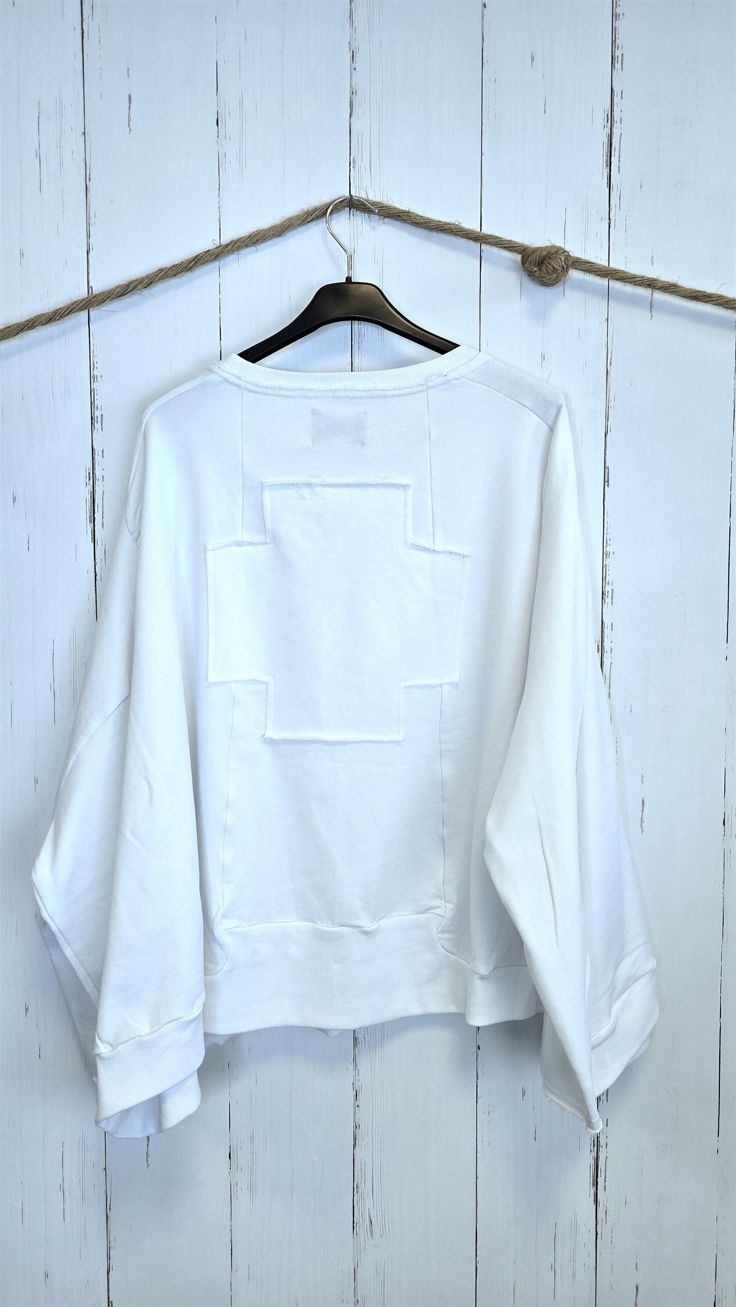 Riktig kul bomullsgenser i myk og behagelig kvalitet. Den har stor rund hals, rå kanter og synlige sømmer som gir et røft og moderne uttrykk. Modellen har lange ermer og et stort, markant plu-merke på ryggen som gjør genseren helt unik. En statement-genser som kombinerer komfort og karakter.