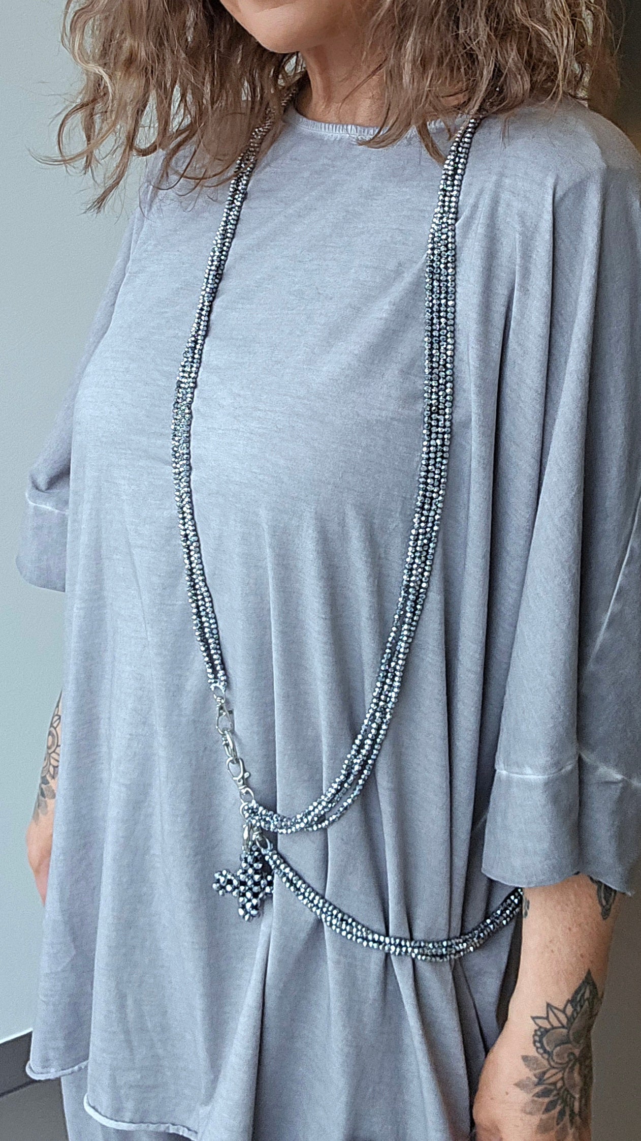 Et multifunksjonelt og dekorativt halskjede som kan styles på flere måter. Det kan brukes klassisk rundt halsen, rundt midjen, henges i belteløkker på jeans eller krysses i front for et mer edgy uttrykk. Smykket består av håndlagde perler i en tyngre og eksklusiv blinkekvalitet som gnistrer vakkert i lyset. Det har også en liten plu-merket henger som gir en ekstra gjennomført detalj.