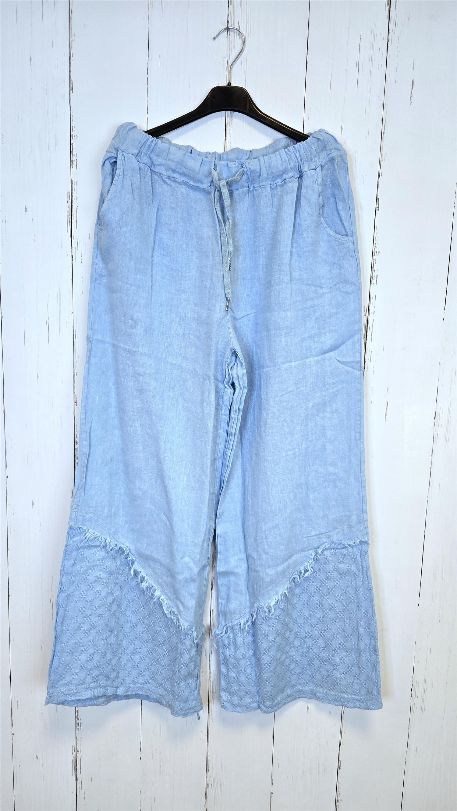 Lett og luftig bukse i 100 % lin med dekorativ blondedetalj nederst på bena. Modellen har strikk og knyting i livet som gir fleksibel og komfortabel passform. Stoffet faller fint og gjør buksen perfekt til vår- og sommersesongen.