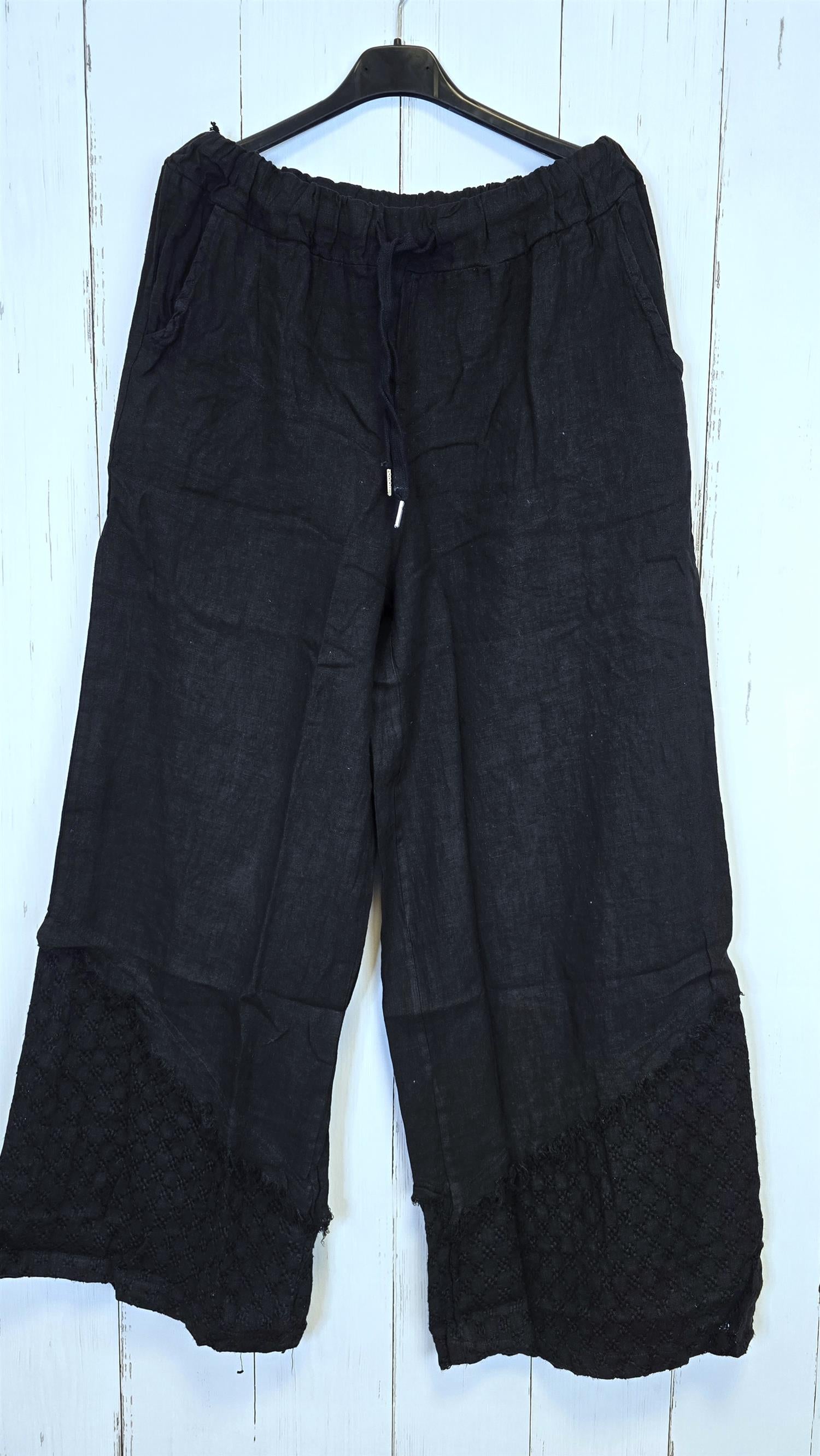 Lett og luftig bukse i 100 % lin med dekorativ blondedetalj nederst på bena. Modellen har strikk og knyting i livet som gir fleksibel og komfortabel passform. Stoffet faller fint og gjør buksen perfekt til vår- og sommersesongen.
