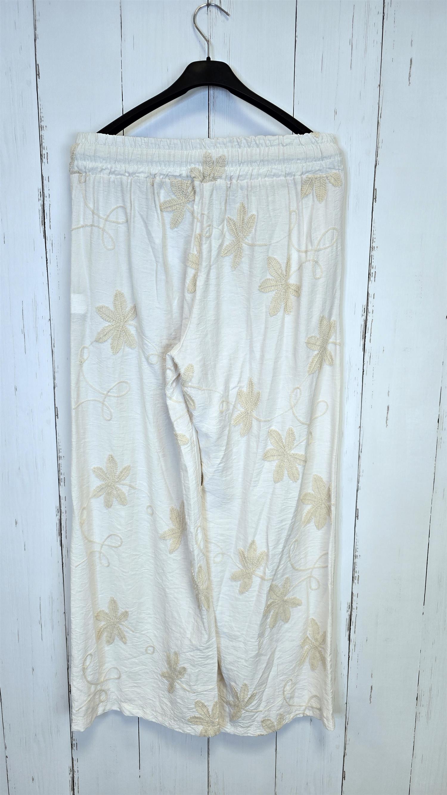 Lett og ledig bukse i myk kvalitet med broderte blomsterdetaljer ton-i-ton. Modellen har behagelig strikk i livet med justerbar knyting, som gir en fleksibel og komfortabel passform. Den faller rett ned og har en avslappet silhuett som gjør den perfekt til både hverdags og ferie.