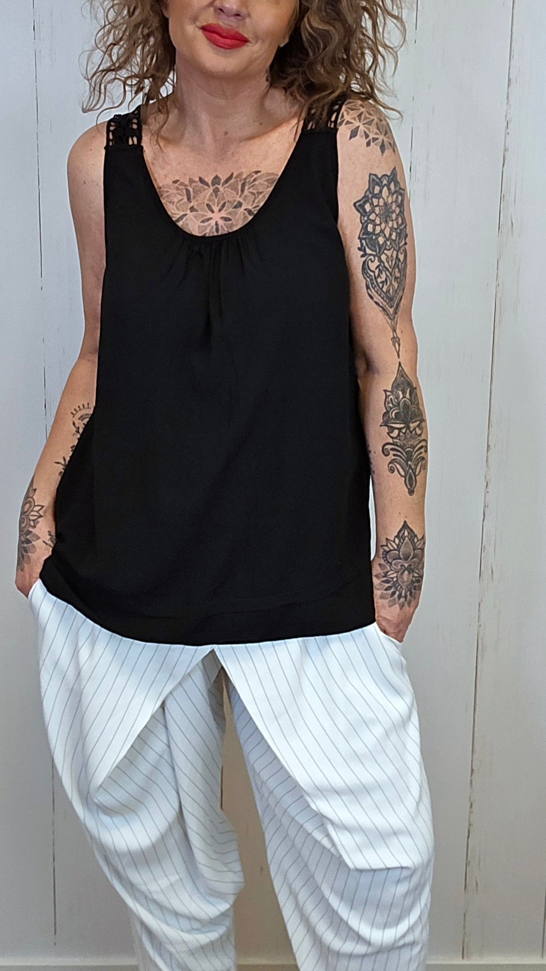 Lett og feminin topp med brede stropper og dekorativ blondedetalj over bryst og skuldre. Toppen har en løs og behagelig passform som faller fint på kroppen, og blondemønsteret gir plagget et elegant og sommerlig preg.