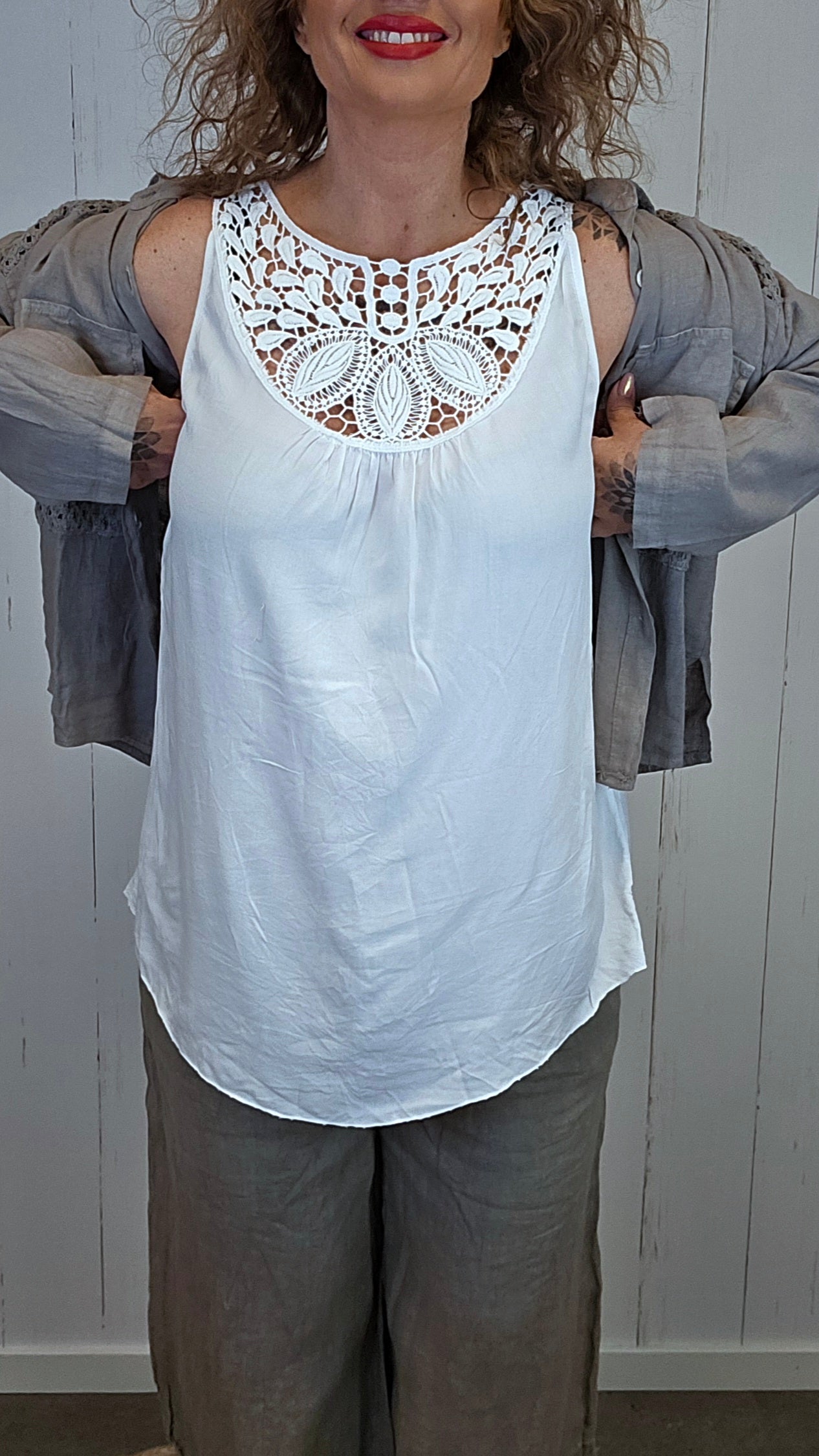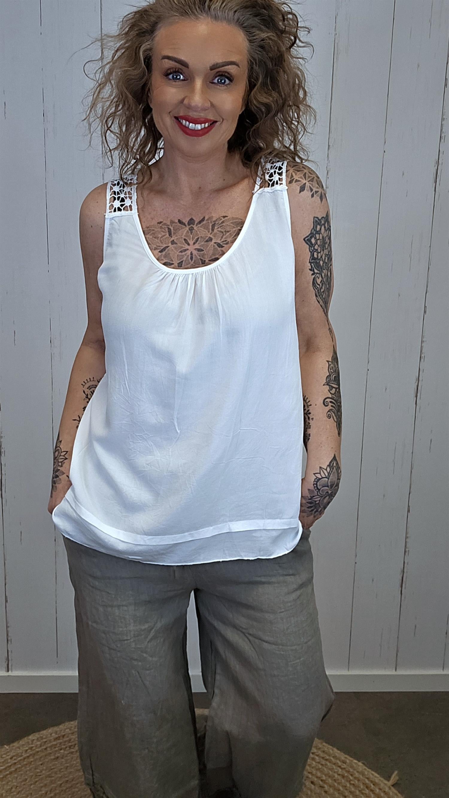 Lett og feminin topp med brede stropper og dekorativ blondedetalj over bryst og skuldre. Toppen har en løs og behagelig passform som faller fint på kroppen, og blondemønsteret gir plagget et elegant og sommerlig preg.