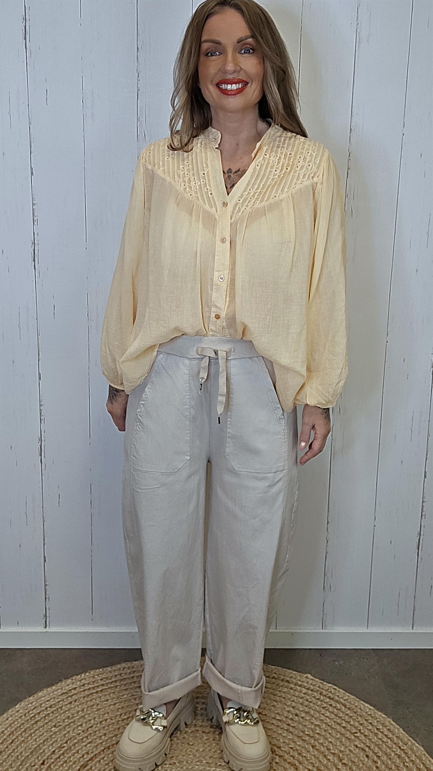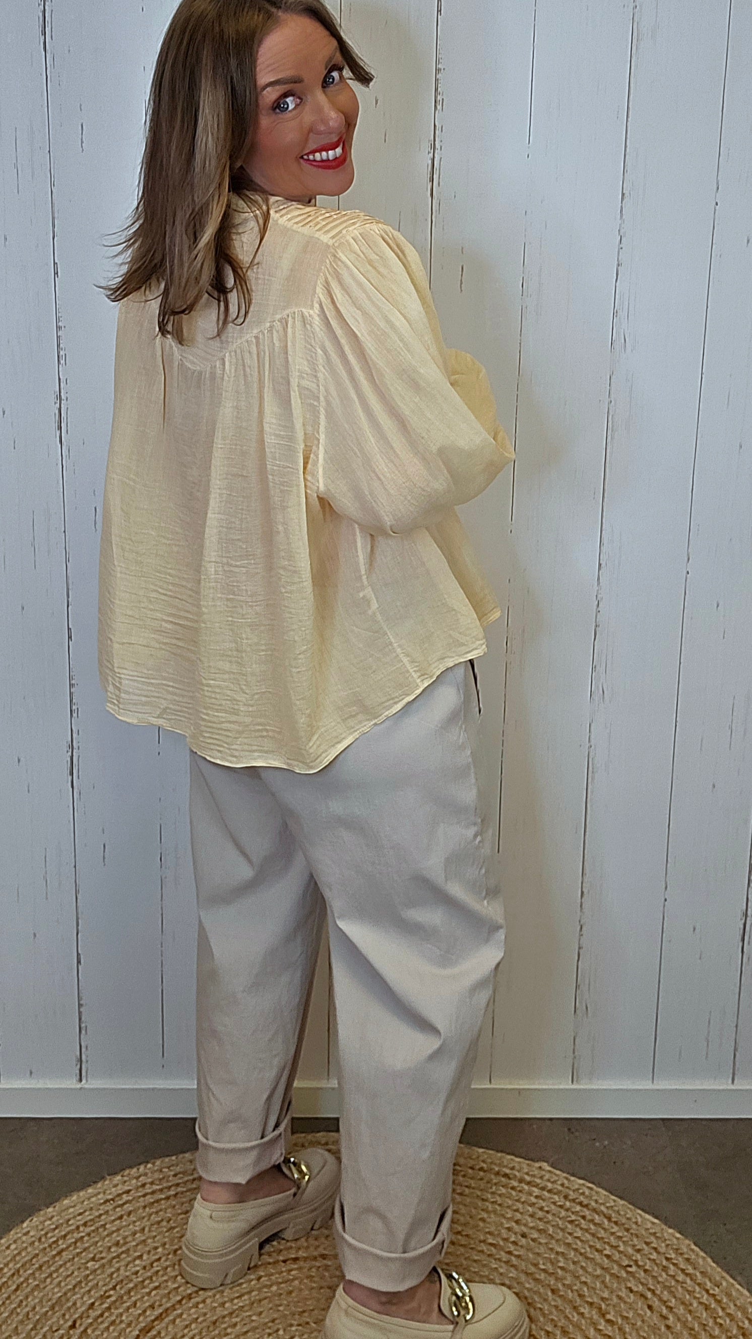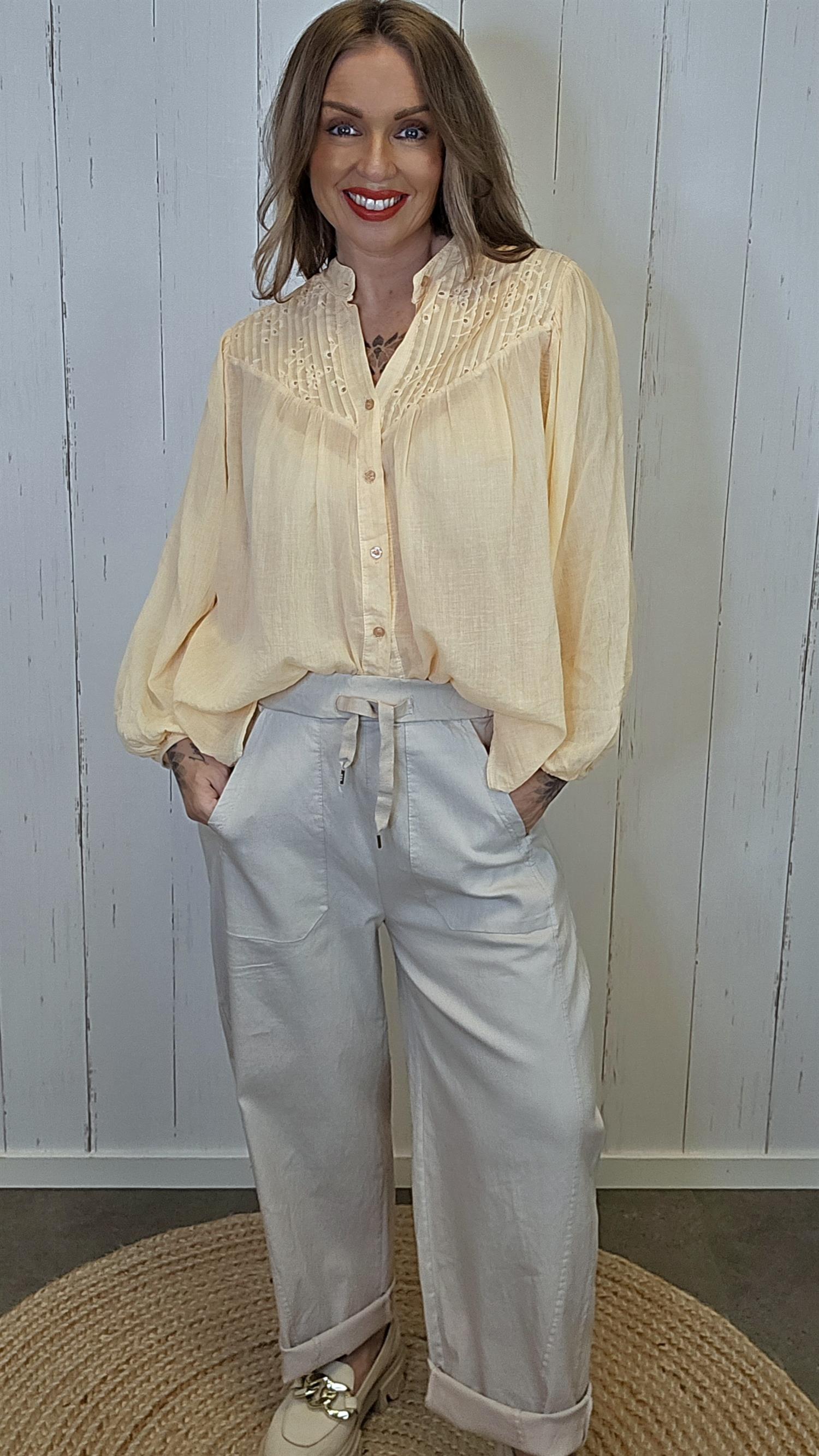 Lett og feminin skjorte i myk bomullskvalitet. Modellen har dekorative broderidetaljer og fine legg på brystet som gir et romantisk og elegant uttrykk. Skjorten har knapper i front og lange ermer med strikk nederst som gir en lett puffeffekt og god komfort.