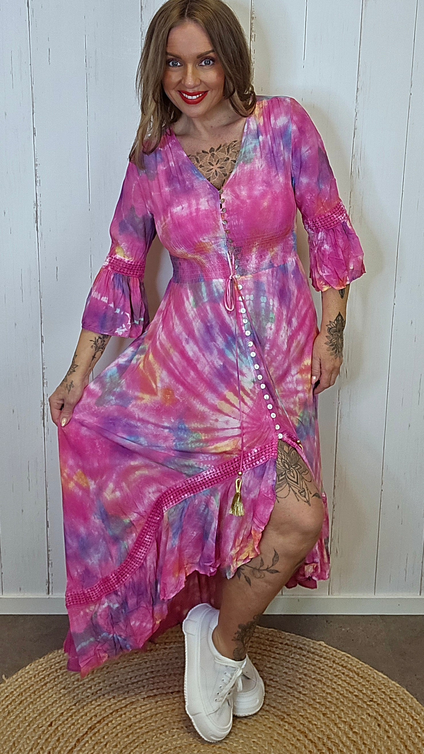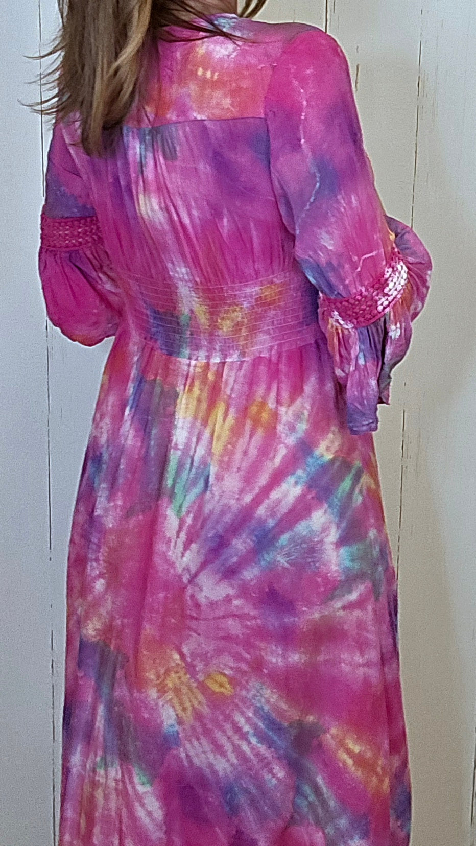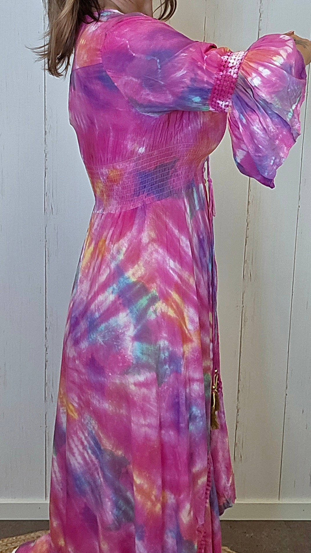 Fargerik og feminin kjole i myk viskose med et vakkert tie-dye mønster. Kjolen har v-utringning med knappestolpe i front og en elastisk smock i midjen som gir en flatterende og komfortabel passform. Ermene har dekorative detaljer og en lett vidde som gir et elegant uttrykk. Skjørtet faller fint og gir kjolen et luftig og bevegelig preg – perfekt til sommer, ferie og varme dager.