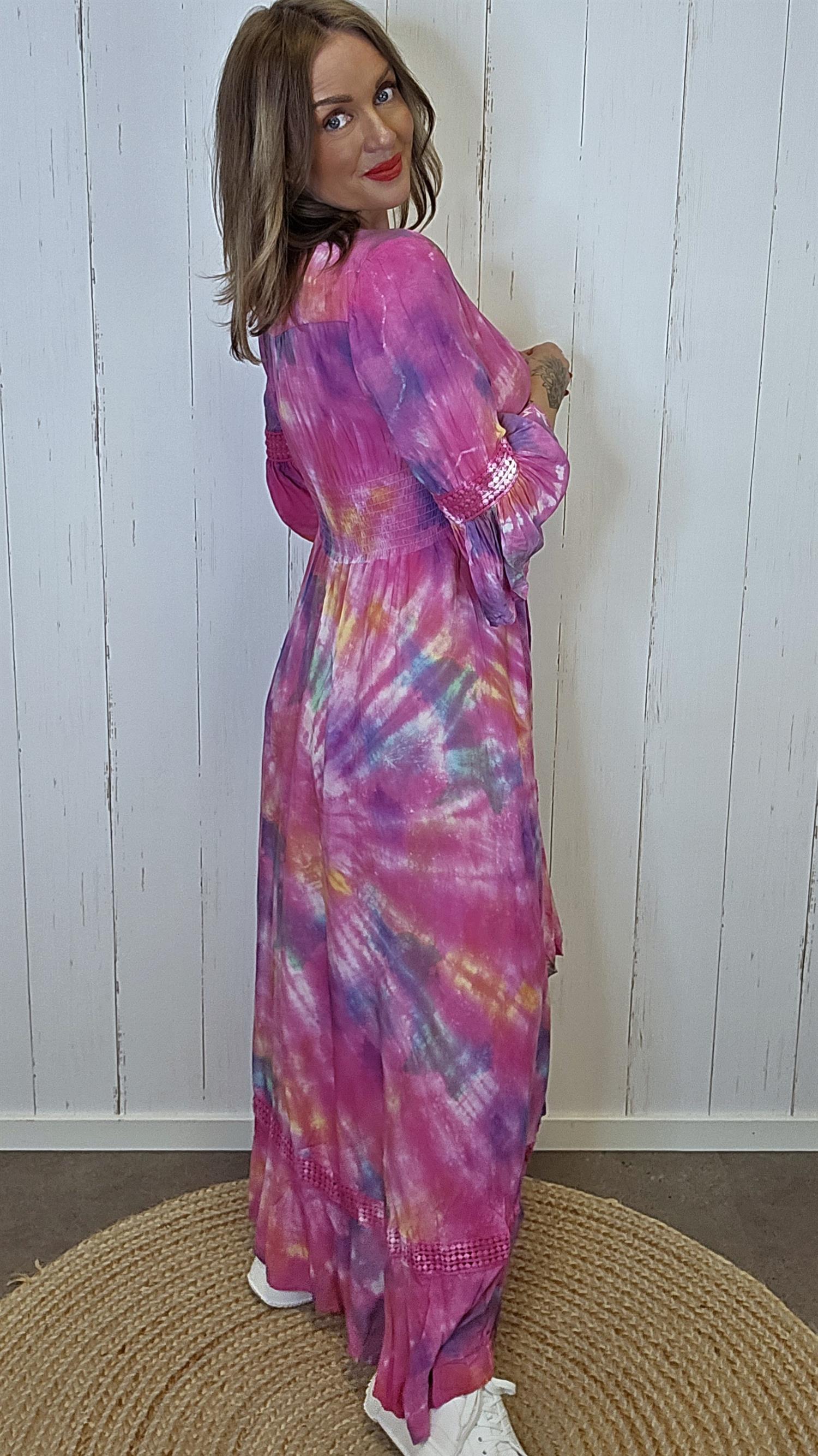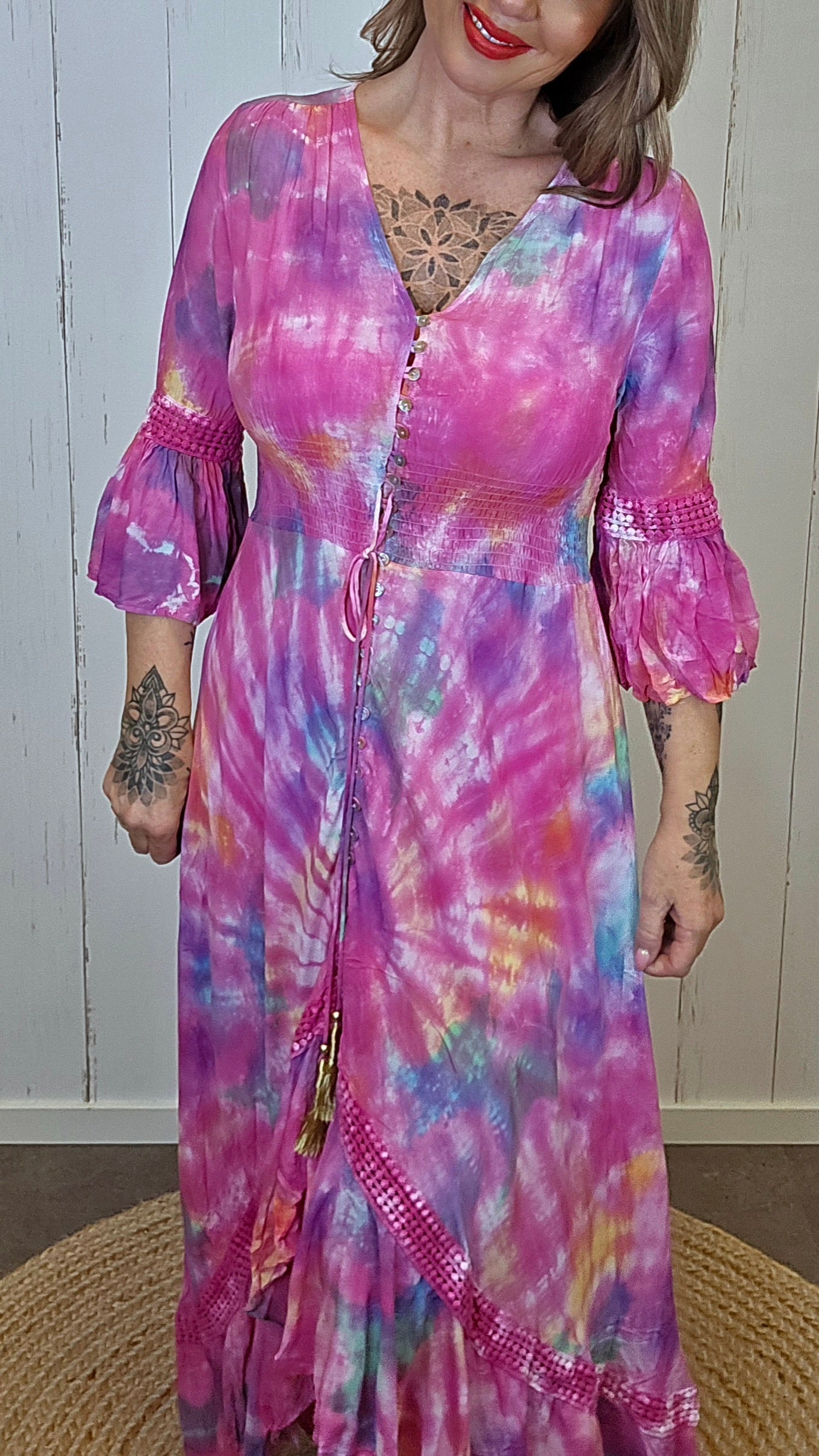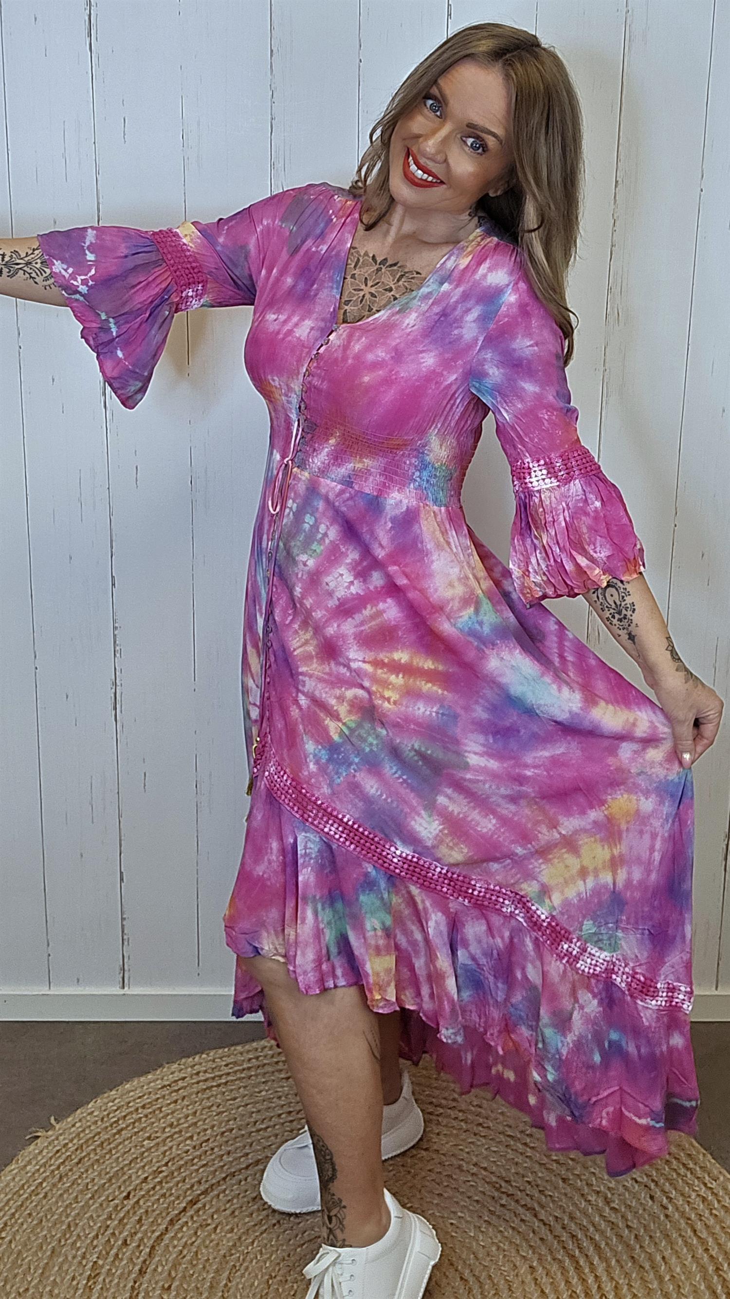 Fargerik og feminin kjole i myk viskose med et vakkert tie-dye mønster. Kjolen har v-utringning med knappestolpe i front og en elastisk smock i midjen som gir en flatterende og komfortabel passform. Ermene har dekorative detaljer og en lett vidde som gir et elegant uttrykk. Skjørtet faller fint og gir kjolen et luftig og bevegelig preg – perfekt til sommer, ferie og varme dager.