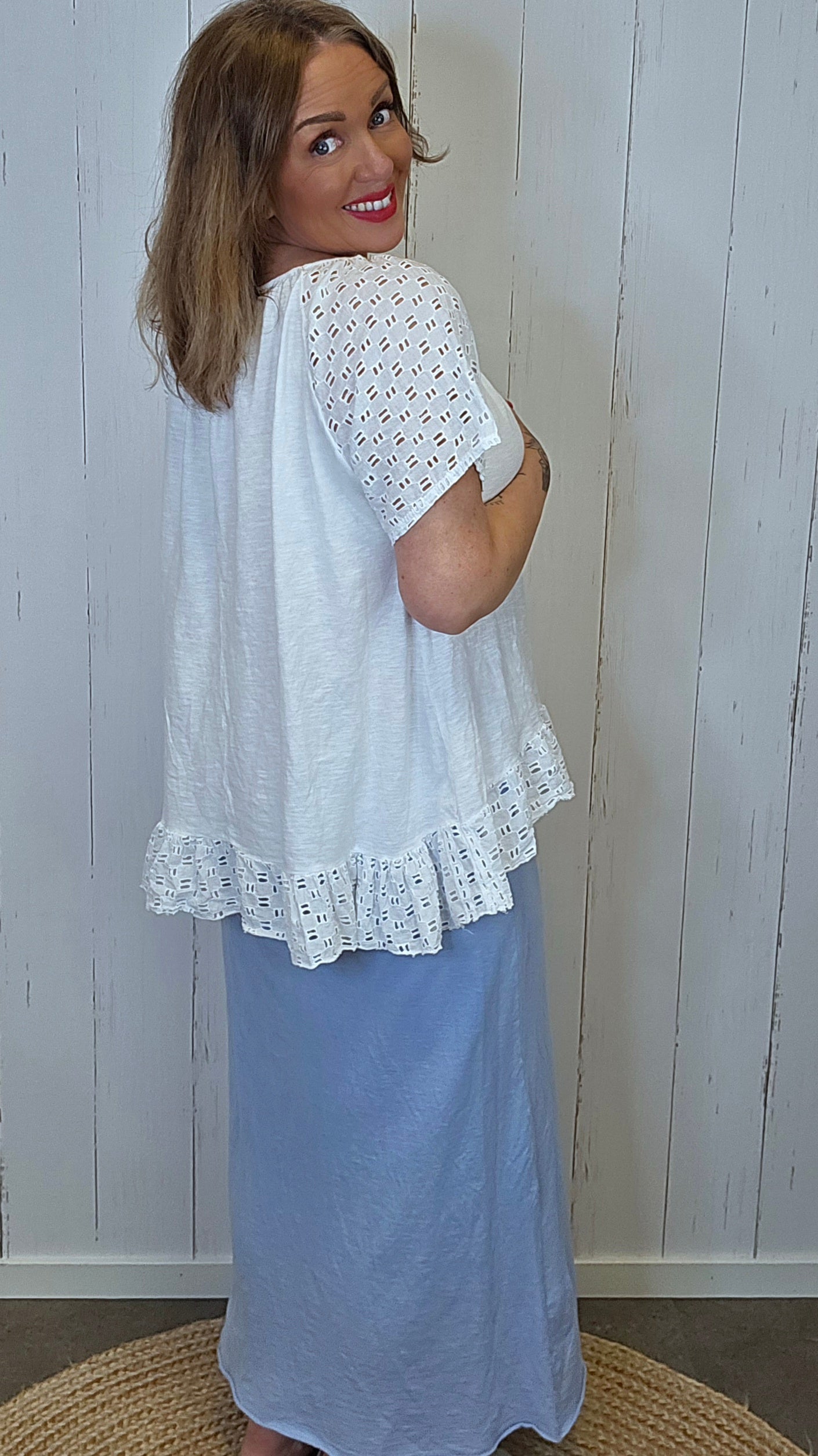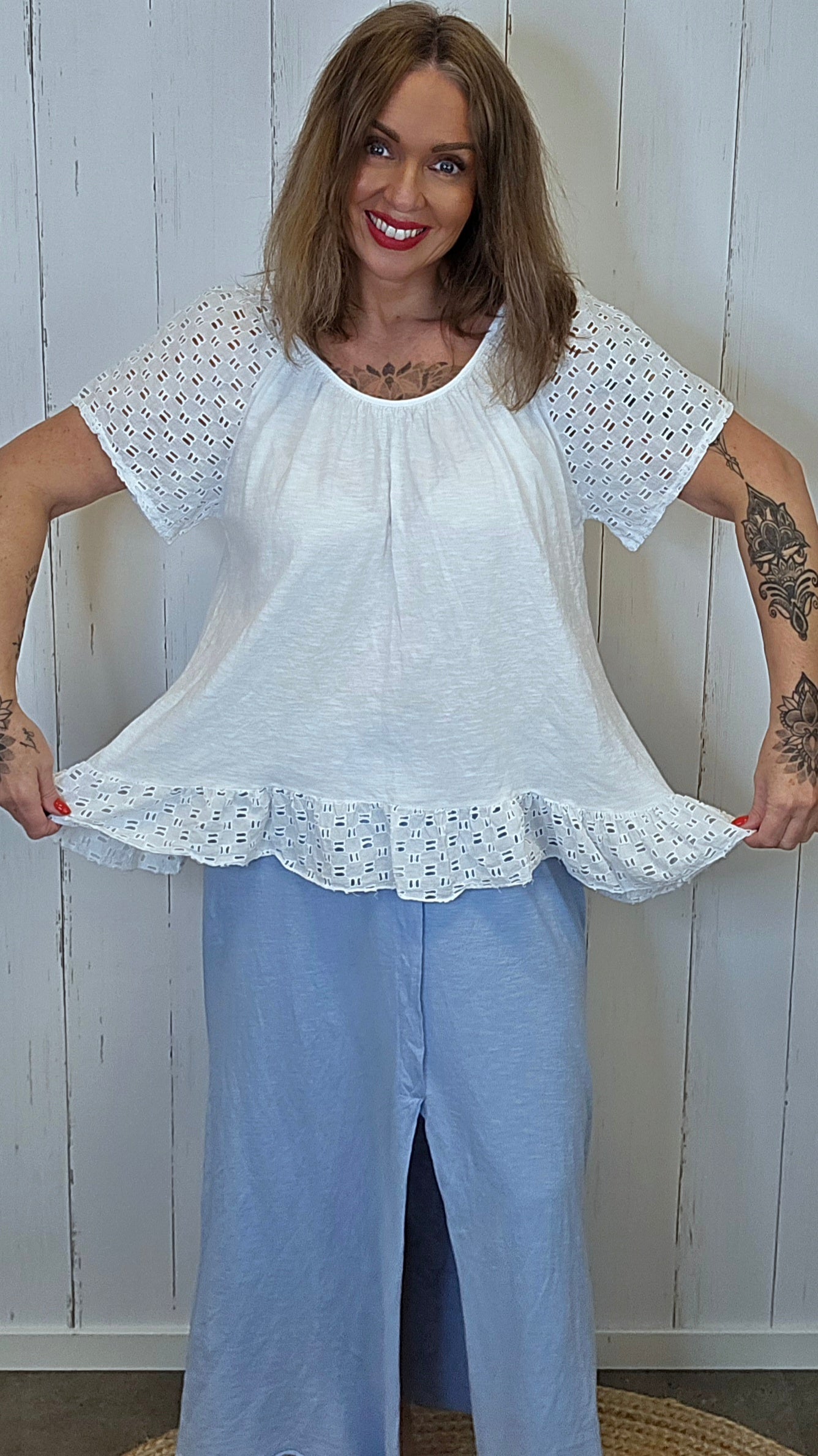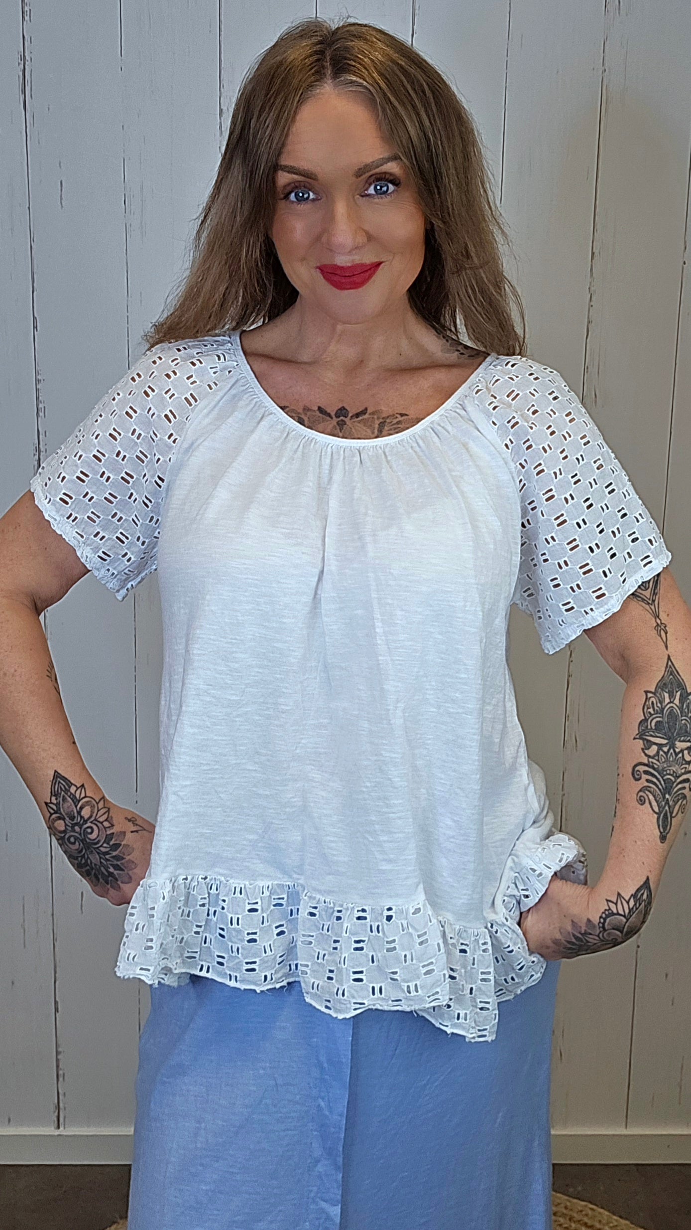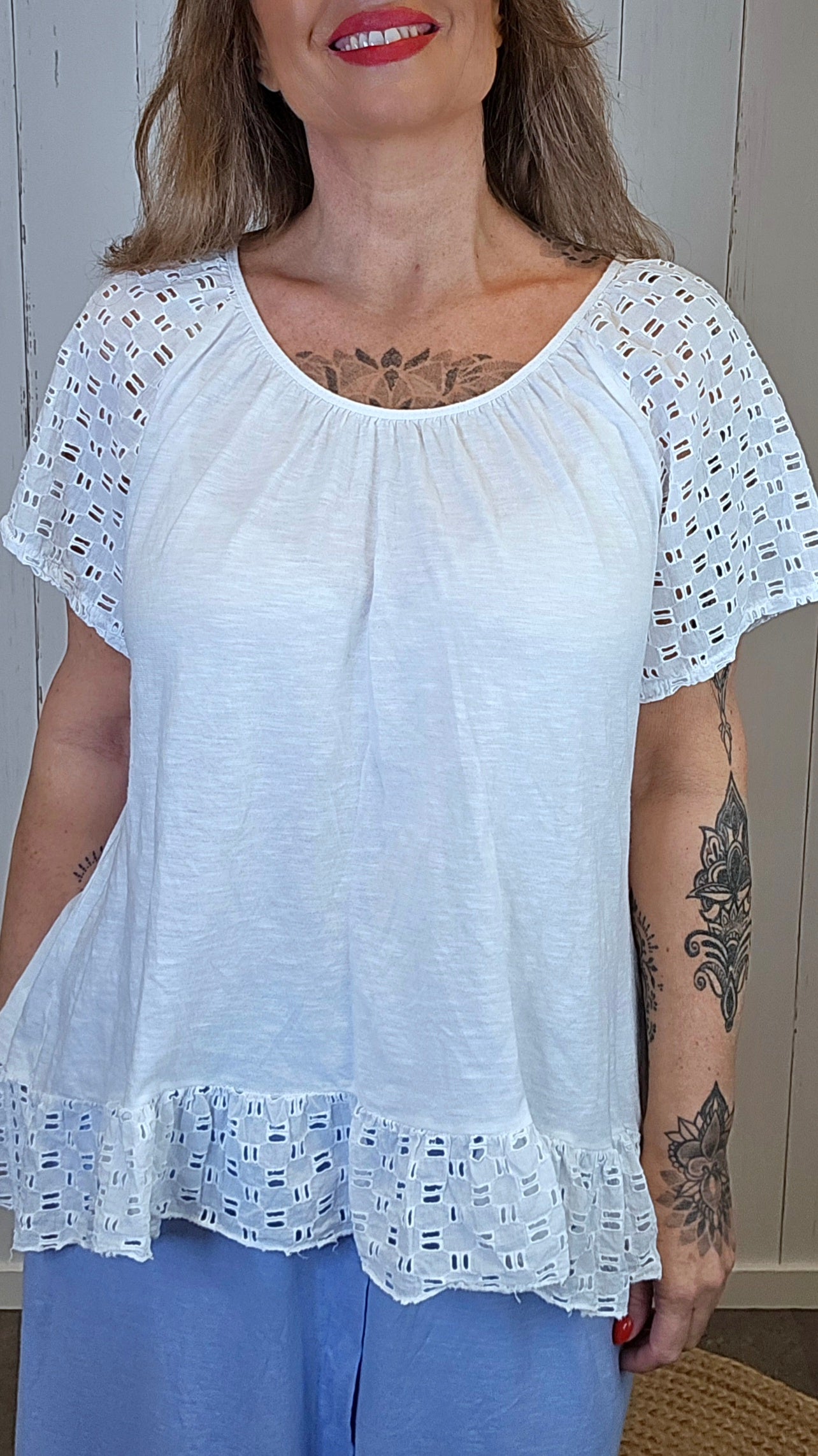 Lett og feminin topp i myk bomullskvalitet med delikate blondedetaljer. Modellen har en rund hals med lett rynking som gir en fin og avslappet passform. Ermene og kanten nederst er dekorert med mønstret blonde som tilfører et romantisk og elegant uttrykk. En luftig topp som passer perfekt til både hverdagsbruk og sommerlige antrekk.
