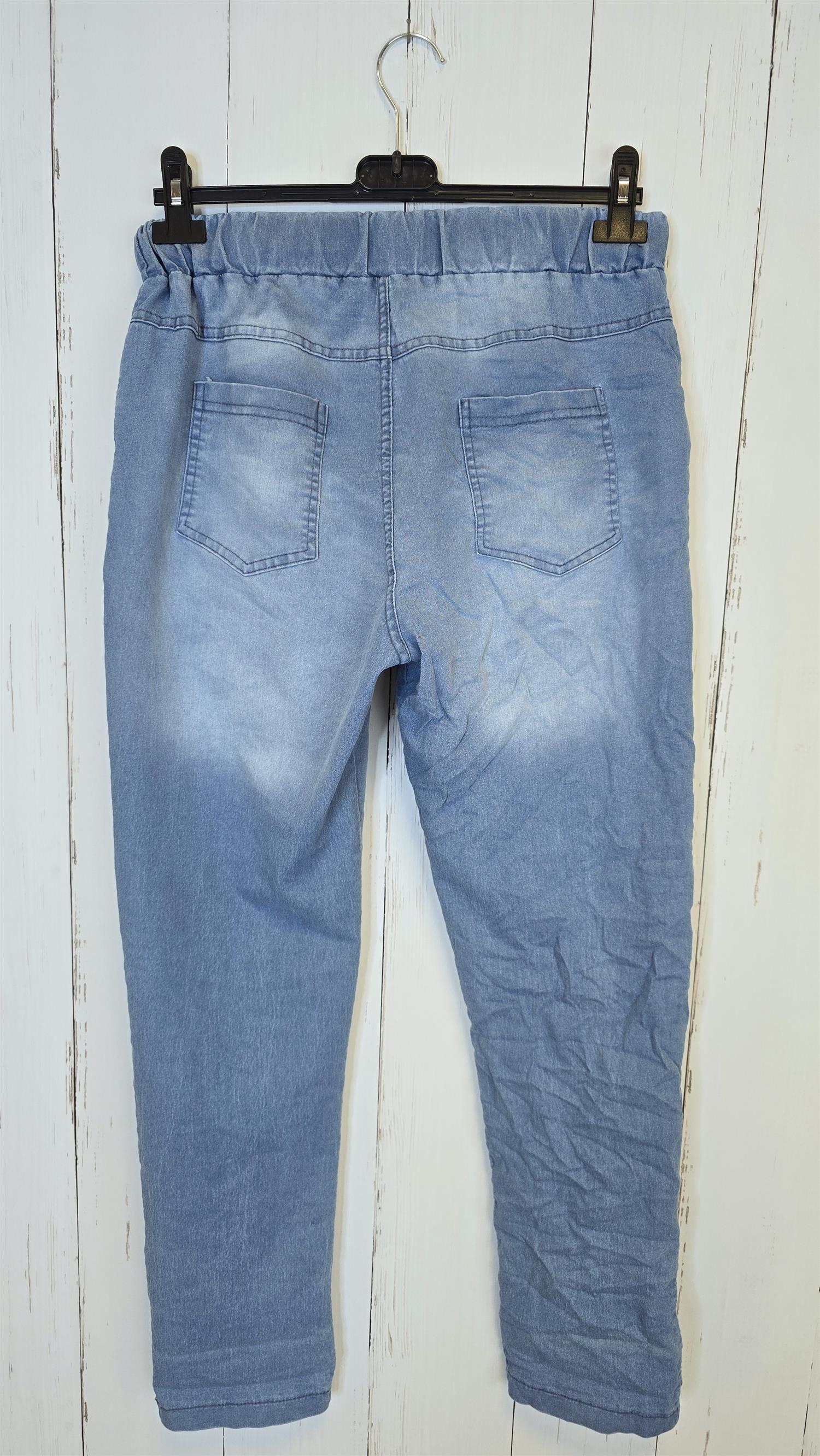 Trendy og komfortabel jeans i myk og lett stretchkvalitet med dekorative detaljer. Modellen har strikk og knyting i livet som gir en fleksibel og behagelig passform. Buksen har røffe slitte partier kombinert med feminine applikasjoner som gir et unikt og stilig uttrykk. Kan brettes opp nederst for en mer avslappet look. Perfekt til både hverdagsbruk og casual antrekk.