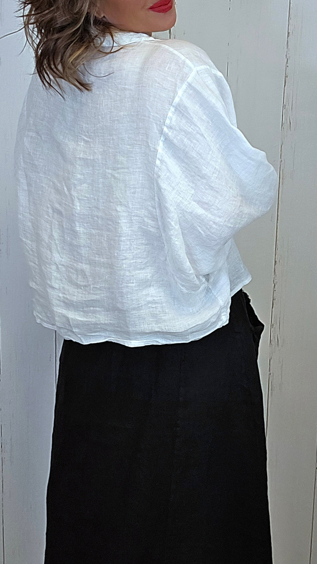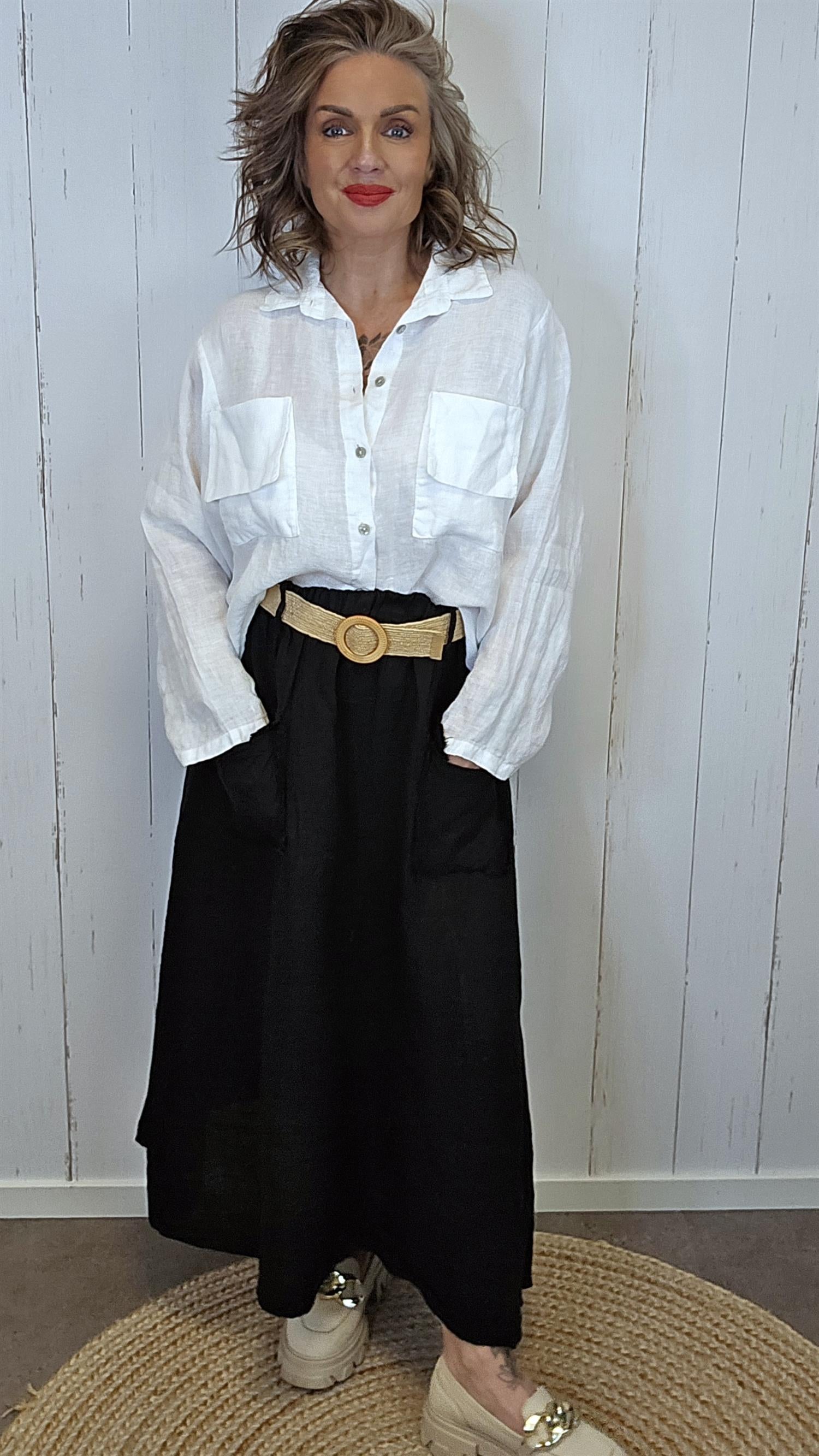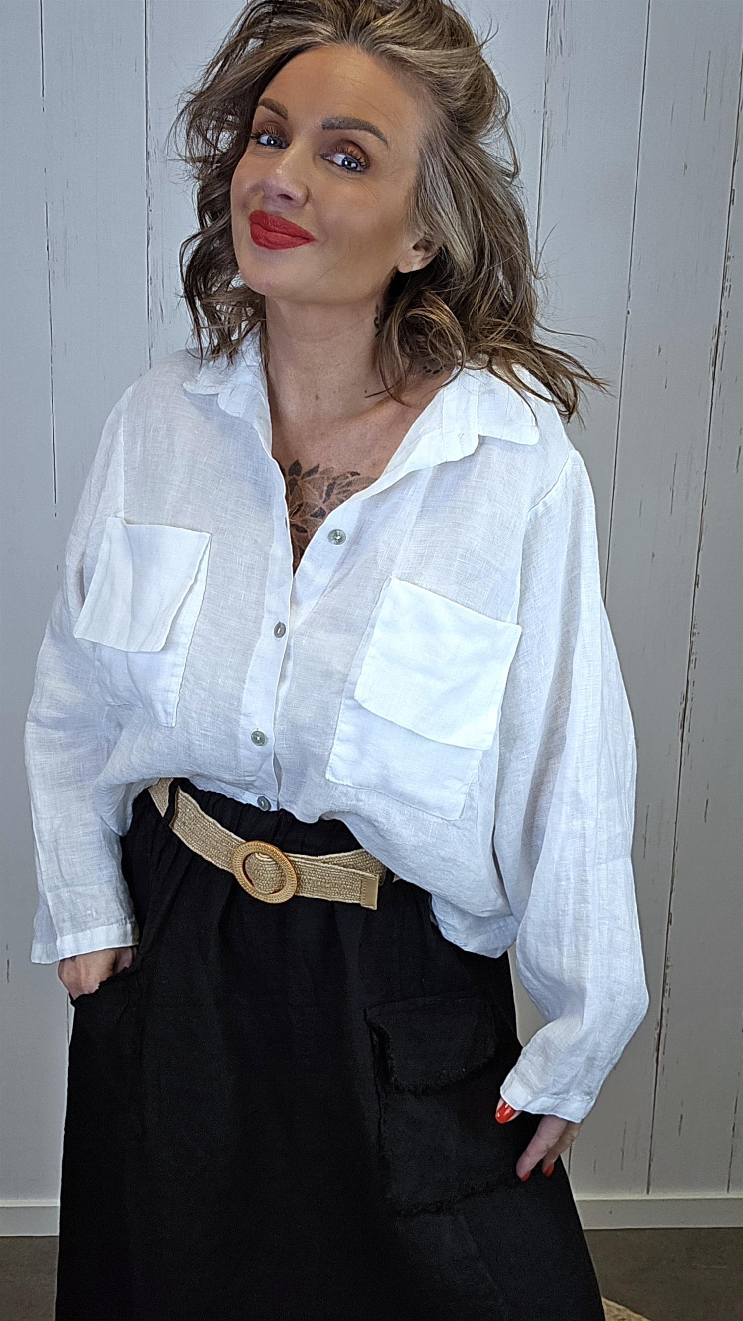 Kort og moderne linskjorte med en avslappet og trendy fasong. Skjorten har store frontlommer som gir et røft og stilrent uttrykk, kombinert med klassisk krage og knapper i front.