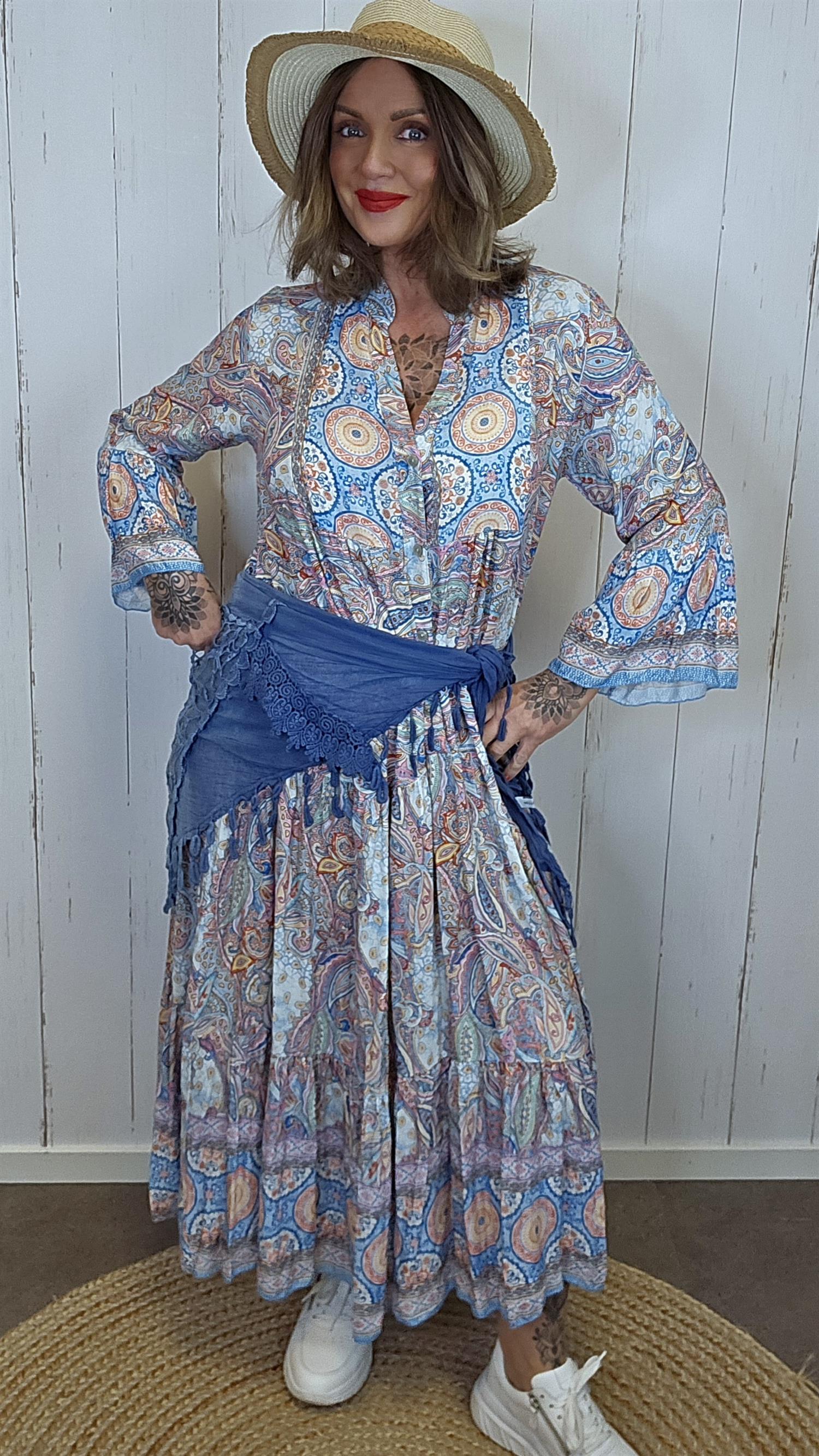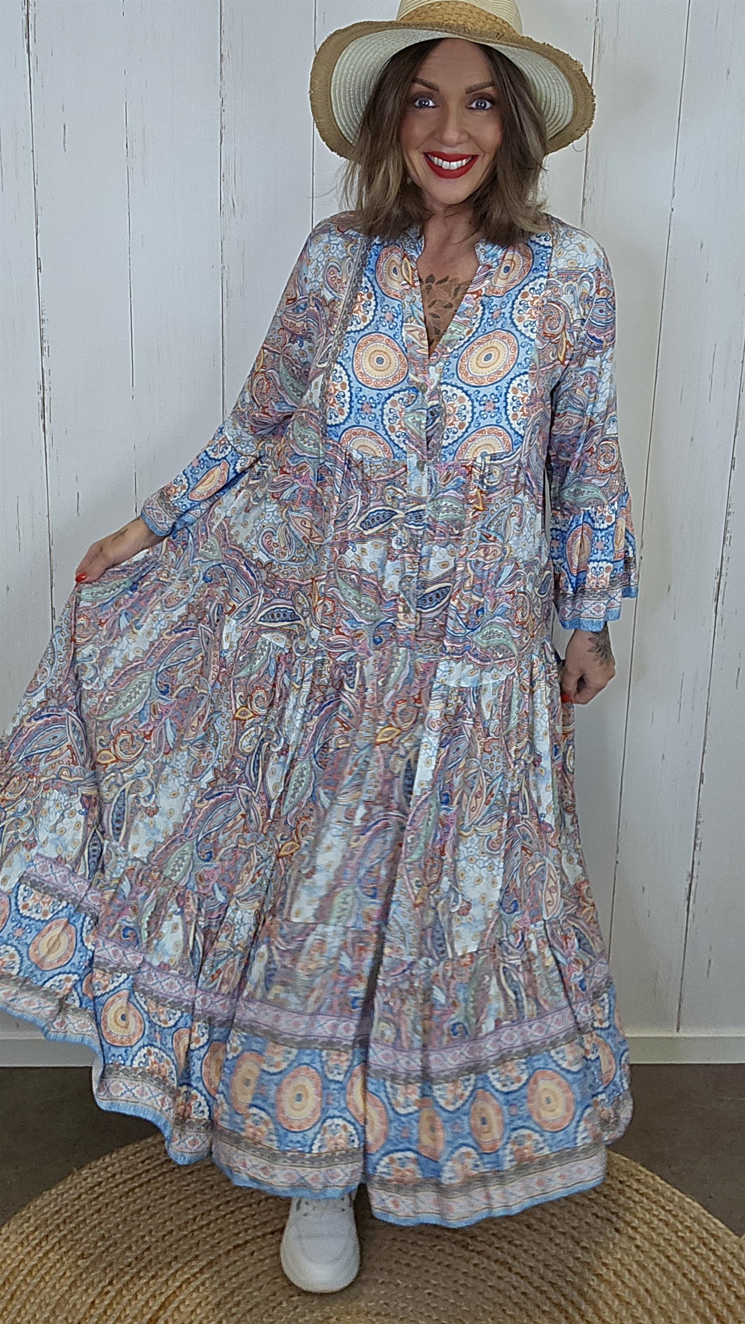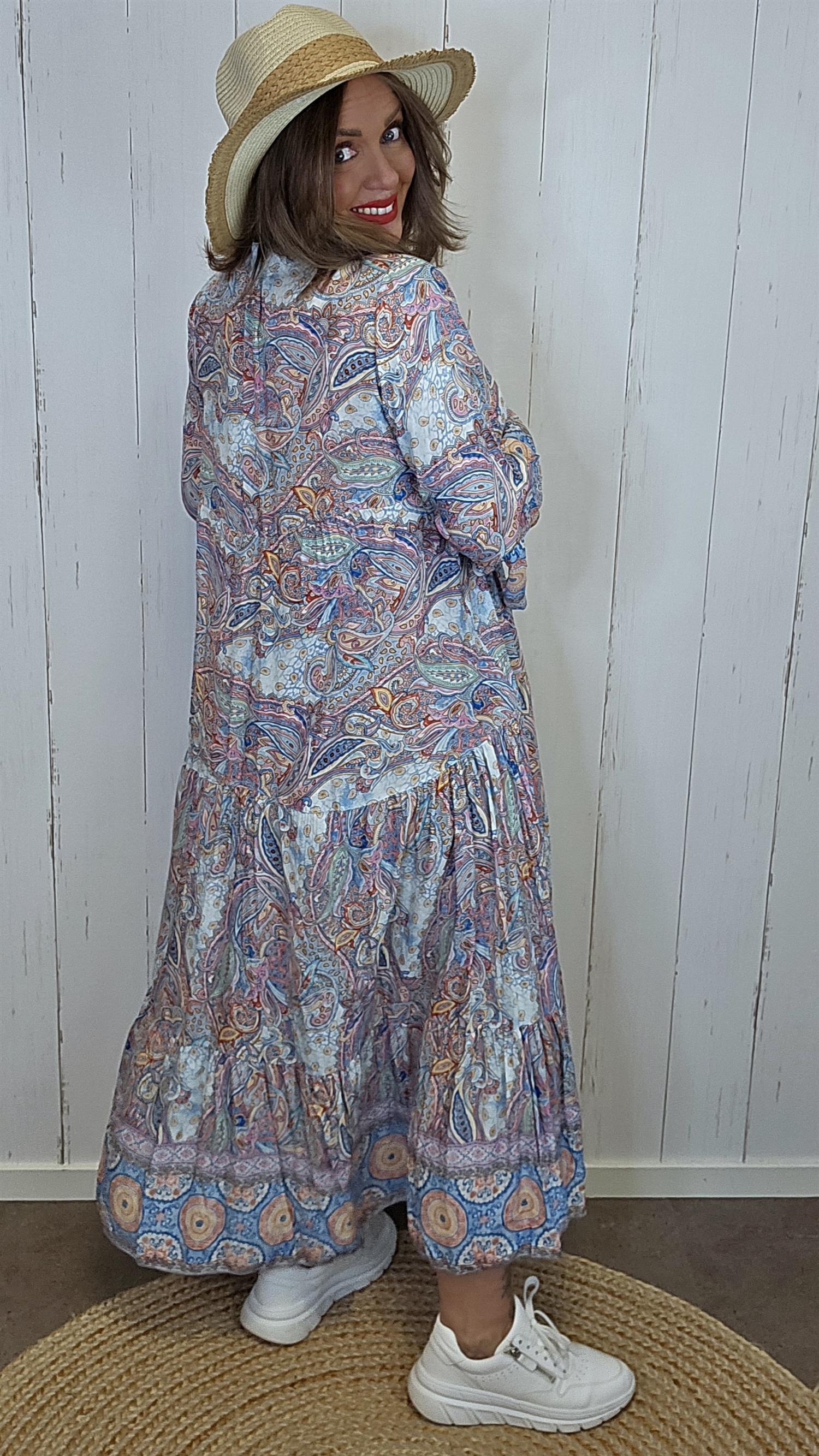 Nydelig kjole med et detaljrikt paisleymønster som gir et bohemsk og eksklusivt uttrykk. Kjolen har lange ermer og en feminin V-utringning med knapper i front. Den markerte midjen med lett rynking gir en flatterende fasong, mens det luftige skjørtet skaper fin bevegelse. En perfekt kjole til både hverdagsbruk og sommerlige anledninger.